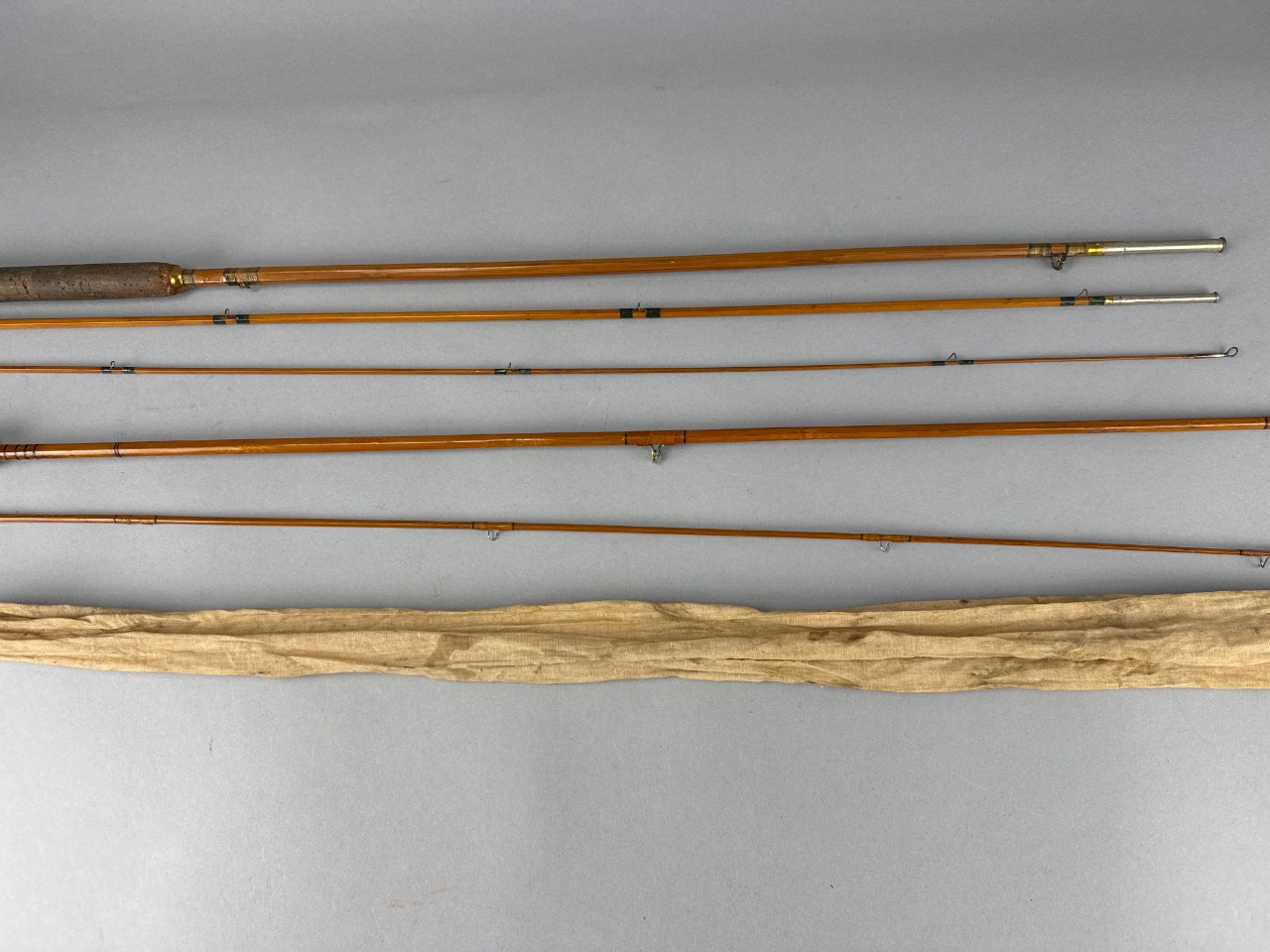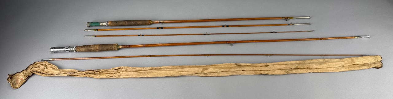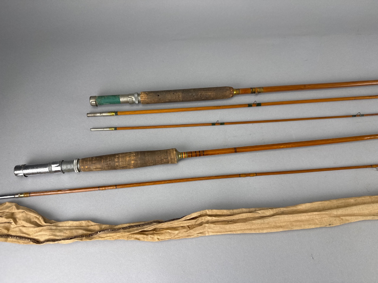 Two bamboo fishing rods with fabric cover. The rods feature bamboo construction with metal guides, one with a cork handle and metal reel seat, and the other with a green end cap. Accompanied by a fabric cover. CONDITION: The cork handle shows some wear. The fabric cover exhibits signs of age and wrinkling. SHIPPING: In-House Shipping Available