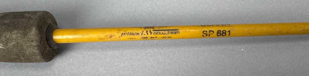 Two vintage fiberglass fishing rods, including a Browning Silaflex Model 922980 fly fishing rod, measuring 8 feet (244 cm) in length and weighing 3.3 oz (103 gm), and a Fenwick Woodstream SP 681 rod with a yellow shaft, cork grip, and metal reel seat. Both rods feature visible maker markings and are constructed with fiberglass shafts, cork grips, and metal reel seats. CONDITION: Both rods show minor wear on the grips and light surface scratches on the shafts. SHIPPING: In-House Shipping Available