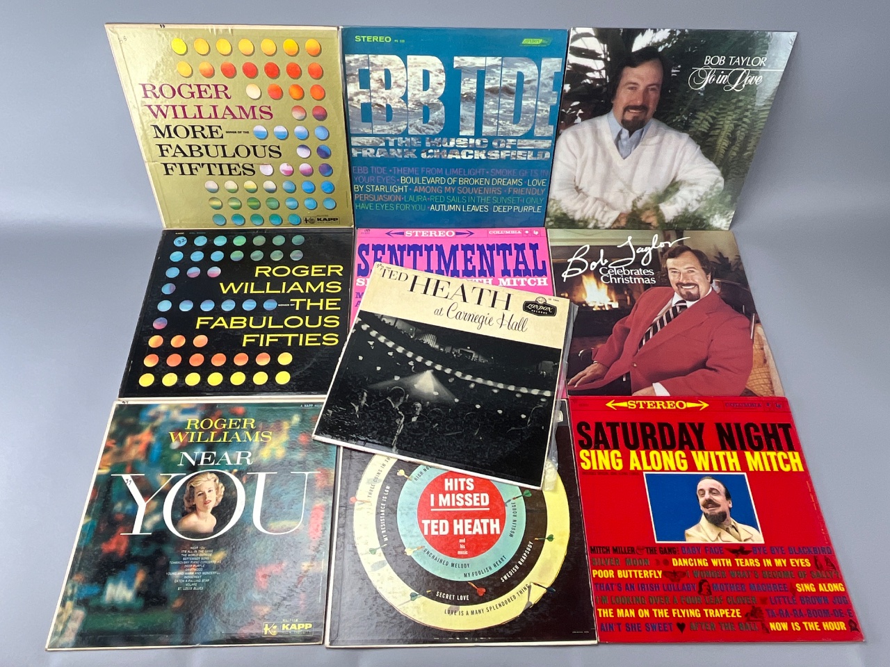 Collection of ten vinyl record albums featuring various artists and titles, including ‘Roger Williams More – Fabulous Fifties’, ‘BB Tide’, ‘Bob Taylor You’re Alive’, ‘Roger Williams – The Fabulous Fifties’, ‘Sentimental at Carnegie Hall’, ‘Hits I Missed Ted Heath’, ‘Roger Williams Near You’, and ‘Saturday Night Sing Along with Mitch’. Likely mid-1950s to early 1960s era LPs, primarily easy listening and pop genres. CONDITION: Some visible wear on album covers. No visible scratches on the records themselves. SHIPPING: In-House Shipping Available