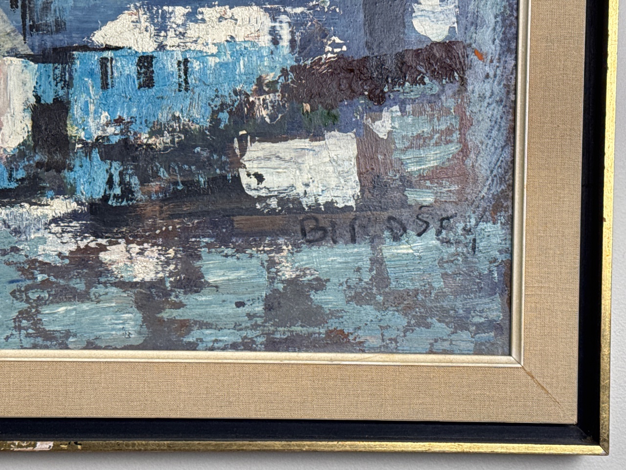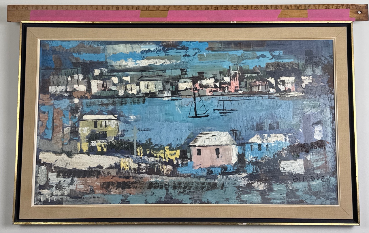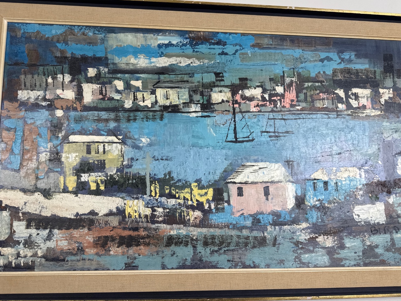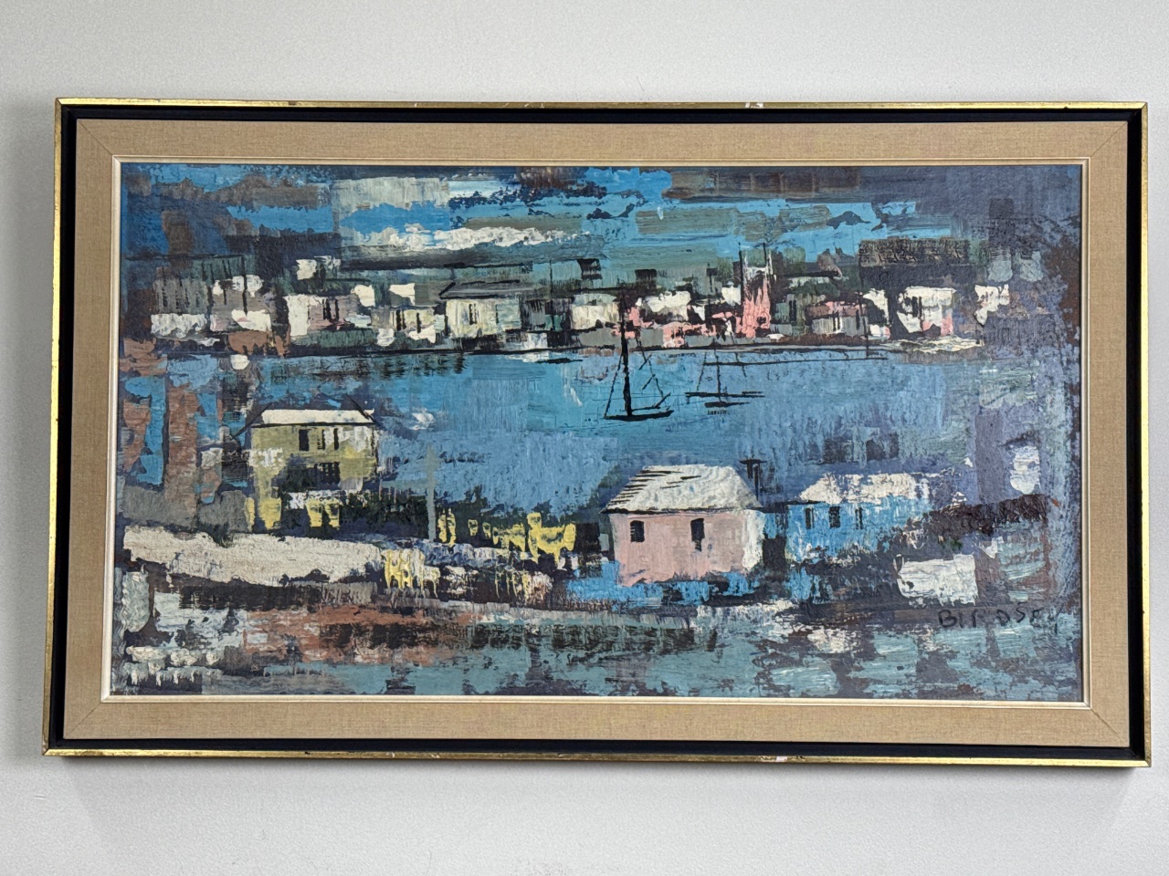 Framed oil on canvas painting depicting a coastal scene with houses, boats, and a blue sky, signed lower right ‘BIRDSEY’. The work features colorful buildings and water, characteristic of coastal landscapes. Measures about 34″ wide. CONDITION: Condition not assessed. SHIPPING: In-House Shipping Available