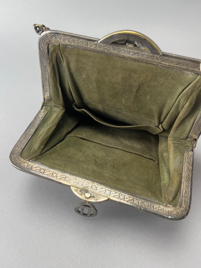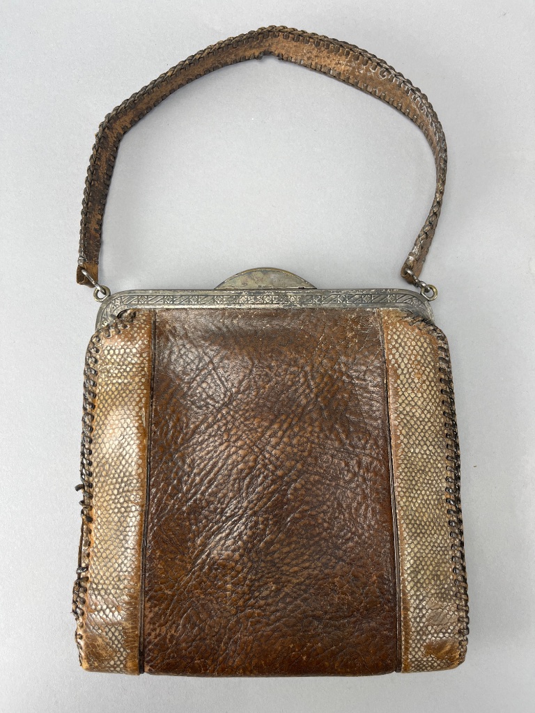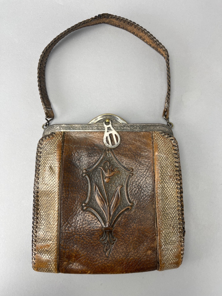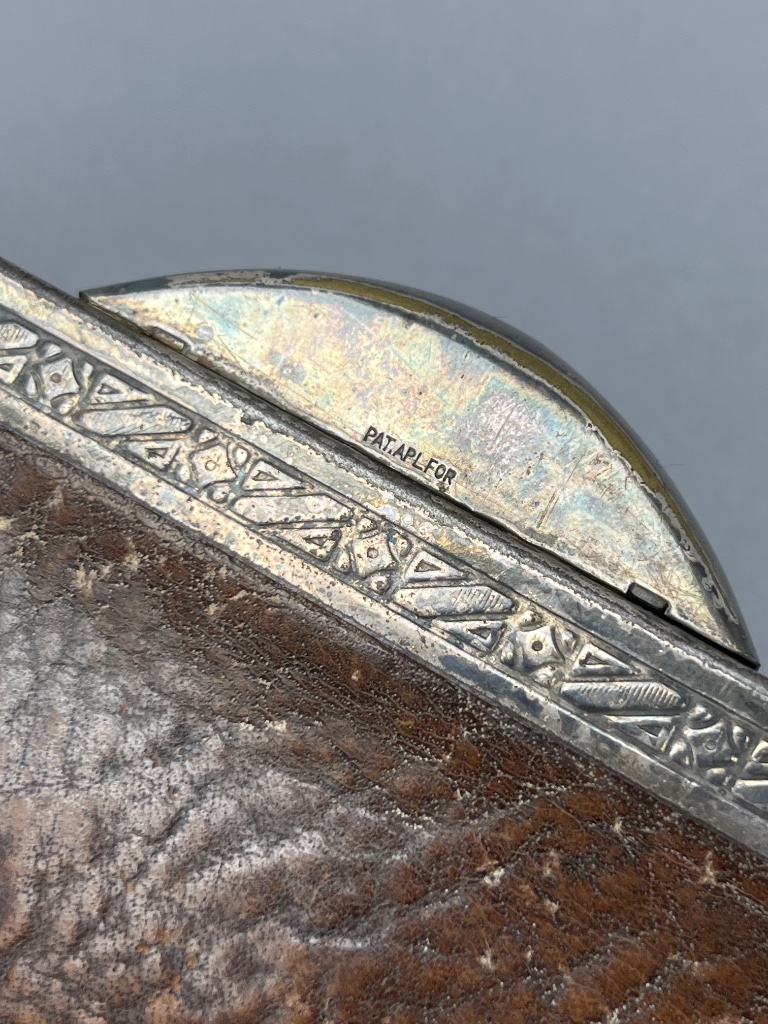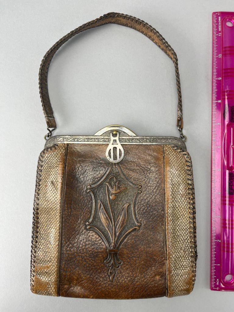 Rectangular leather handbag featuring a textured floral design and a decorative metal clasp with a floral motif. The clasp bears the text ‘PAT. APL. FOR,’ indicating a patent application. The handbag includes a braided handle, a metal frame with engraved patterns, and an interior lined with green fabric. Measures about 12″ long. CONDITION: Some wear to the leather surface and signs of age on the interior fabric. SHIPPING: In-House Shipping Available