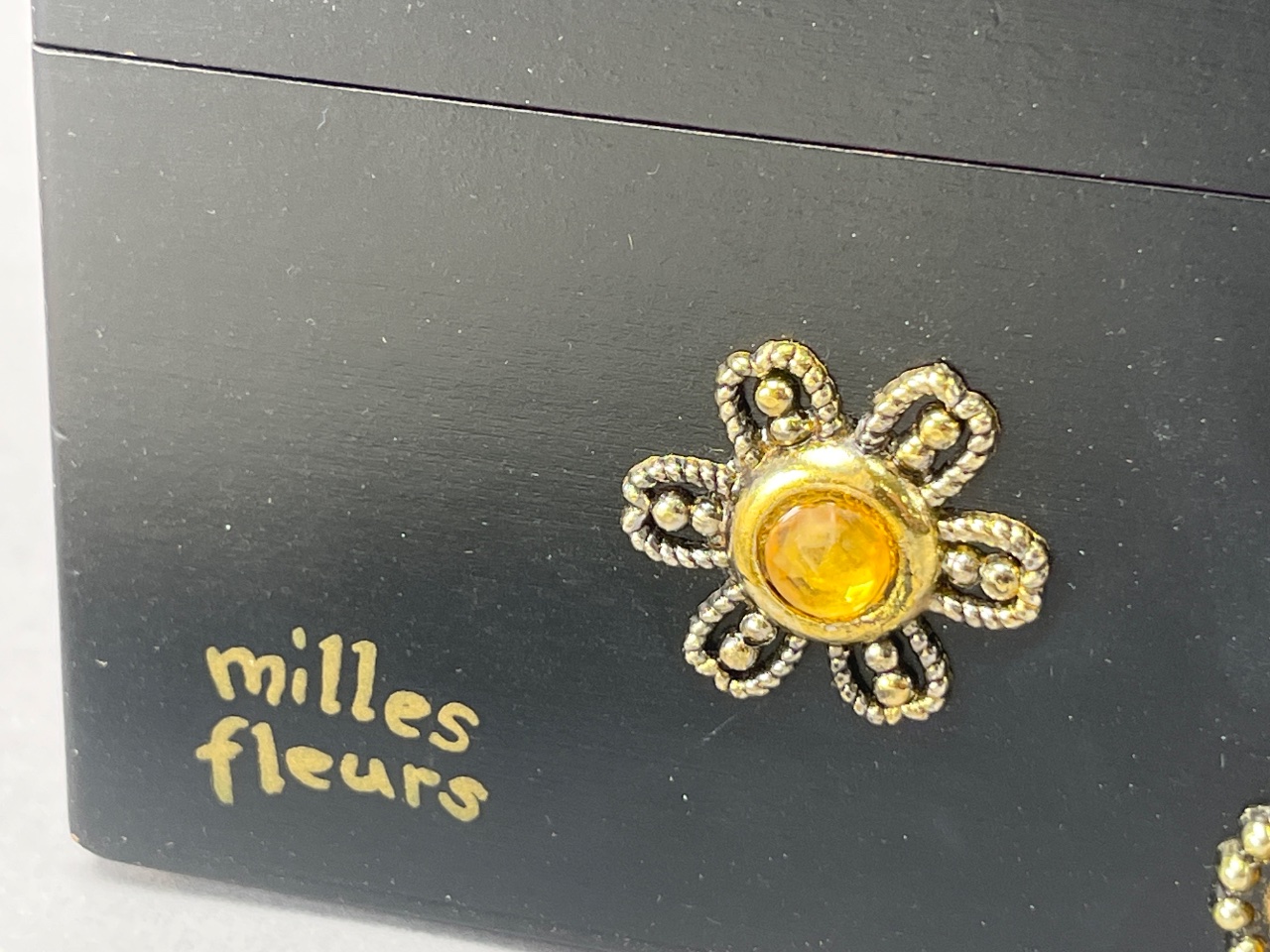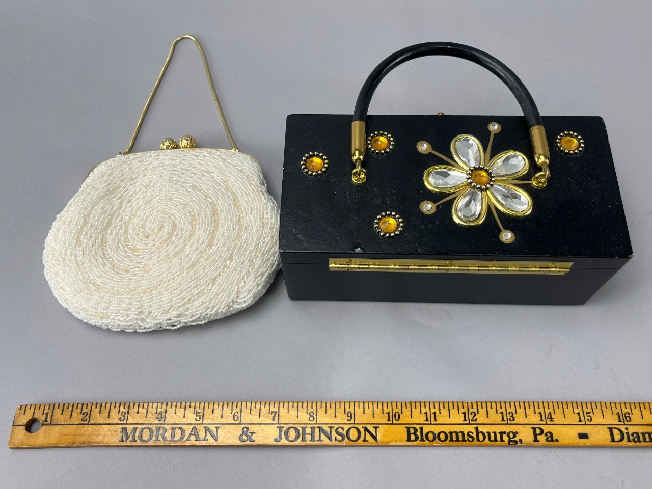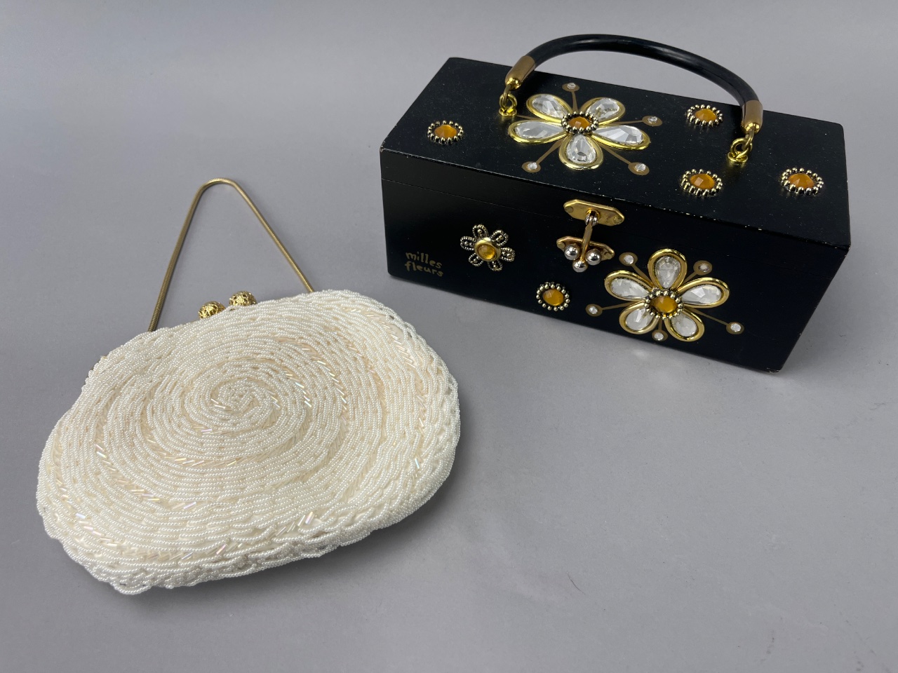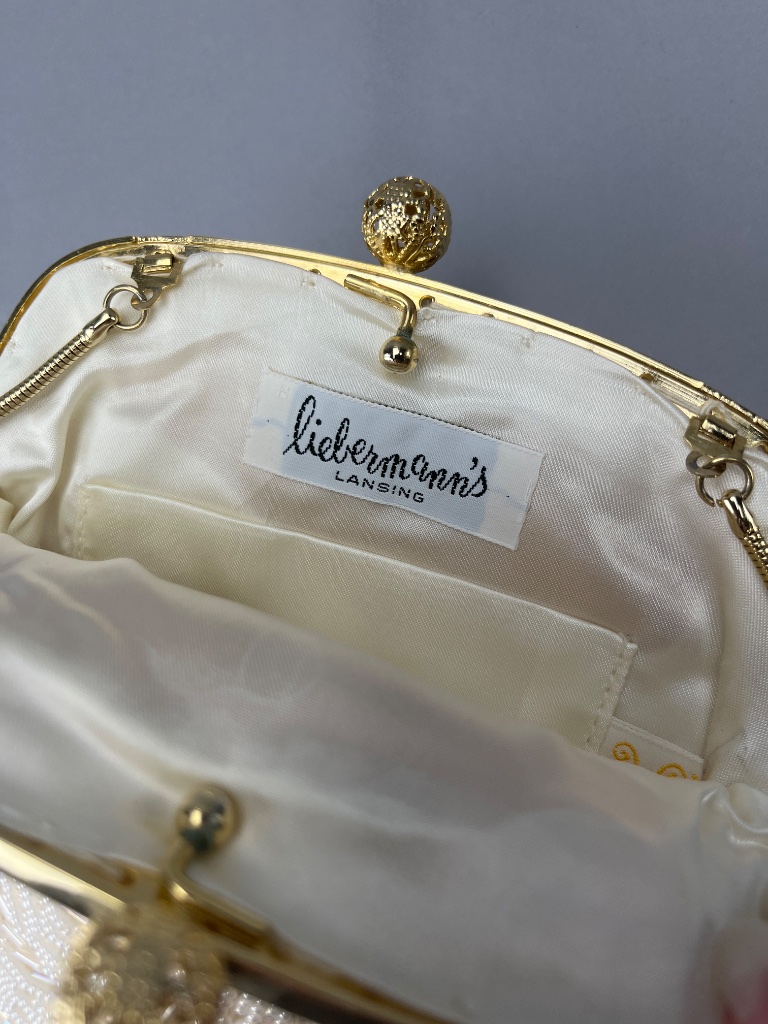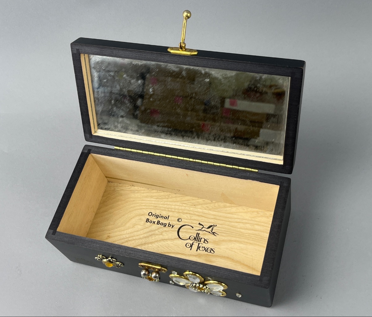 Black wooden box purse by Collins of Texas, model ‘Milles Fleurs,’ featuring floral decorations with yellow and clear stones. The interior includes a mirror. Accompanied by a white beaded handbag with a spiral design, marked ‘Liebermann’s LANSING,’ and a gold-tone frame. Black wooden box purse measures about 9″ wide. CONDITION: Some wear visible on the mirror inside the black box purse. No significant damage observed on either item. SHIPPING: In-House Shipping Available