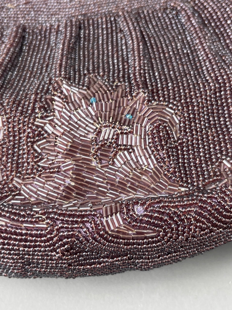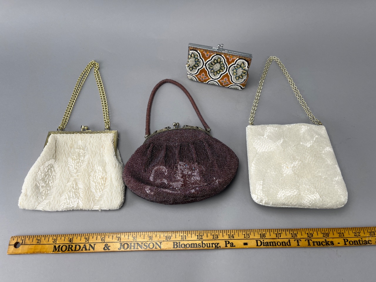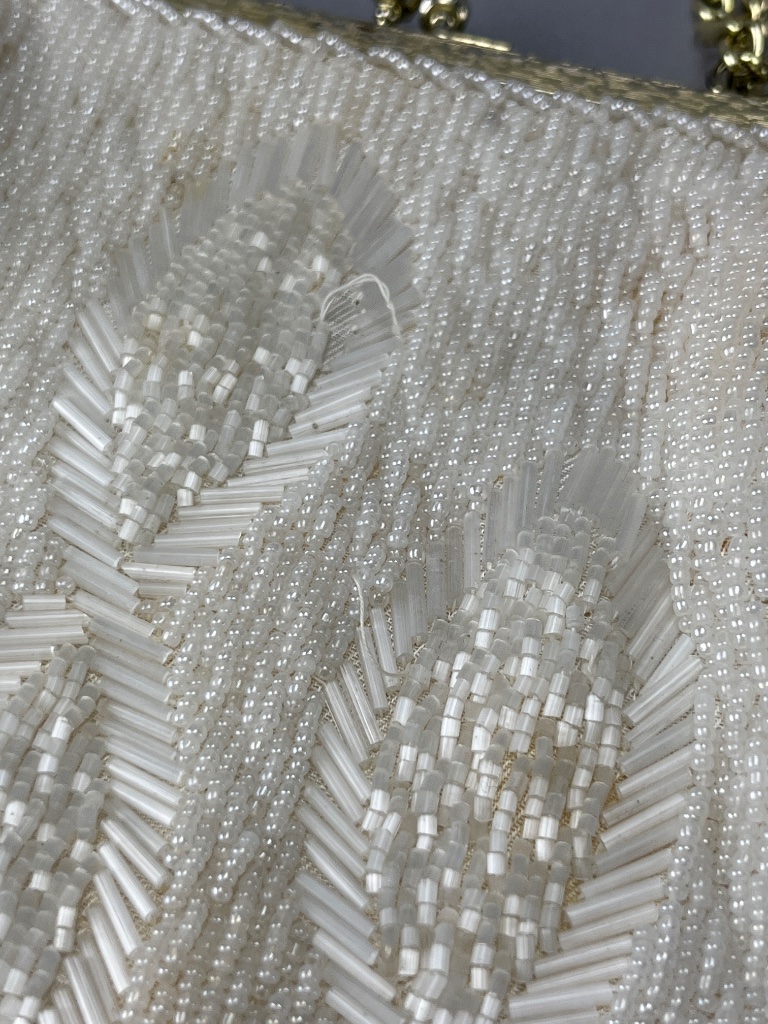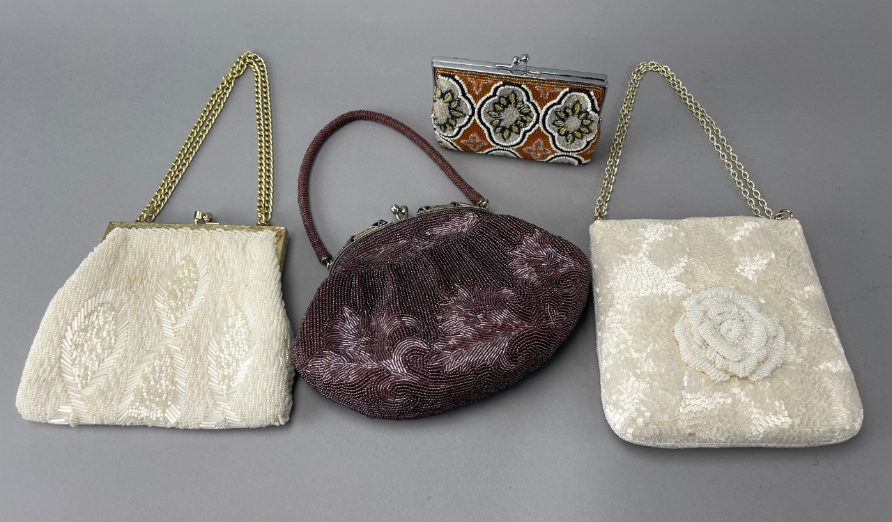 Grouping of four beaded handbags featuring various designs, including a white handbag with a floral pattern, a maroon handbag with a floral beaded design, a white handbag with a raised flower decoration, and an orange and black handbag with a clasp. These handbags showcase intricate beadwork and vintage-style construction. Largest bag measures about 7″ wide. CONDITION: 2 bags have some wear shown in last 2 photos. SHIPPING: In-House Shipping Available