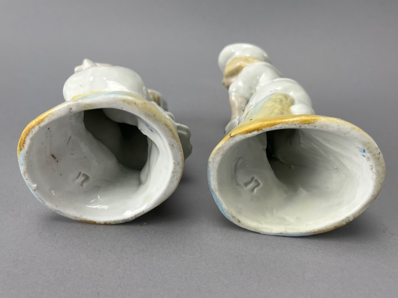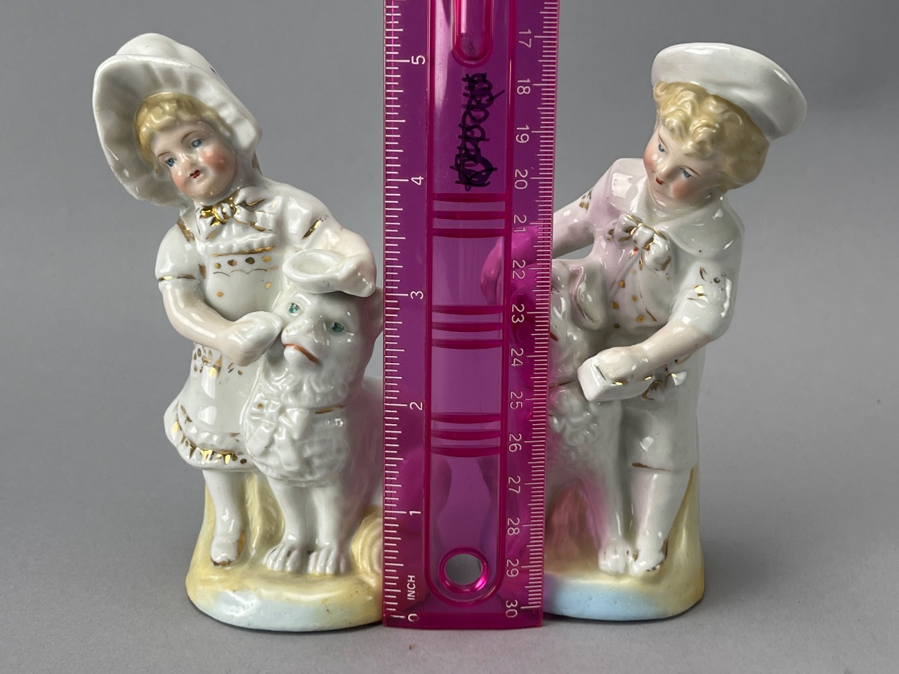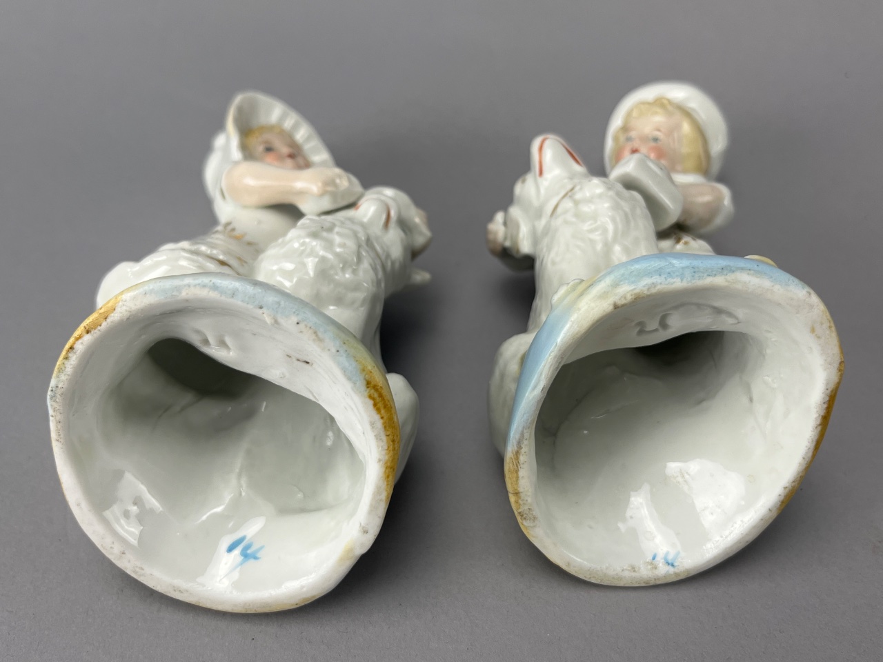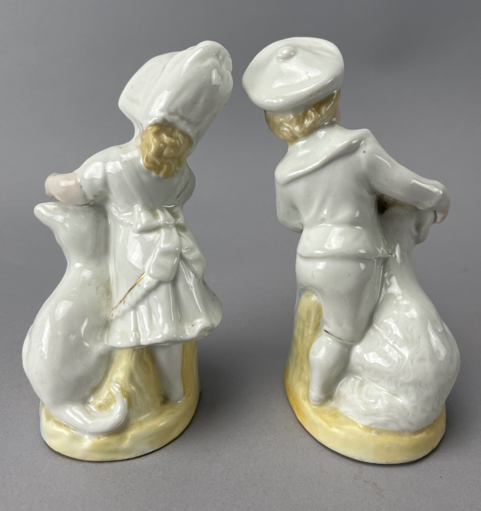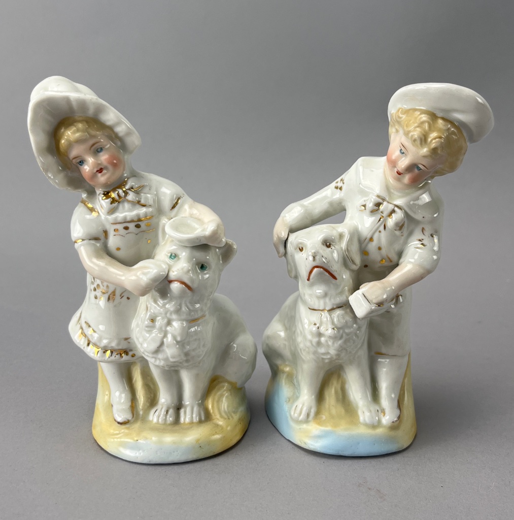 Pair of porcelain figurines depicting children with dogs. One child wears a hat and holds a dog with a hat, while the other wears a sailor hat and holds a dog. Both figurines feature a glossy finish and bases painted in yellow and blue. Both figures measure about 5″ tall. CONDITION: Minor wear to the paint on the figurines. No visible chips or cracks. SHIPPING: In-House Shipping Available