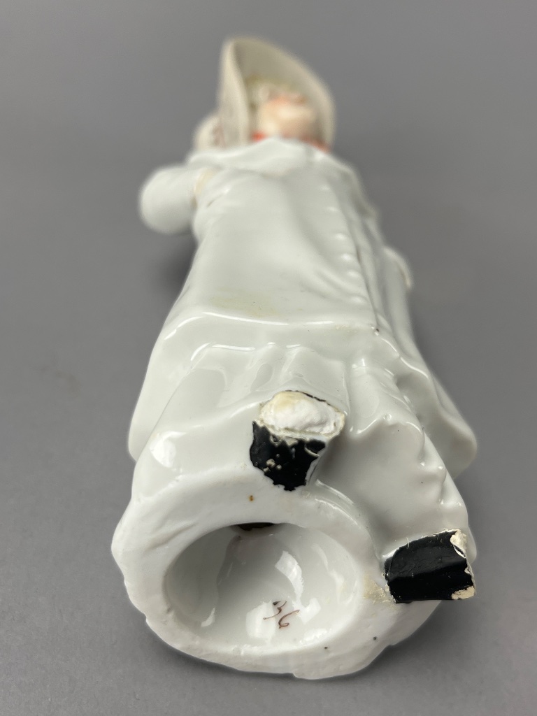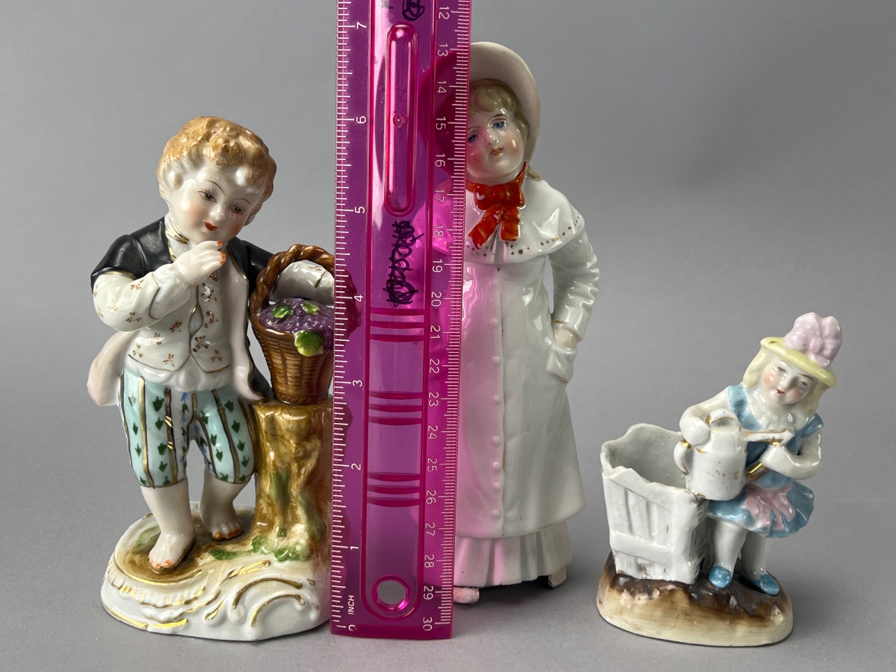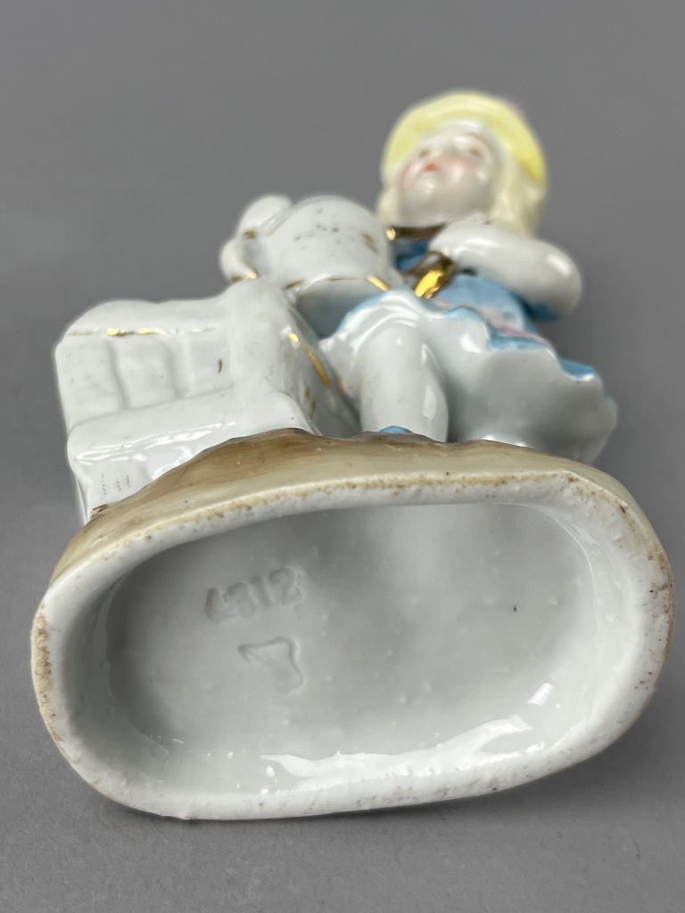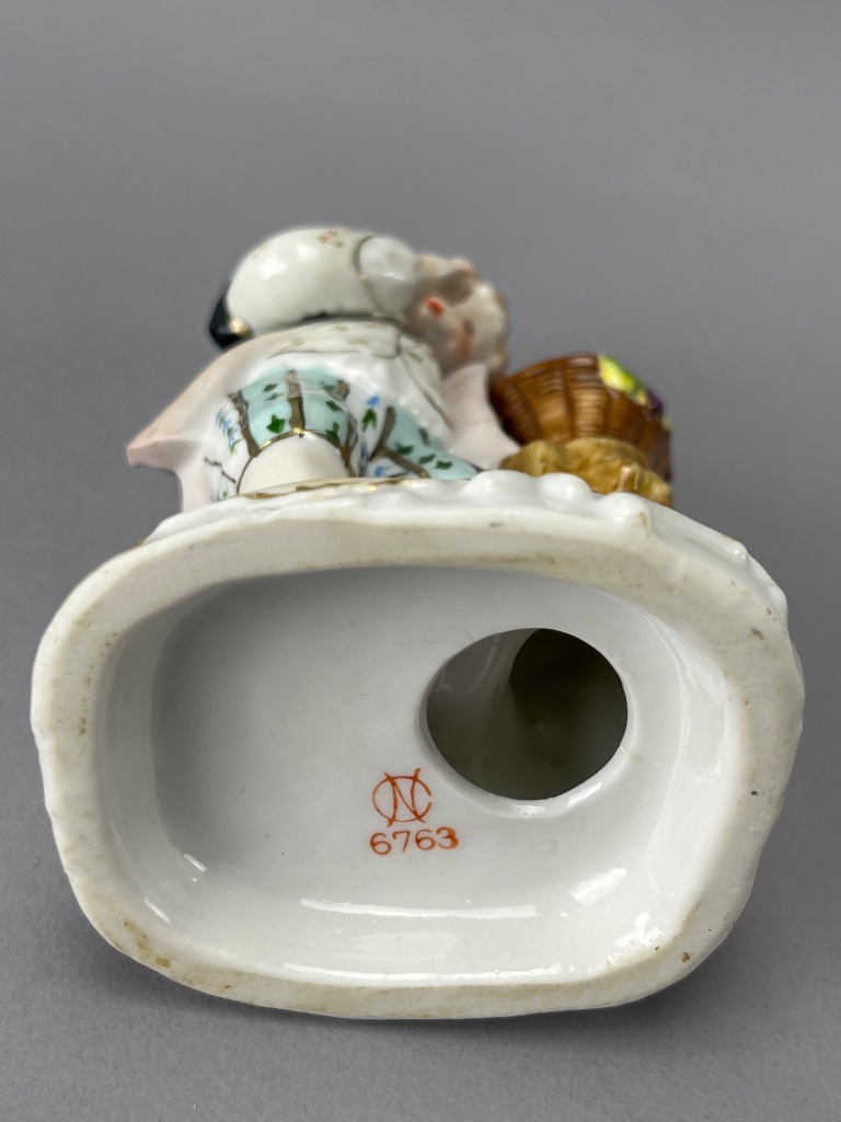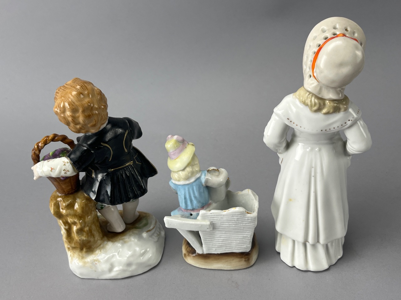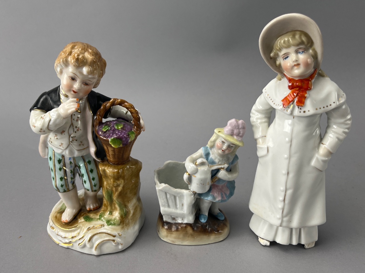 Group of three porcelain figurines depicting children in various poses. The first figurine features a boy holding a basket of flowers and bears a visible mark reading ‘NC 6763′ on the base. The second figurine shows a girl with a watering can next to a cart, marked ’36’ on the base. The third figurine depicts a girl in a white dress with a bonnet, marked ‘4312’ on the base. All figurines are crafted from porcelain and display minor wear on their bases. Measure 6″-7″H. CONDITION: Minor wear observed on the bases of all figurines. No visible chips or cracks noted. SHIPPING: In-House Shipping Available
