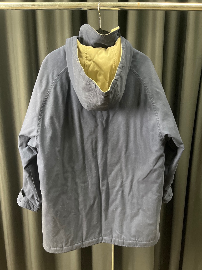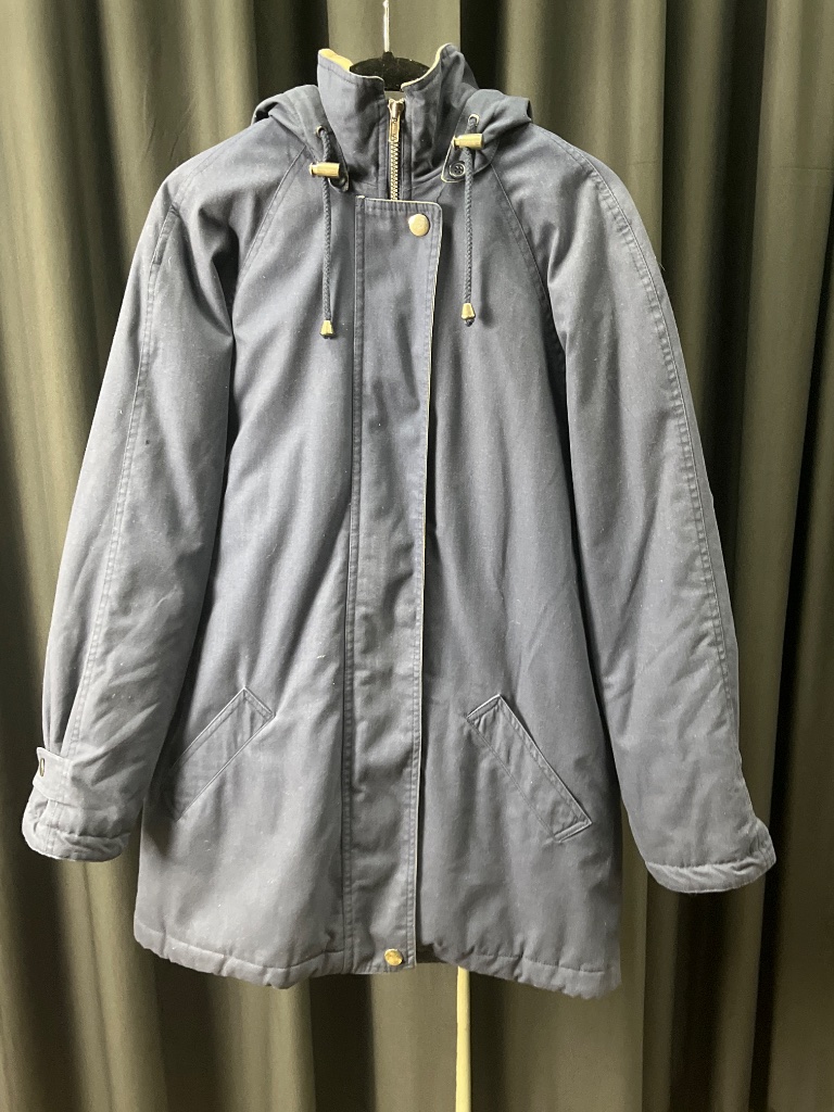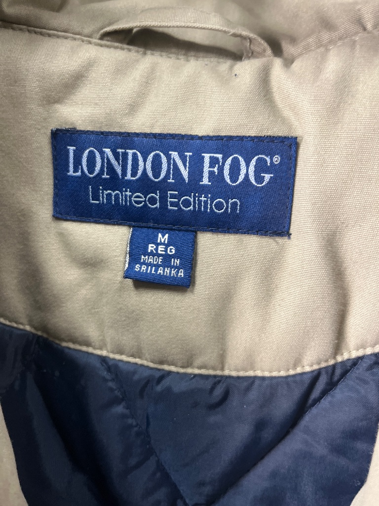 London Fog Limited Edition hooded jacket in navy blue textile. Features a hood with drawstring, two front flap pockets, zipper closure with snap button at the neck, and lighter interior lining, possibly yellow. Size M Regular, marked ‘LONDON FOG® Limited Edition’ and ‘MADE IN SRI LANKA’. CONDITION: Visible wear and dirt on the fabric. No major damage observed. SHIPPING: In-House Shipping Available