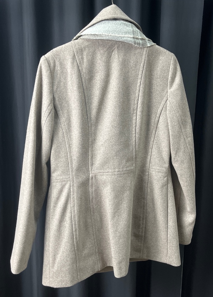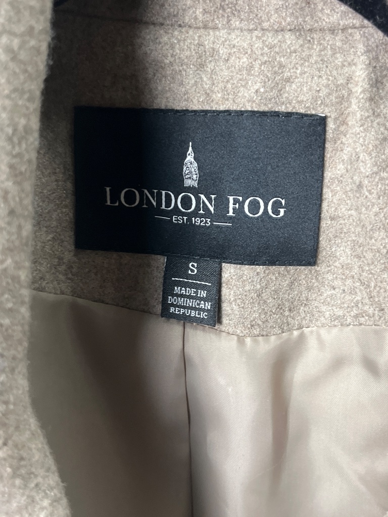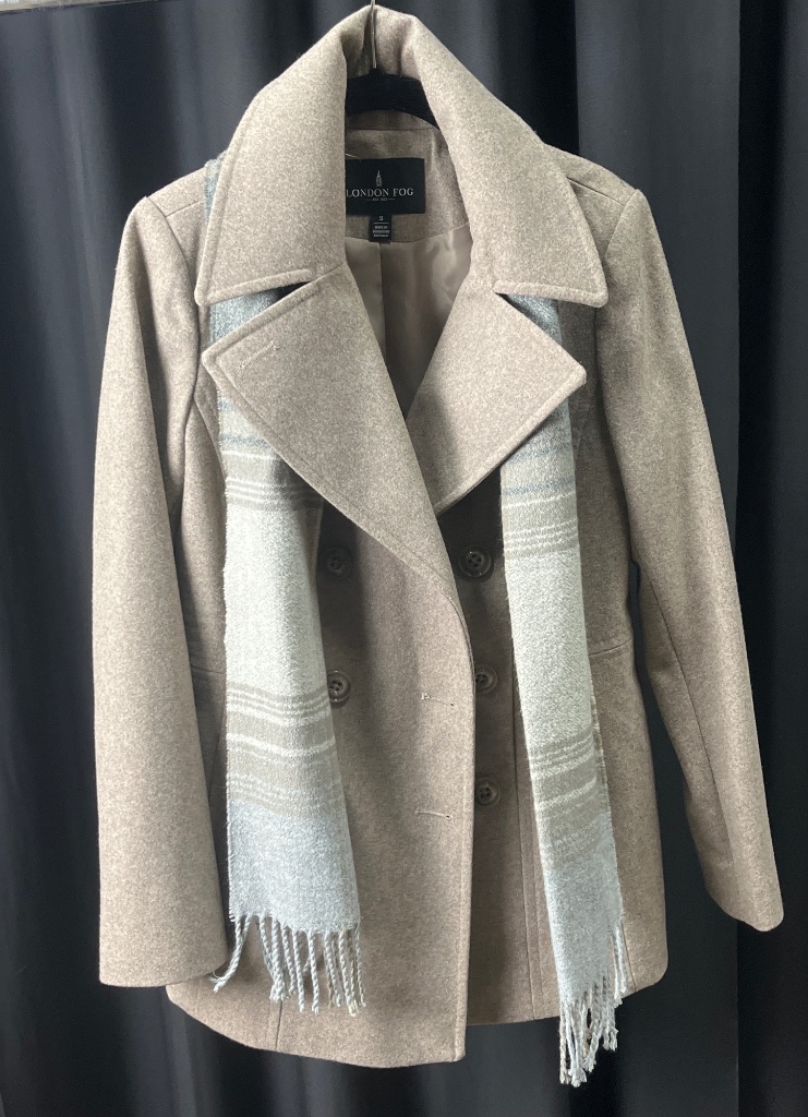 London Fog double-breasted coat in light brown wool blend fabric, featuring large lapels and a coordinating light gray fringed scarf. Interior label reads ‘LONDON FOG EST. 1923’, with size ‘S’ and ‘Made in Dominican Republic’ noted. CONDITION: Condition not assessed. SHIPPING: In-House Shipping Available