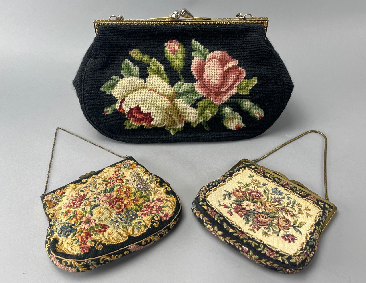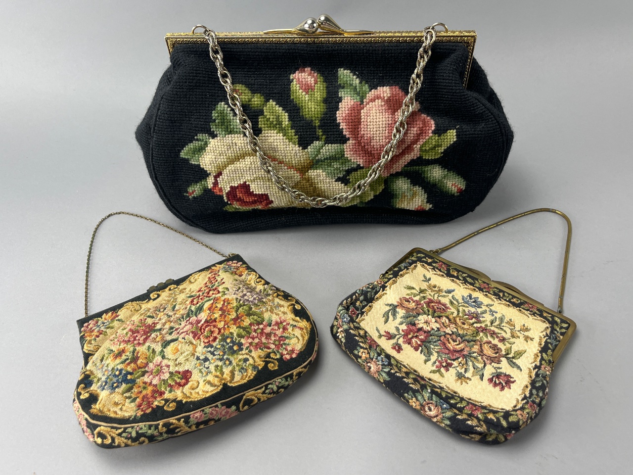 Three Floral Handbags with Metal Chain Straps and Clasps