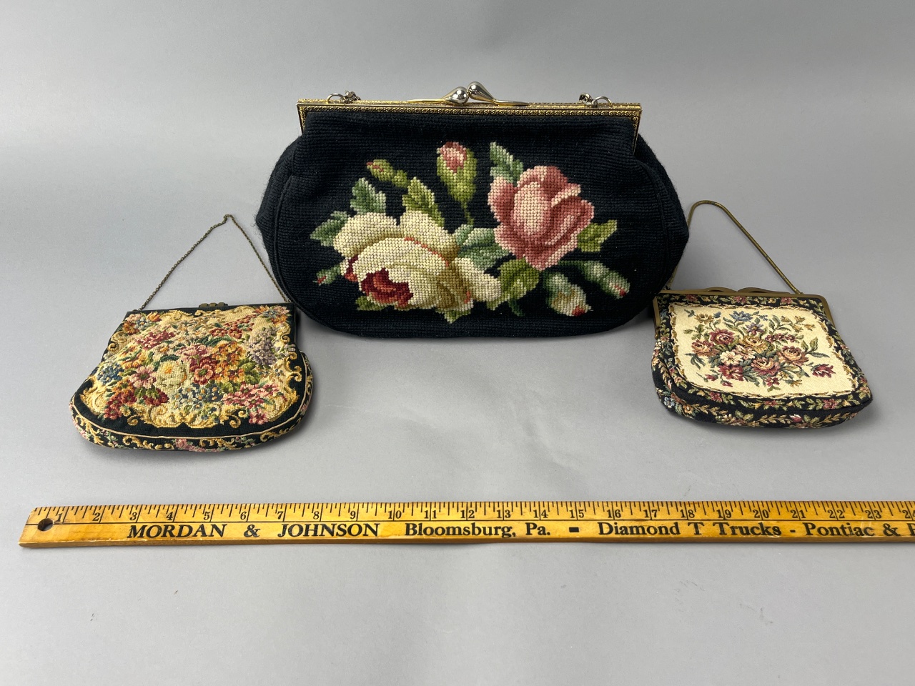 Grouping of three floral handbags, each featuring fabric construction with floral textile designs. The larger handbag has a black background with rose and cream flowers and a metal clasp. The two smaller handbags feature yellow and cream backgrounds with floral patterns and metal chain straps. CONDITION: SHIPPING: In-House Shipping Available