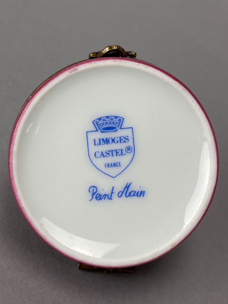 Limoges Castel porcelain trinket box featuring a round shape with a pink glossy exterior and a hinged lid adorned with a cat figure. The interior is smooth and white. The base is marked ‘LIMOGES CASTEL FRANCE’ and ‘Peint Main.’ Measure 2″. CONDITION: Minor wear to the metal clasp. No visible chips or cracks. SHIPPING: In-House Shipping Available