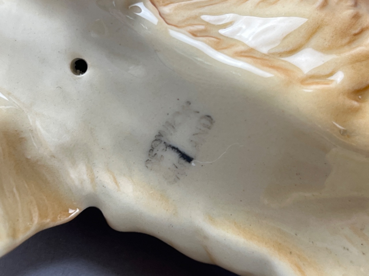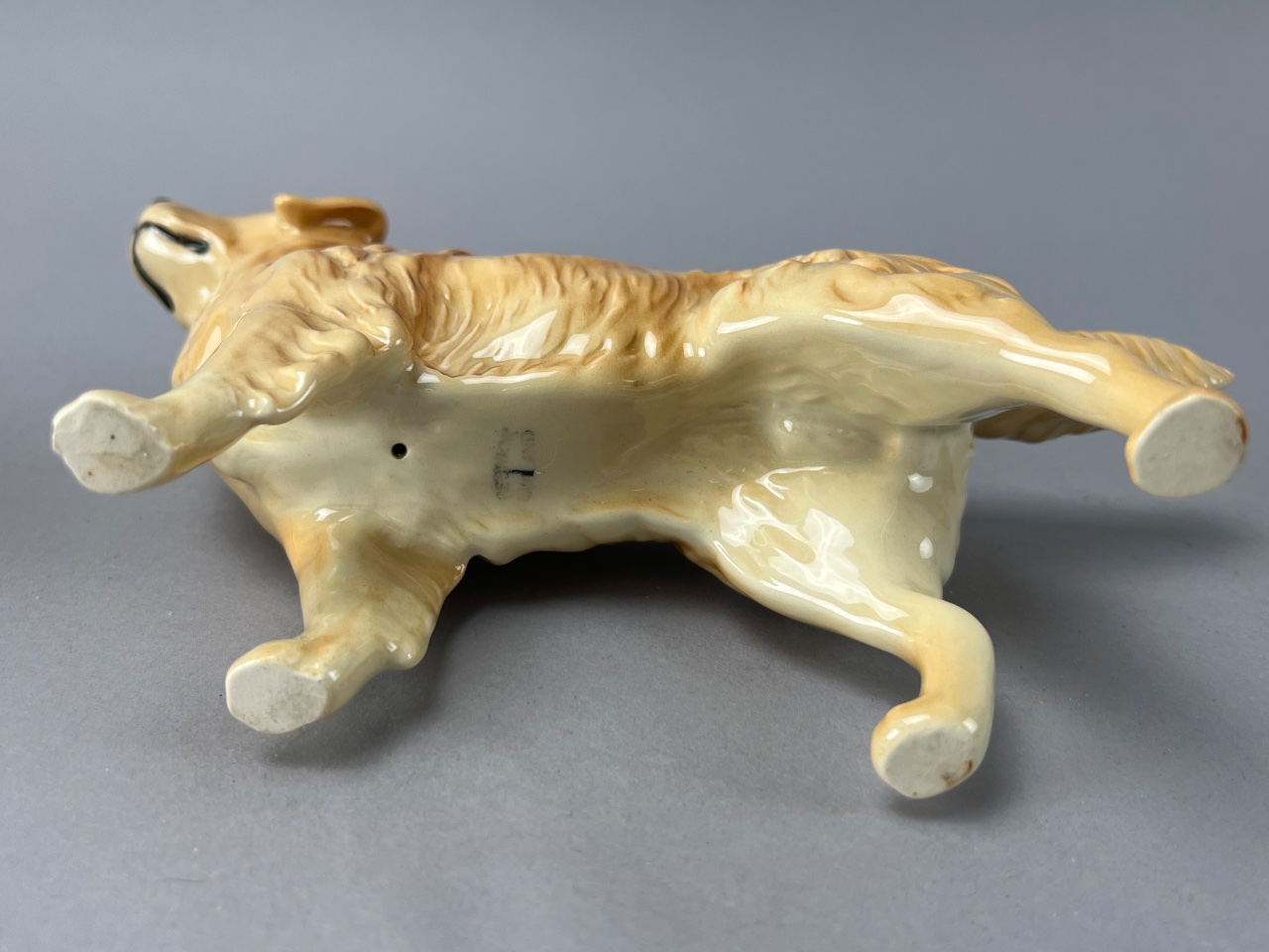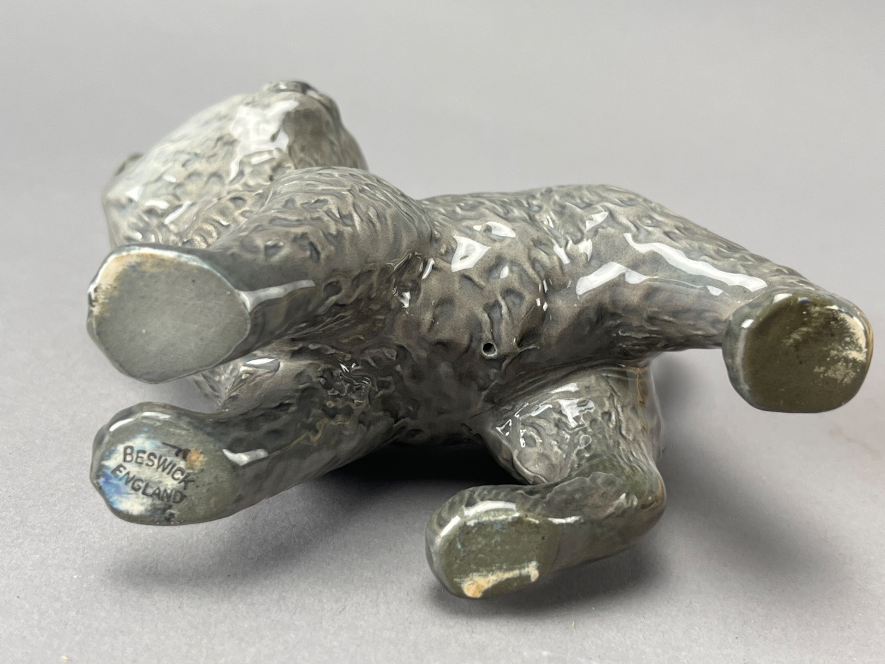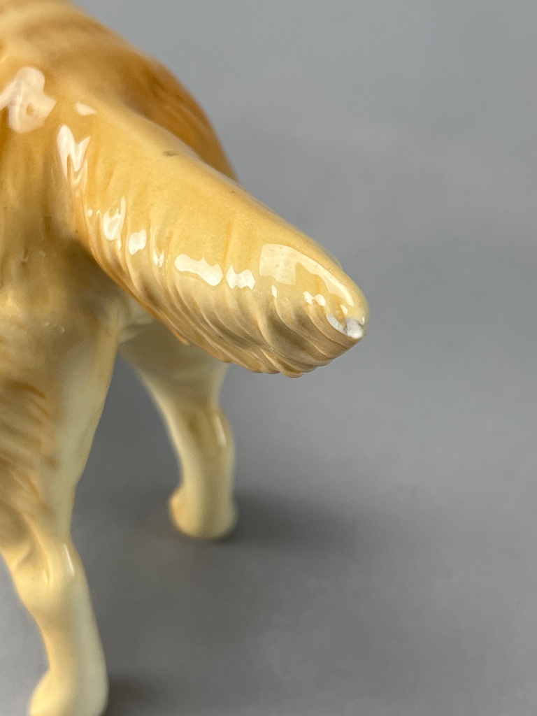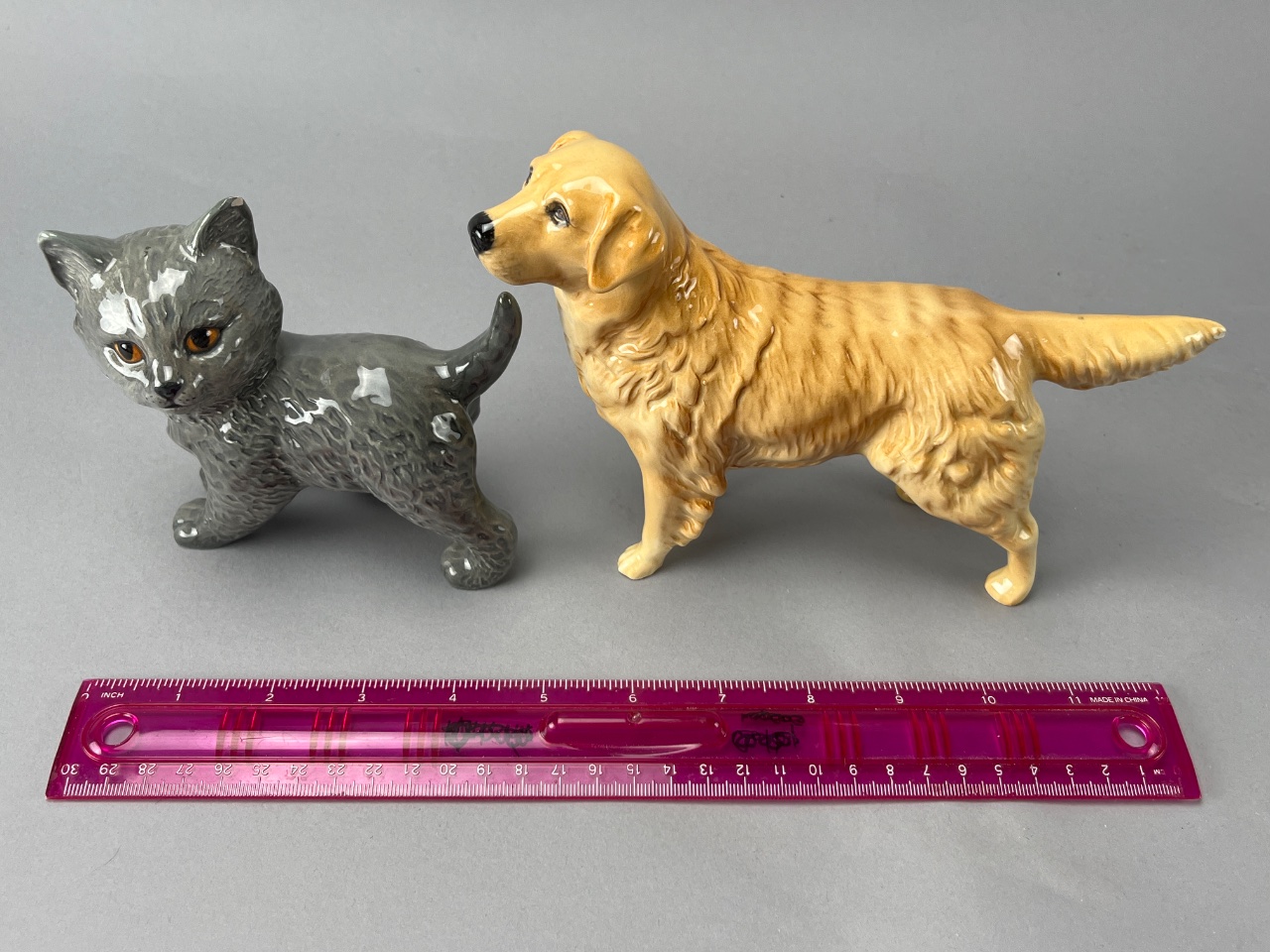 Pair of Beswick ceramic animal figures, including a golden yellow dog and a gray cat. Both feature a glossy finish and textured fur details. The base of the cat figure bears a stamped mark reading ‘BESWICK ENGLAND’; the dog figure’s base mark is partially obscured but appears consistent with Beswick production. Measure 5″W and 7″W. CONDITION: Minor surface wear observed on the dog figure; no visible chips or cracks on either figure. SHIPPING: In-House Shipping Available