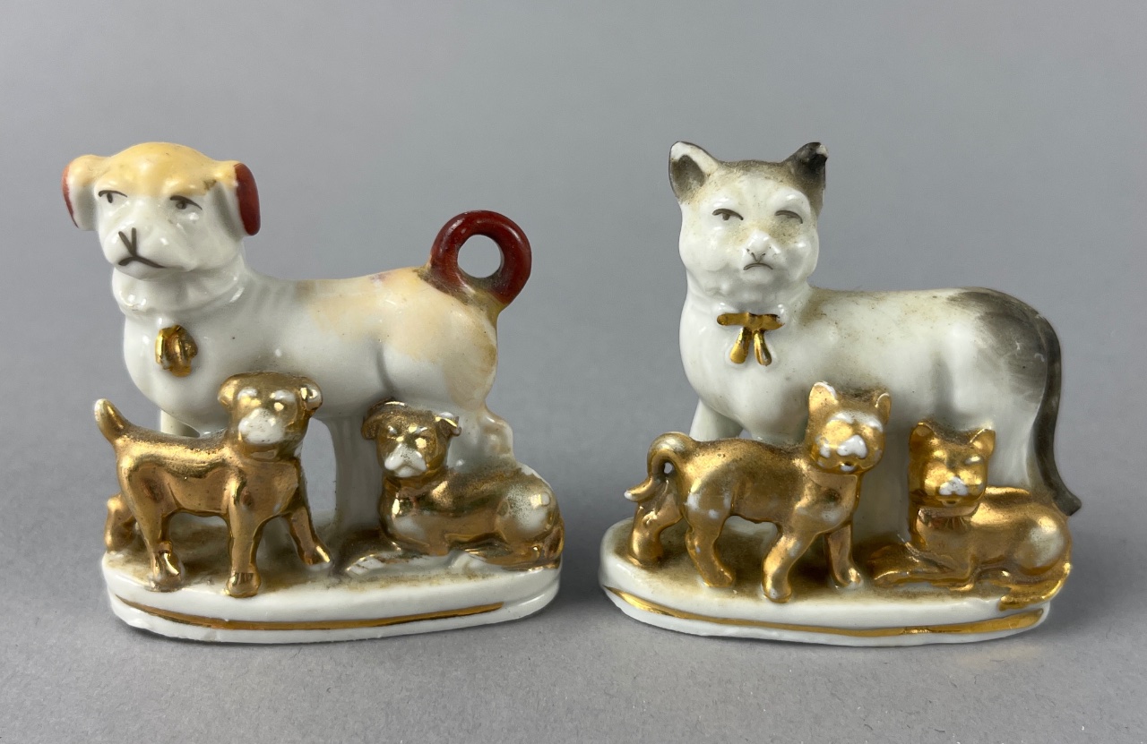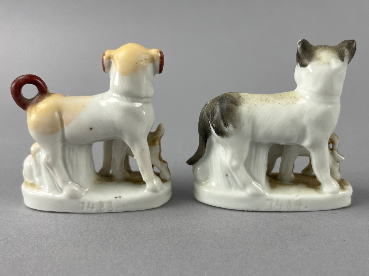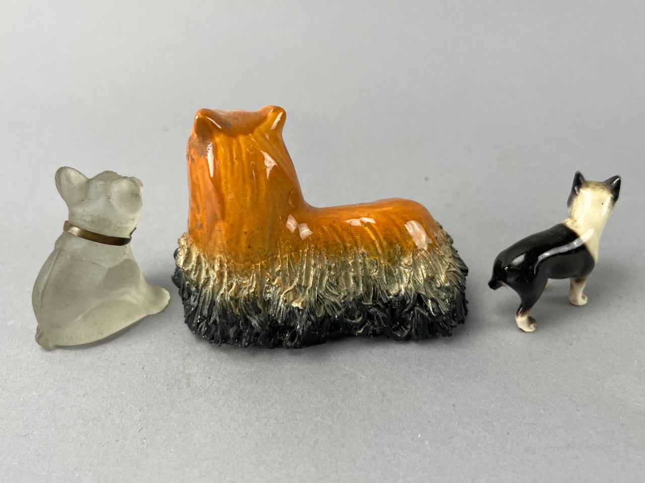Assortment of small animal figurines including cats and dogs. The grouping includes two seated cats with brown heads and white bodies, wearing collars; one orange and black dog figurine with a textured body; one clear glass dog figurine; one small black and white dog figurine; and two dog figurines on a base with gold accents. Materials include ceramic and glass. Small dog measure 1″. CONDITION: Some surface wear on the figurines. No visible chips or cracks. SHIPPING: In-House Shipping Available