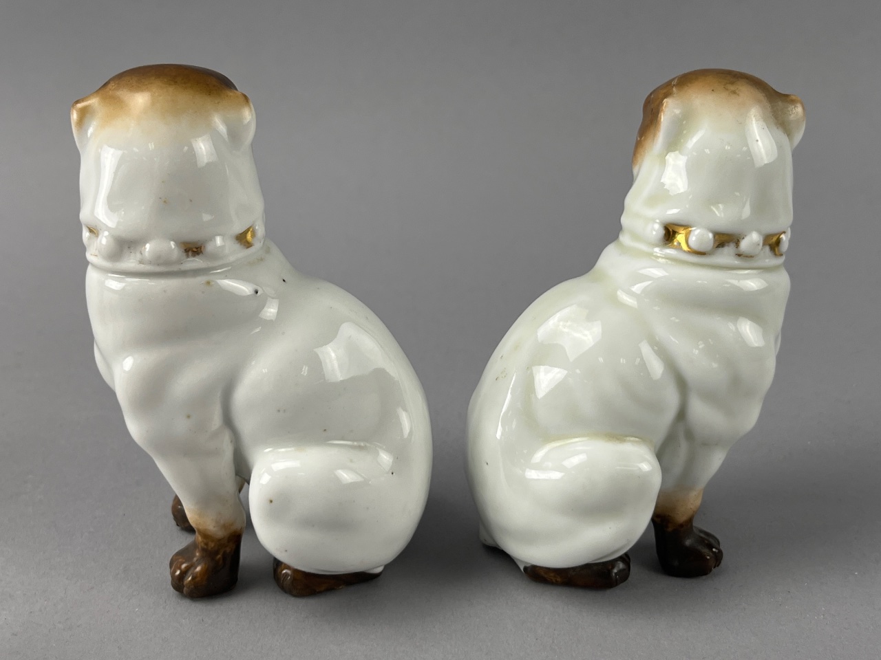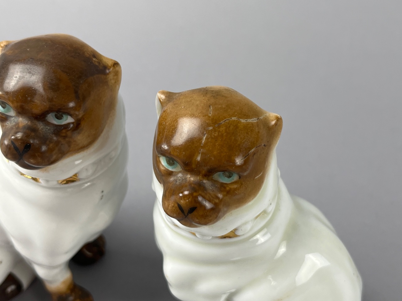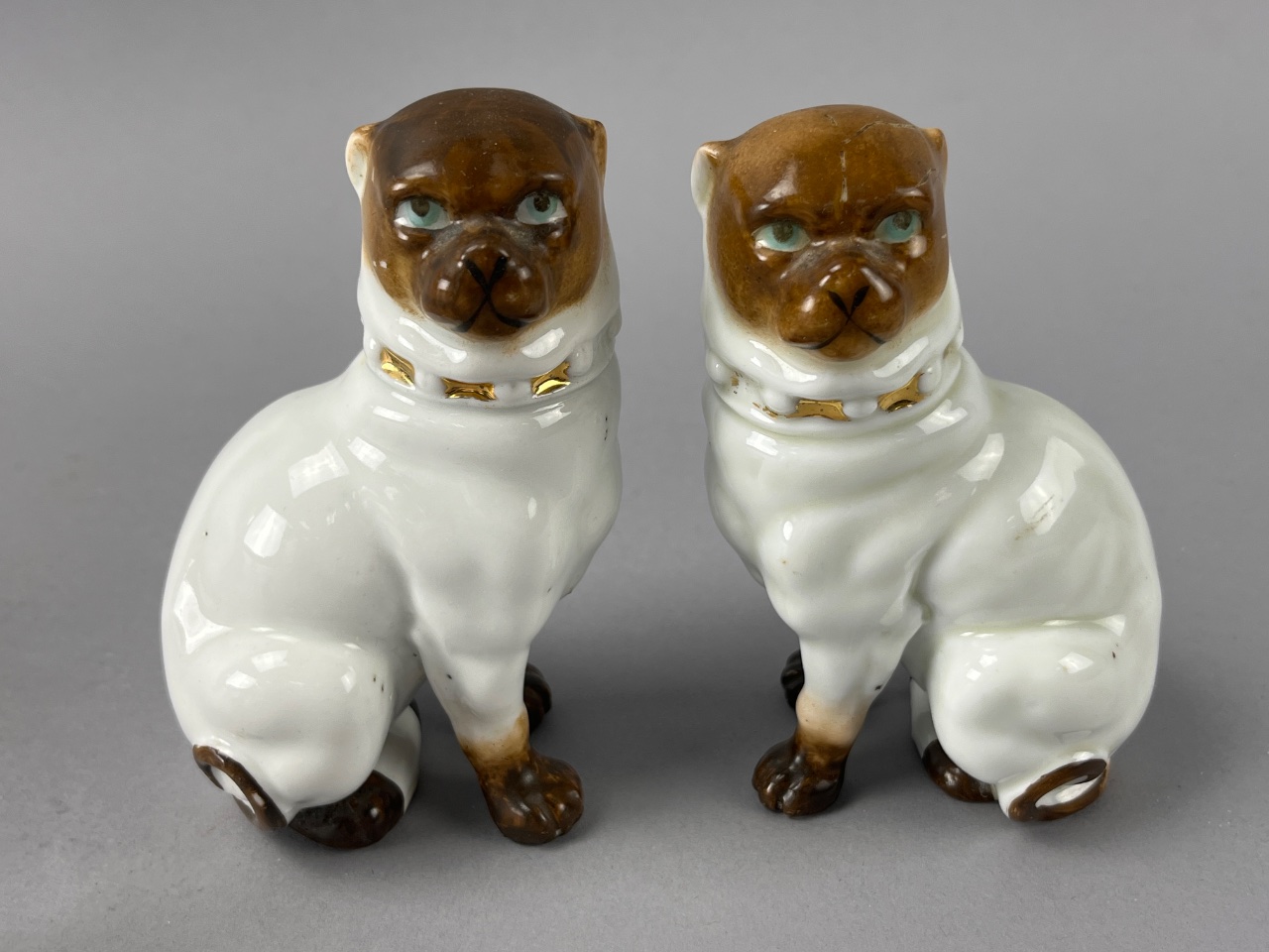 Assortment of small animal figurines including cats and dogs. The grouping includes two seated cats with brown heads and white bodies, wearing collars; one orange and black dog figurine with a textured body; one clear glass dog figurine; one small black and white dog figurine; and two dog figurines on a base with gold accents. Materials include ceramic and glass. Small dog measure 1″. CONDITION: Some surface wear on the figurines. No visible chips or cracks. SHIPPING: In-House Shipping Available