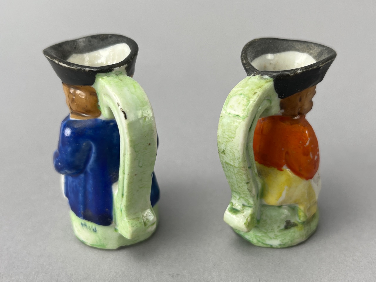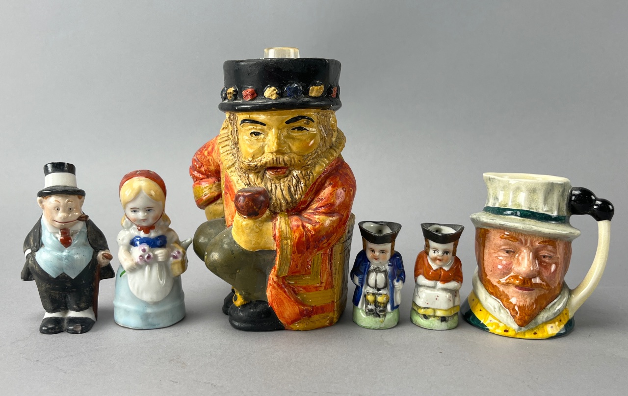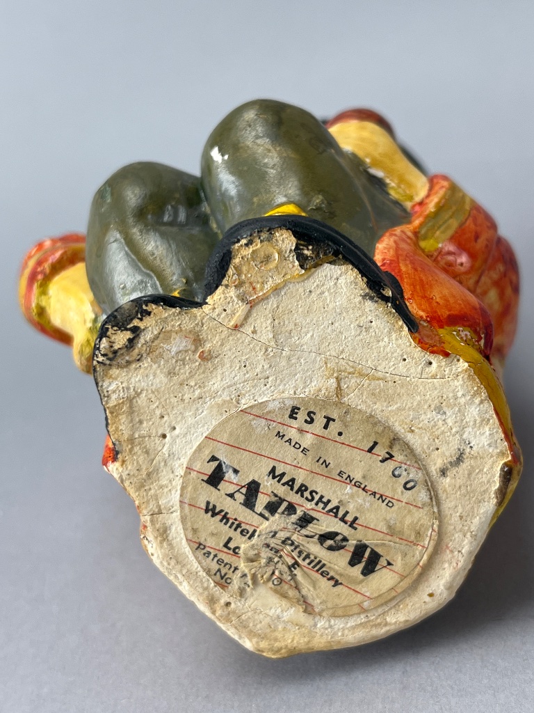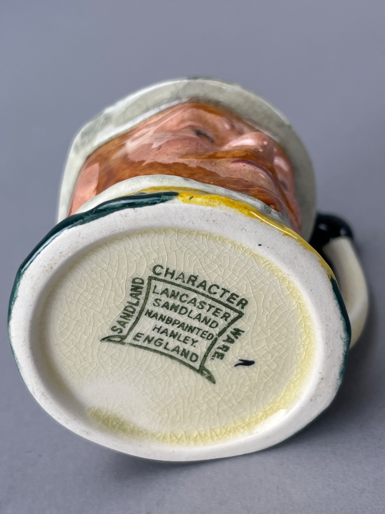 Set of ceramic character figures and a jug marked ‘Marshall Taylor Whiteland Distillery London Est. 1760’ on the base of the larger figure. The jug is marked ‘S. Andaland Character Ware Lancaster Sandlands Handpainted Hanley England,’ suggesting a connection to Lancaster Sandlands, a Staffordshire pottery known for character ware. The set includes five figures and one jug, all featuring handpainted details and vibrant colors. Largest figure measures about 5.5″H. CONDITION: Minor paint wear on some figures. No visible chips or cracks observed. SHIPPING: In-House Shipping Available