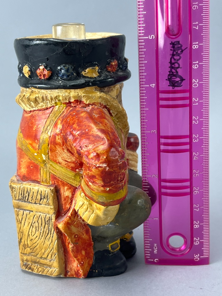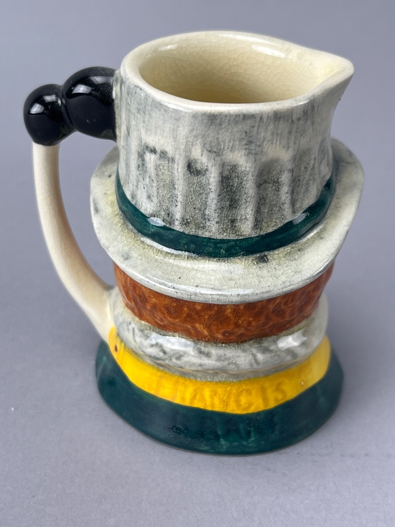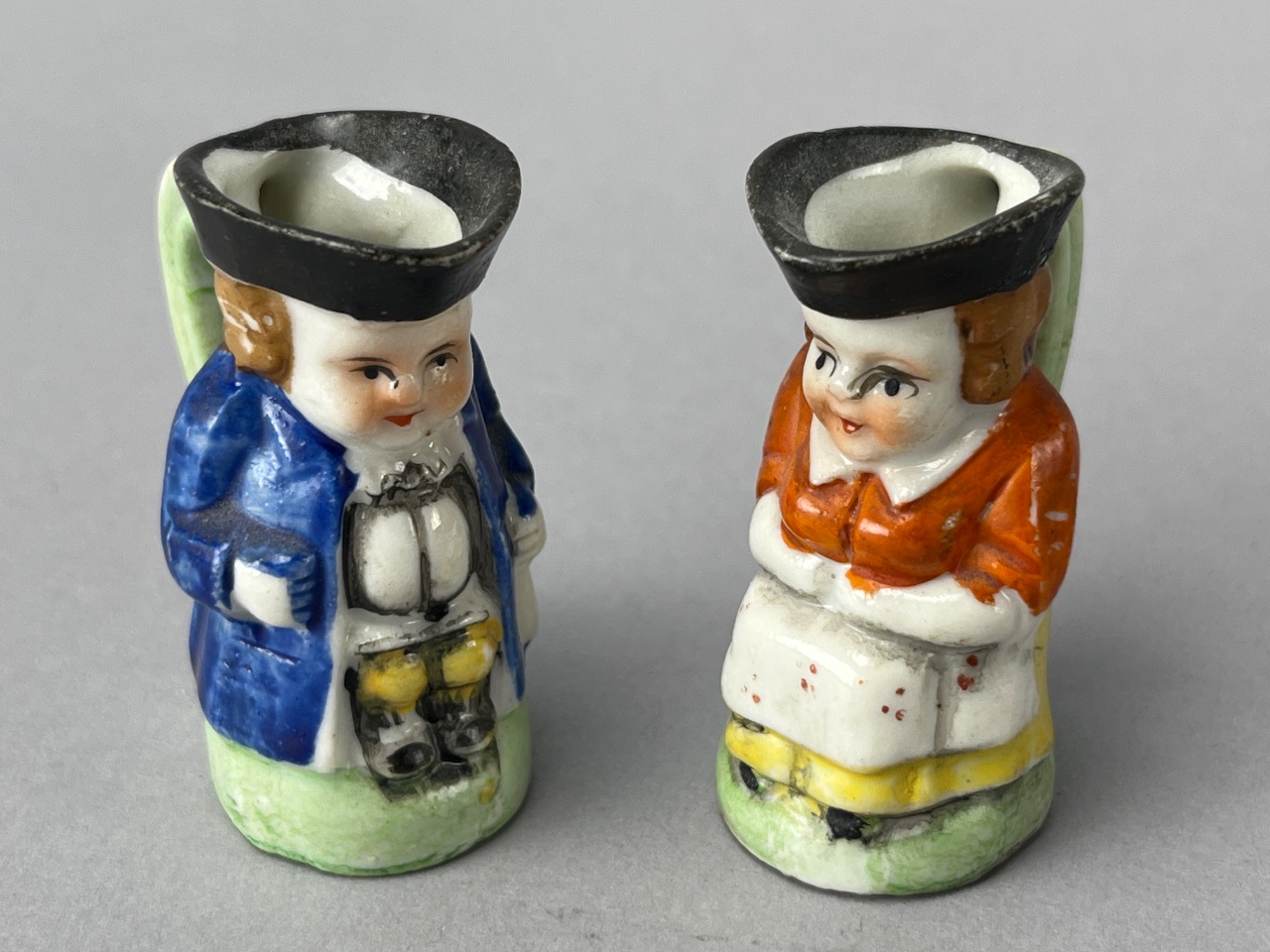 Set of ceramic character figures and a jug marked ‘Marshall Taylor Whiteland Distillery London Est. 1760’ on the base of the larger figure. The jug is marked ‘S. Andaland Character Ware Lancaster Sandlands Handpainted Hanley England,’ suggesting a connection to Lancaster Sandlands, a Staffordshire pottery known for character ware. The set includes five figures and one jug, all featuring handpainted details and vibrant colors. Largest figure measures about 5.5″H. CONDITION: Minor paint wear on some figures. No visible chips or cracks observed. SHIPPING: In-House Shipping Available