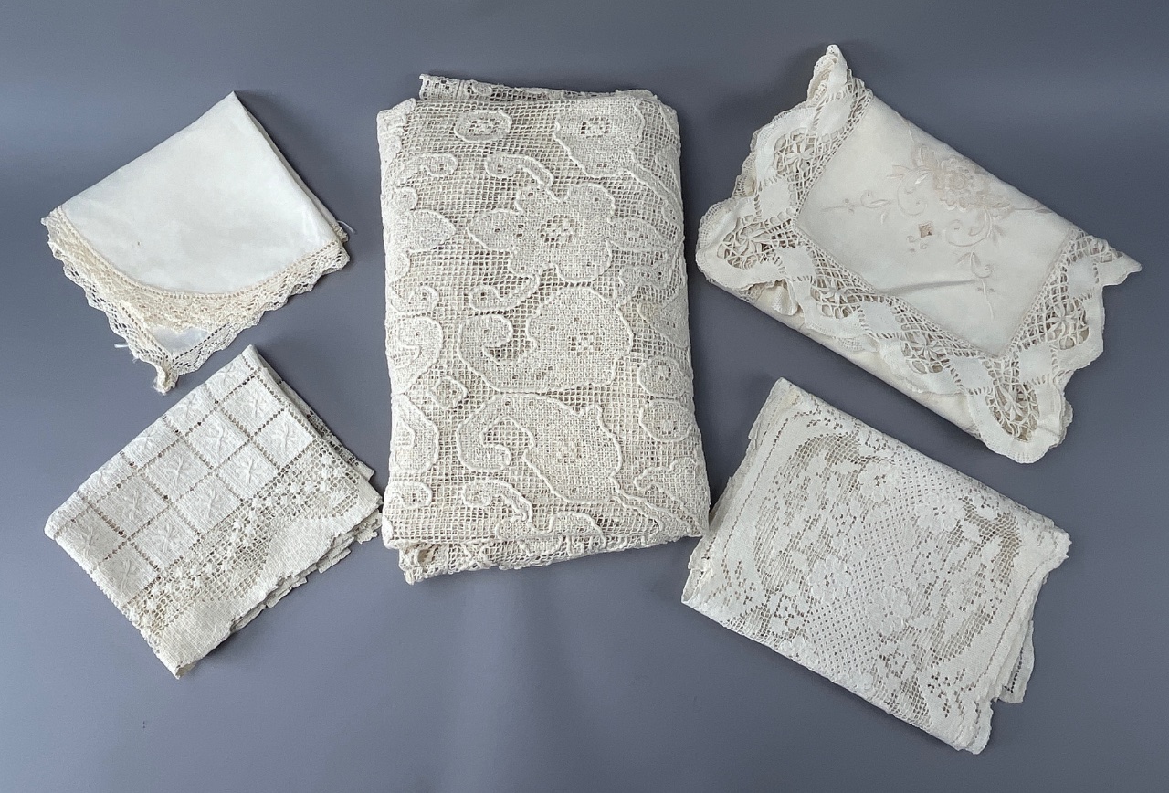 Collection of lace fabric pieces, including one large floral-patterned scalloped piece, two smaller decorative edge pieces, a lace-bordered handkerchief, and a grid-pattern piece with lace trim. The items feature intricate lace designs consistent with historical textiles. CONDITION: SHIPPING: In-House Shipping Available