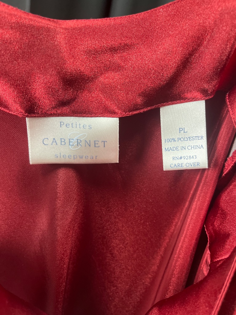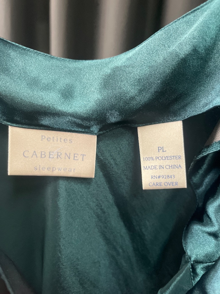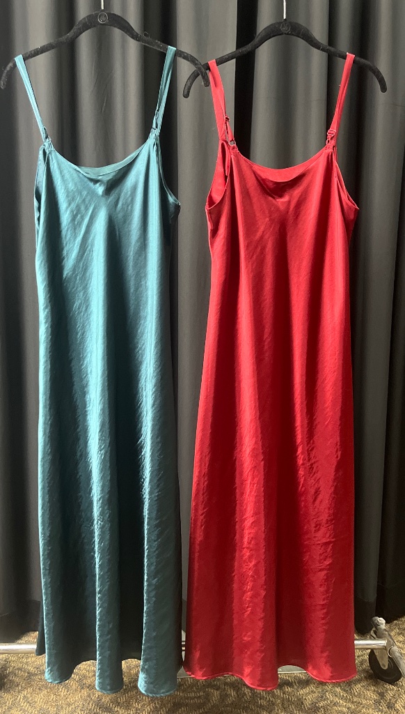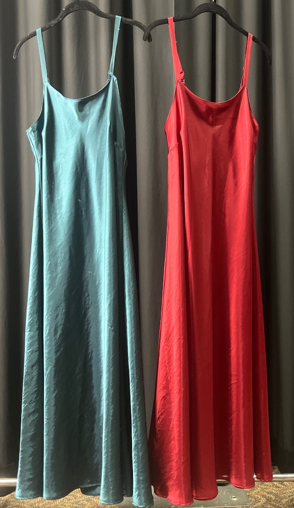 Pair of CABERNET sleepwear dresses in teal and red, both made of 100% polyester. Each dress features spaghetti straps and a flowing silhouette. Labels on both dresses read ‘CABERNET sleepwear’, ‘100% POLYESTER’, and ‘MADE IN CHINA’. CONDITION: The teal dress has a small frayed area on one strap. SHIPPING: In-House Shipping Available