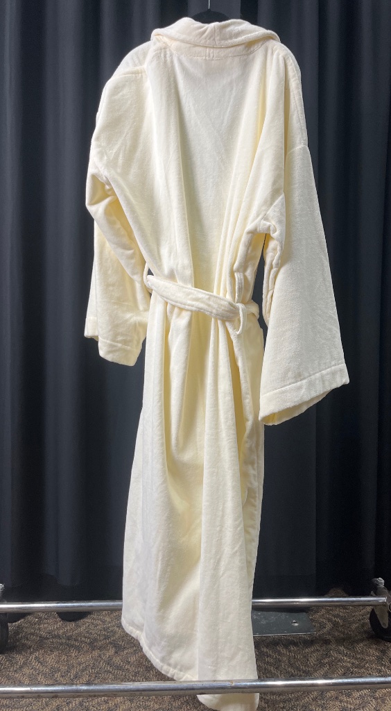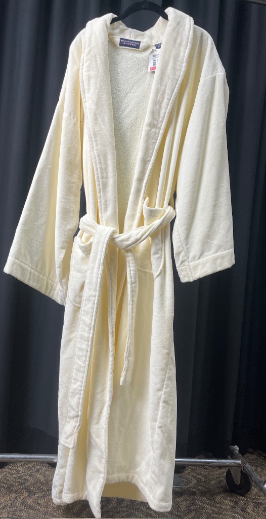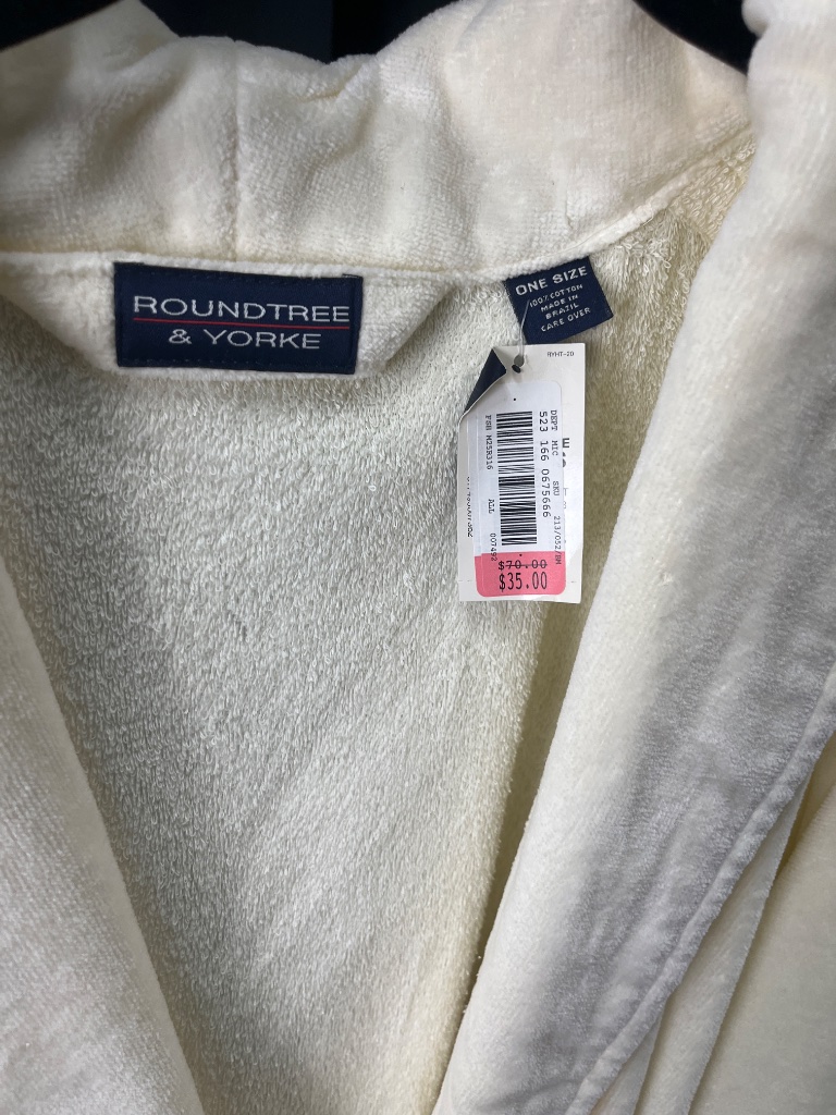Roundtree & Yorke cream-colored bathrobe made from a cotton blend. Features long sleeves with wide cuffs, a belted waist with a matching tie, and a tag on the collar reading ‘ROUND TREE & YORK’. The size tag indicates ‘ONE SIZE’, and the price tag shows an original price of $49.00 and a sale price of $35.00. CONDITION: Condition not assessed. SHIPPING: In-House Shipping Available