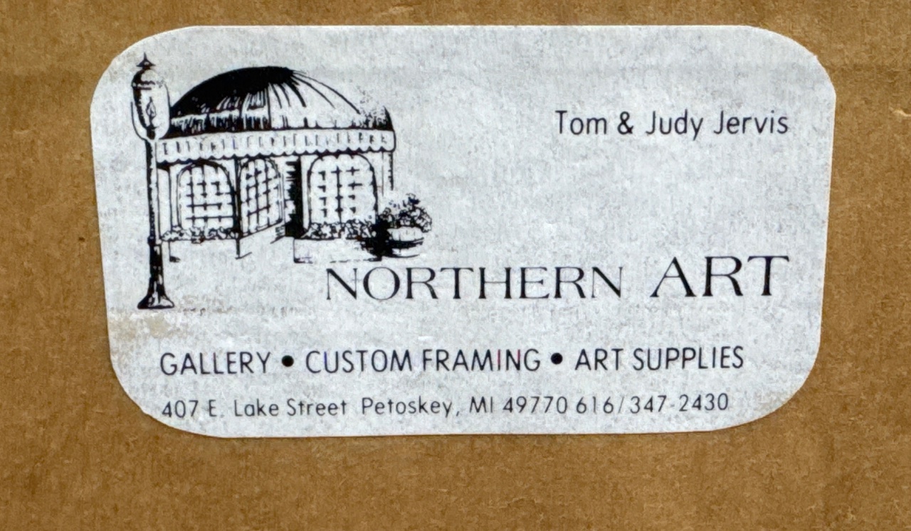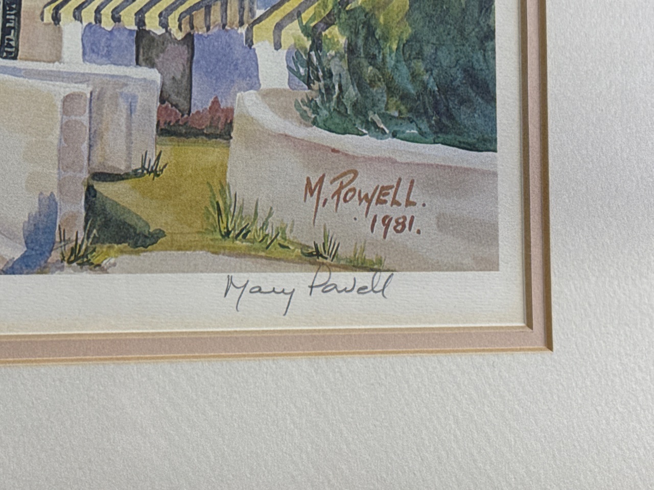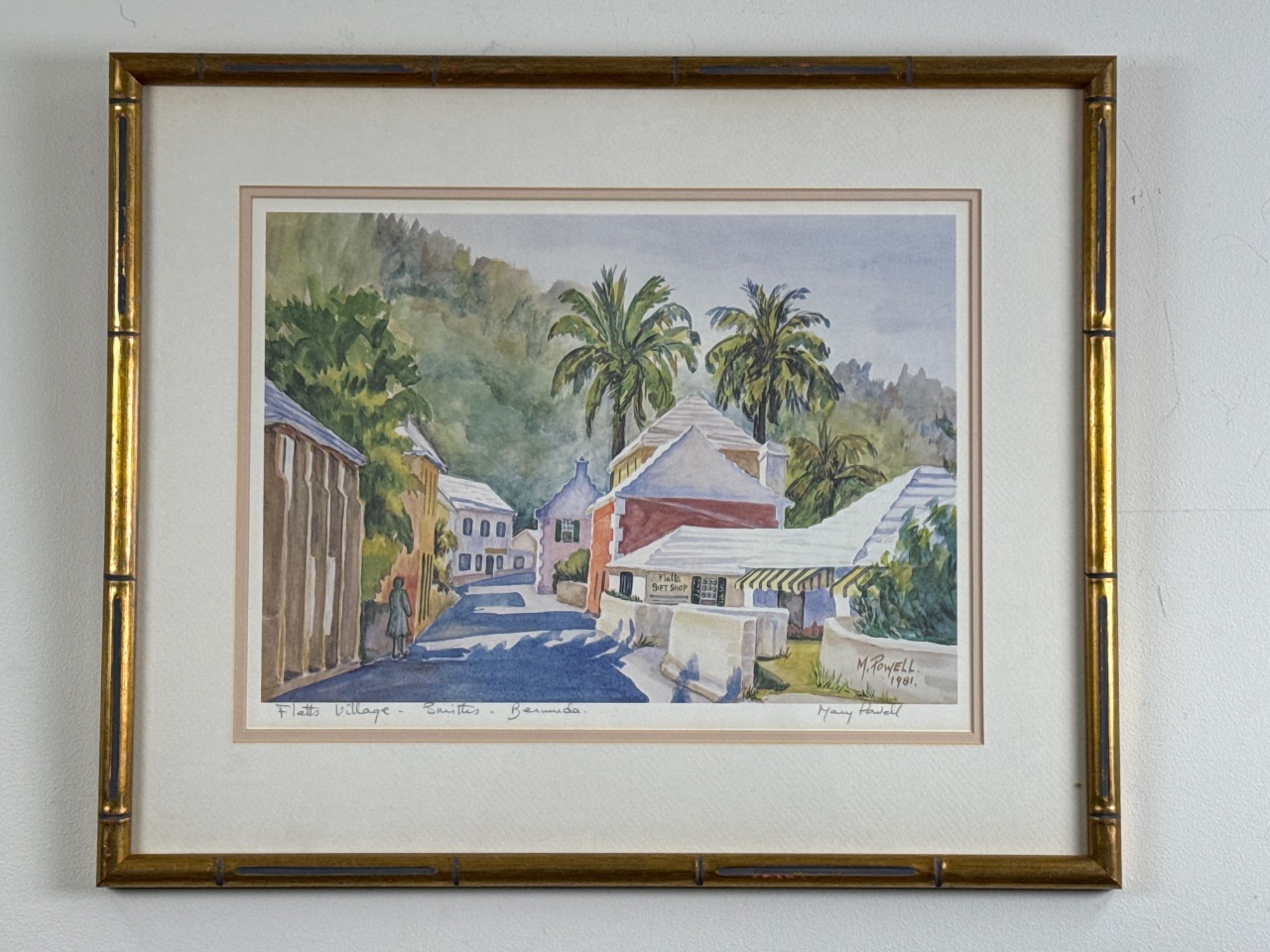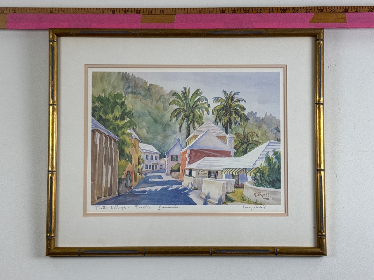 Watercolor painting of Flatt’s Village, Bermuda by Mary Powell, dated 1981. Signed lower right ‘M. Powell. 1981.’ and additionally The artwork depicts a street scene titled ‘Flatt’s Village – Smiths – Bermuda.’ Framed with a bamboo design. Measures 22″. CONDITION: Condition not assessed. SHIPPING: In-House Shipping Available
