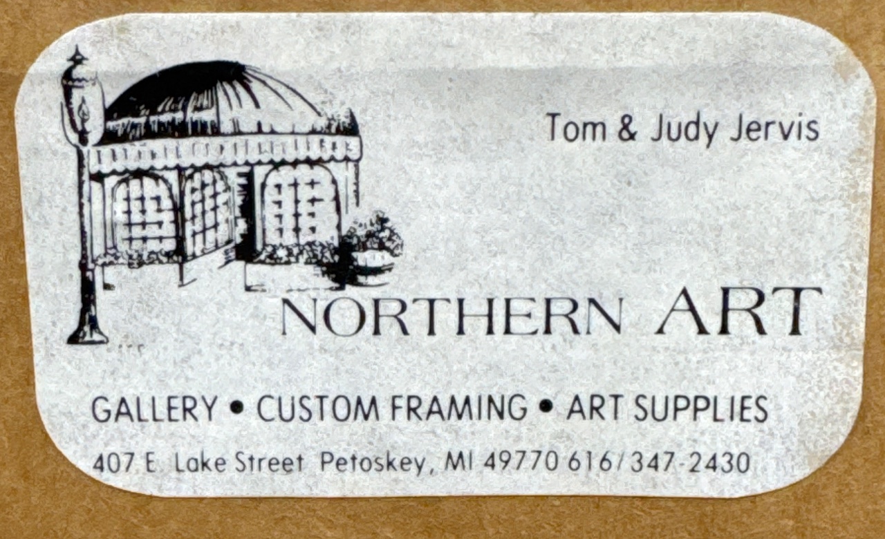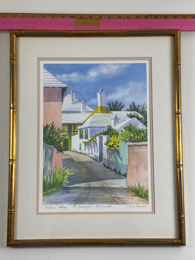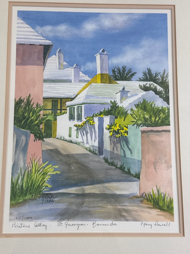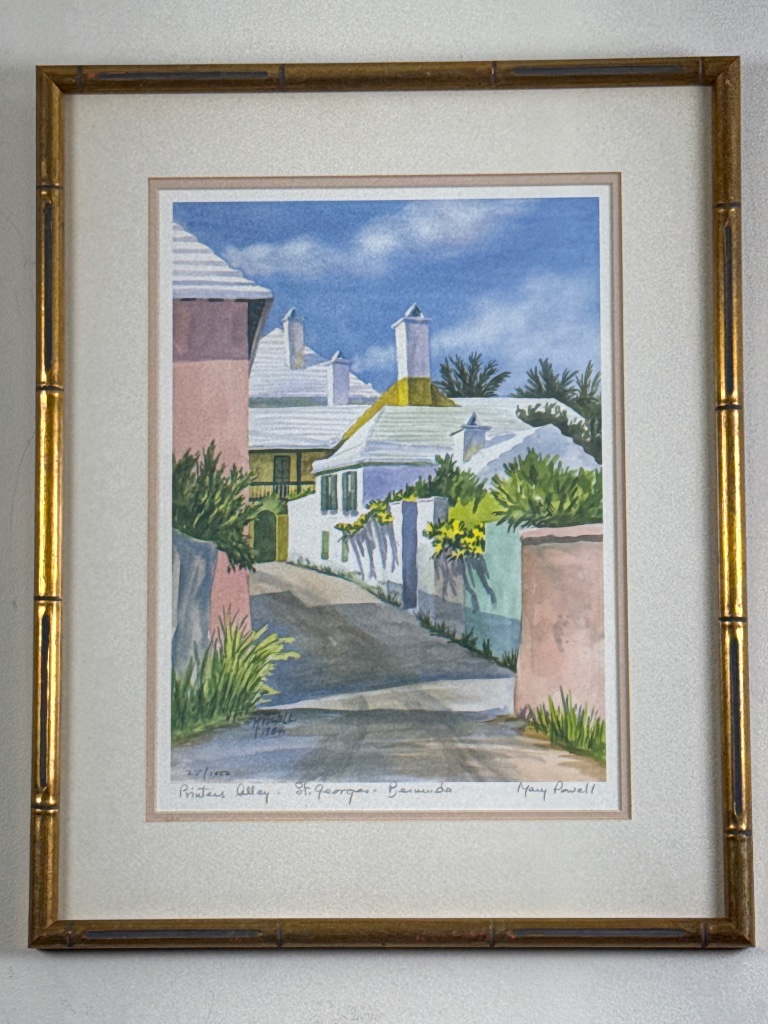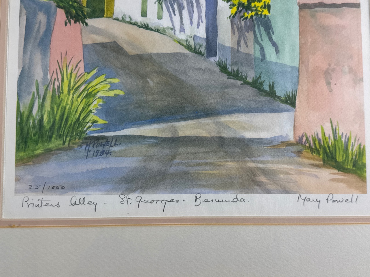 Watercolor painting titled ‘Printers Alley, St. George, Bermuda,’ signed lower right ‘Mary Powell’ numbered 25/1000 in pencil lower left, and dated 1984. Depicts a street scene in Bermuda, framed under glass. Measures 13″W. CONDITION: Condition not assessed. SHIPPING: In-House Shipping Available