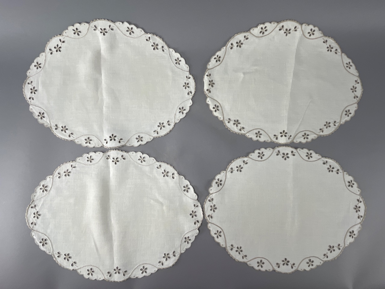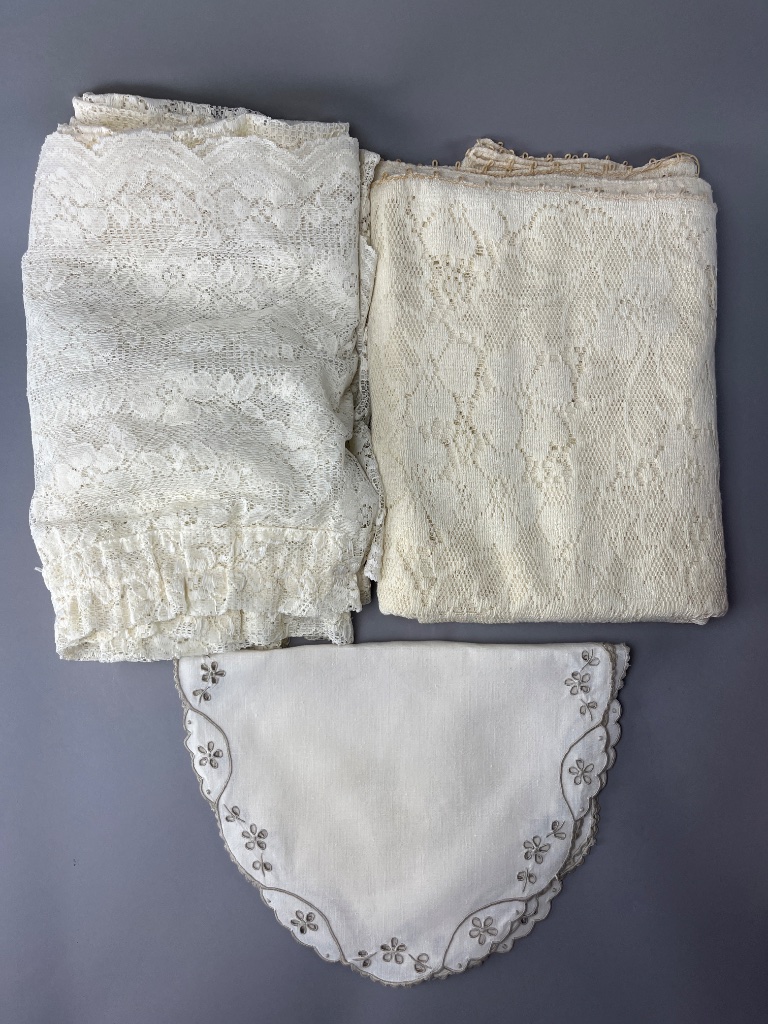 Assortment of lace fabric and embroidered cloth, including curtains, a tablecloth, and four oval-shaped placemats. The embroidered cloth features scalloped edges and floral designs, while the placemats have matching scalloped edges and floral cutouts. CONDITION: Condition not assessed. SHIPPING: In-House Shipping Available