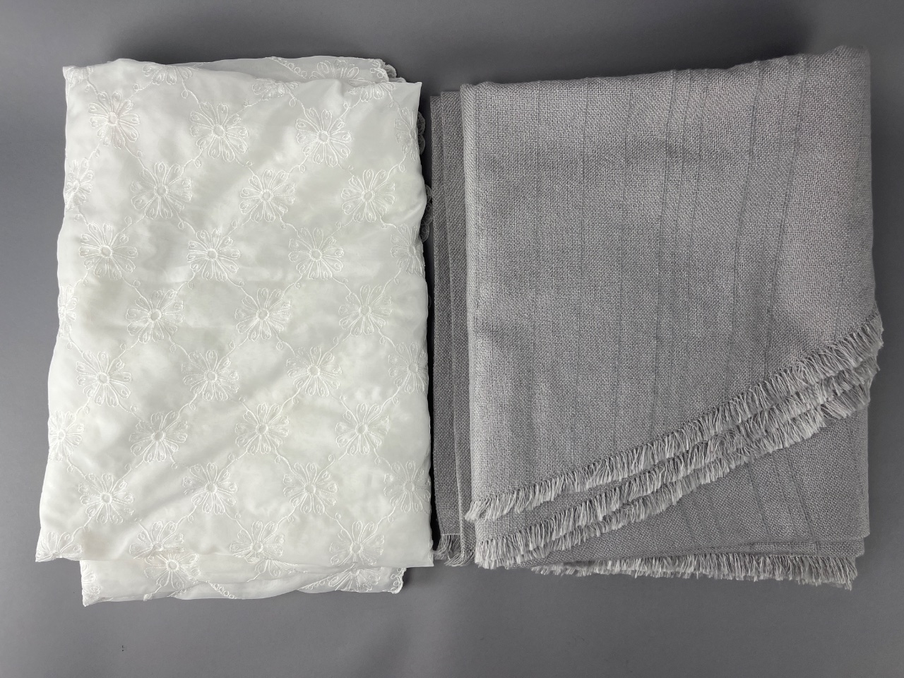 Group of two folded textile fabrics: a white fabric with floral embroidery pattern and a grey fabric with textured surface and fringe along one edge. Cataloger identified these items as a round grey tablecloth and floral white curtains. CONDITION: Condition not assessed. SHIPPING: In-House Shipping Available