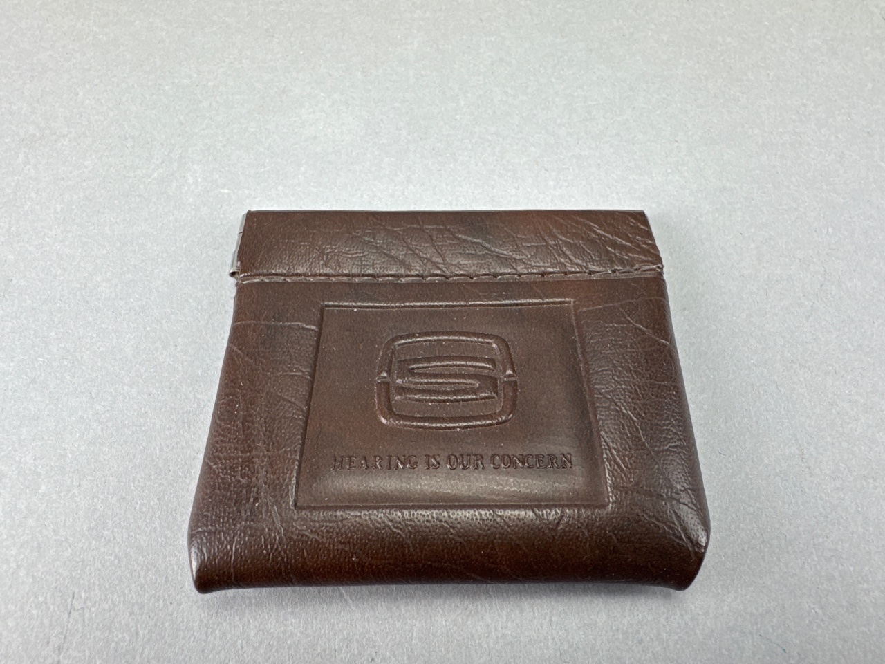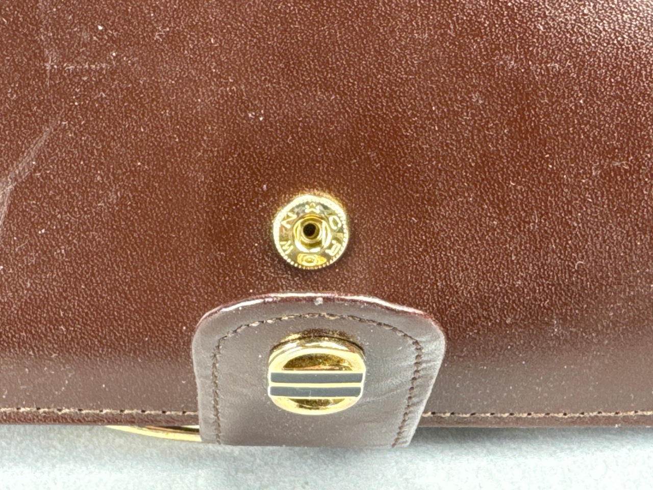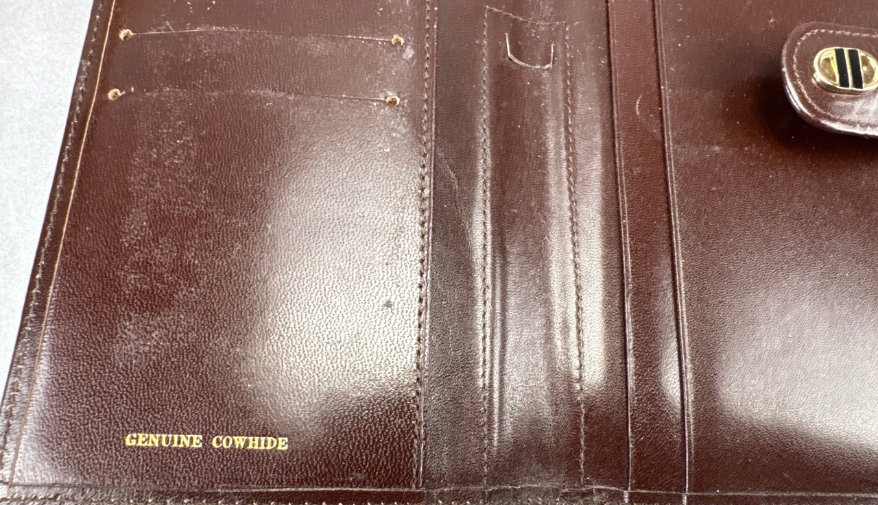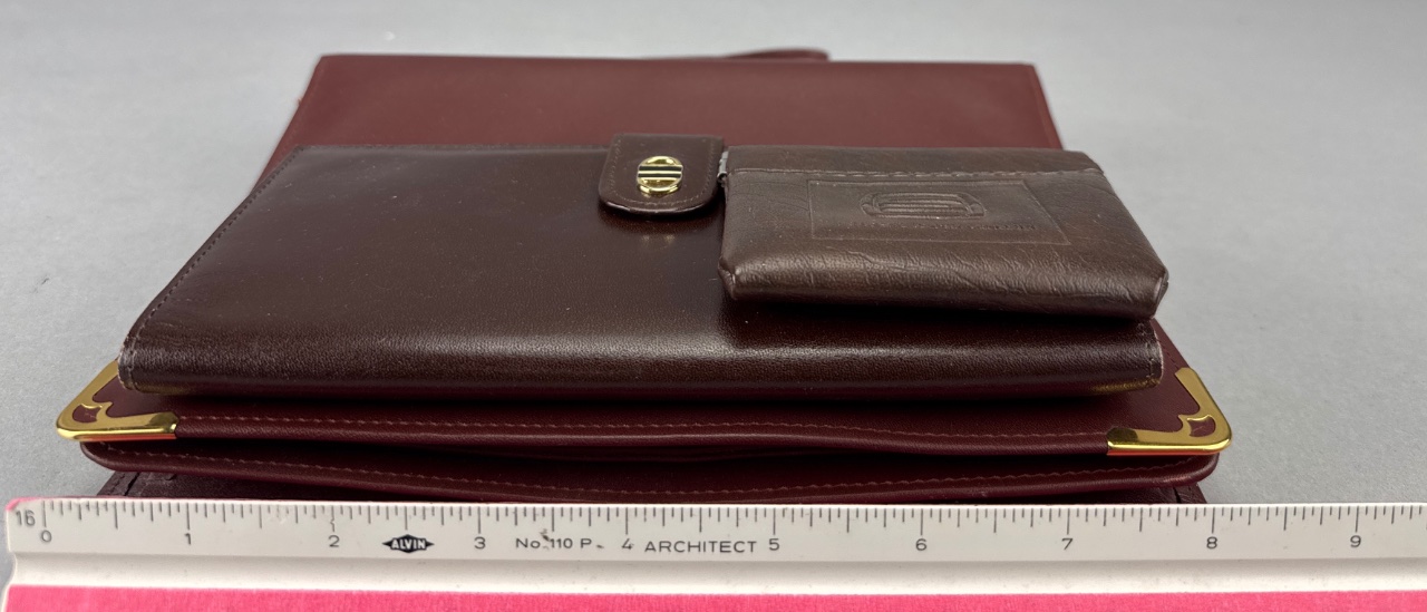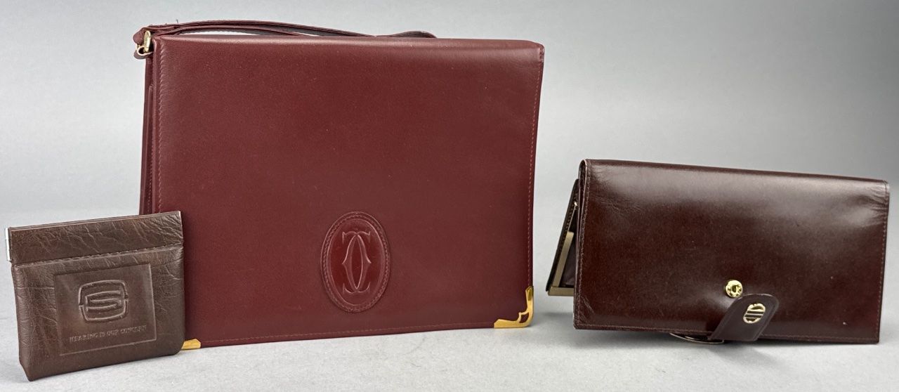 Cartier burgundy leather bag with gold-tone hardware, marked ‘Cartier Paris’ on the exterior and ‘GENUINE COWHIDE’ on the interior. Accompanied by a brown leather wallet with gold-tone hardware and a brown leather coin bag, both marked ‘HEARING IS OUR CONCERN.’ CONDITION: The large burgundy leather bag shows some surface scuffing. Minor wear is visible on the wallet and coin bag. SHIPPING: In-House Shipping Available