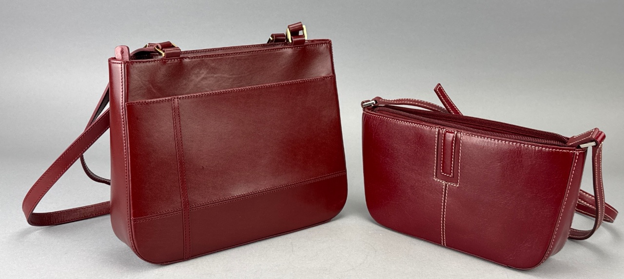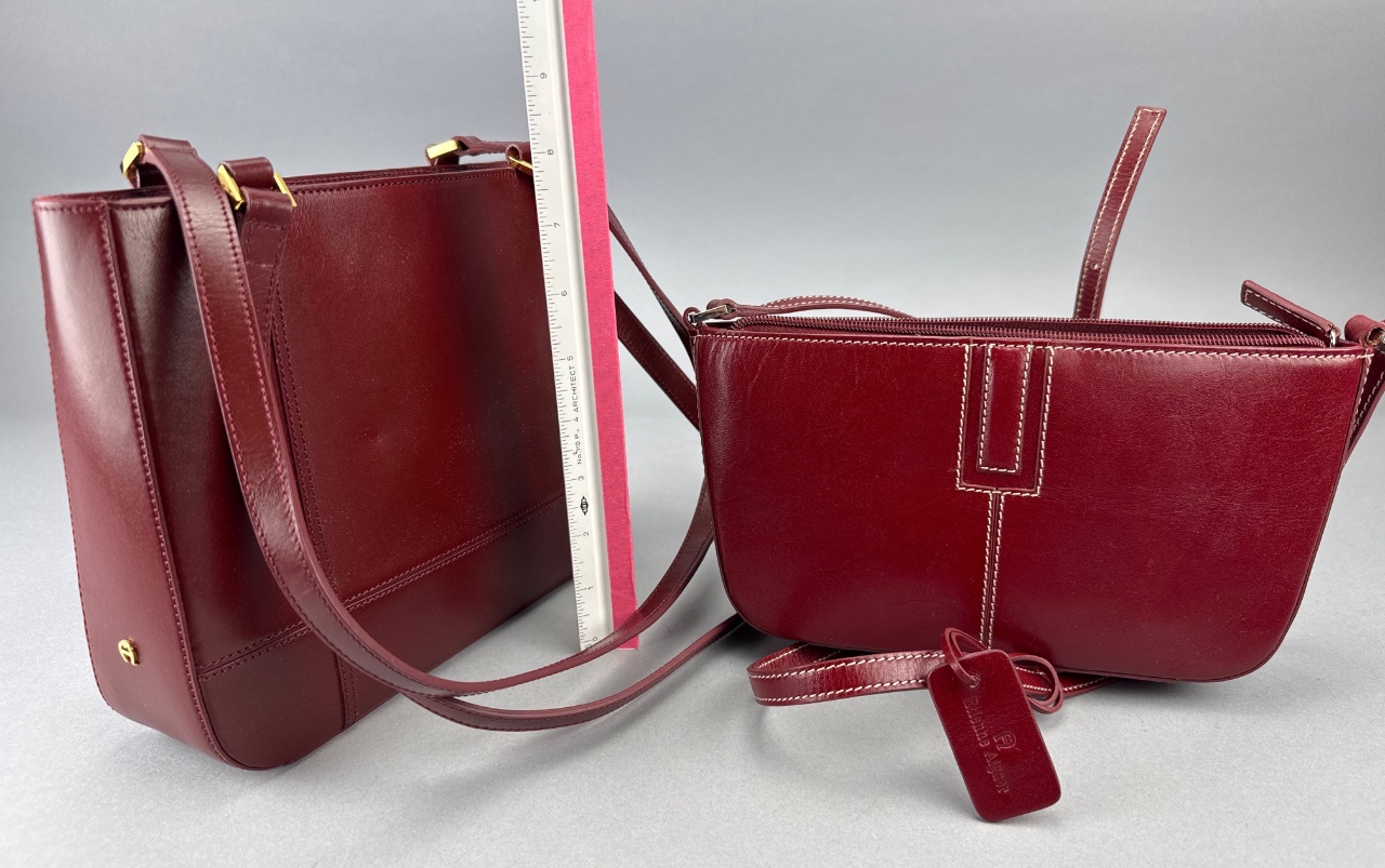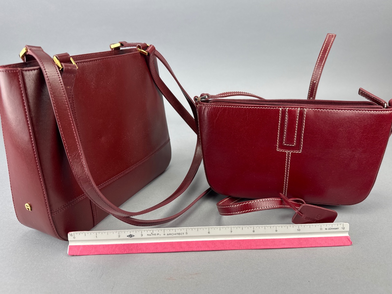 Étienne Aigner leather handbag and pouch set in burgundy. The set includes two bags: a square-shaped handbag with a flat base, long shoulder strap, and gold-tone hardware attachment, and a rectangular pouch with a zip closure, shorter strap, and leather tag bearing the brand name. Both bags feature visible stitching details. CONDITION: Condition not assessed. SHIPPING: In-House Shipping Available