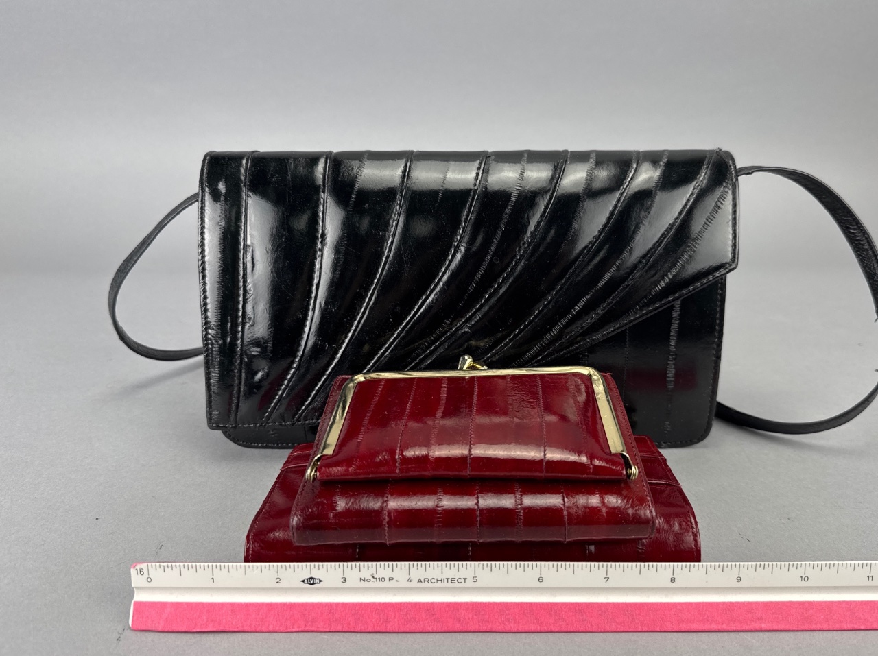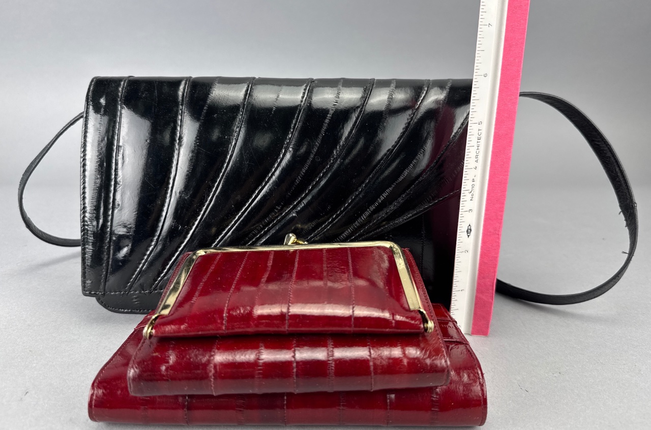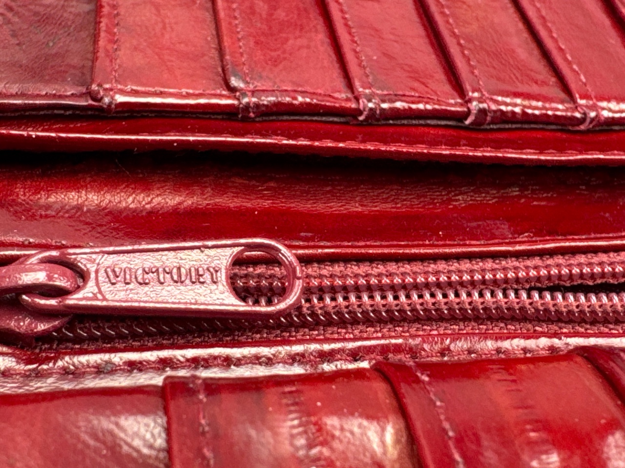 Lot of three leather wallets or purses by VIC TORY, including one black wallet with a textured pleated design and shoulder strap, and two red wallets with ribbed texture. One red wallet features a clasp, while the other has a zipper pull marked ‘VIC TORY’. Gold-tone hardware is visible on the red wallets. CONDITION: Condition not assessed. SHIPPING: In-House Shipping Available