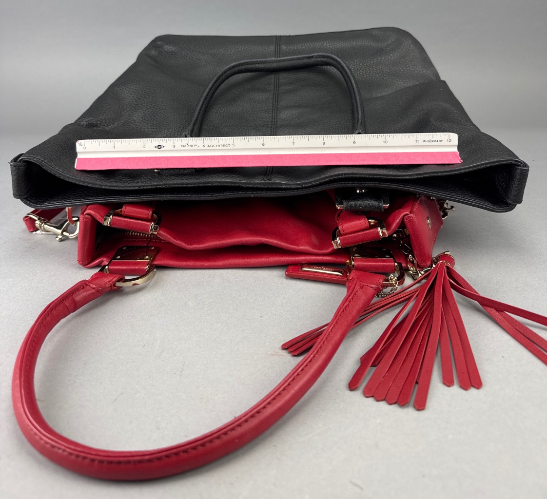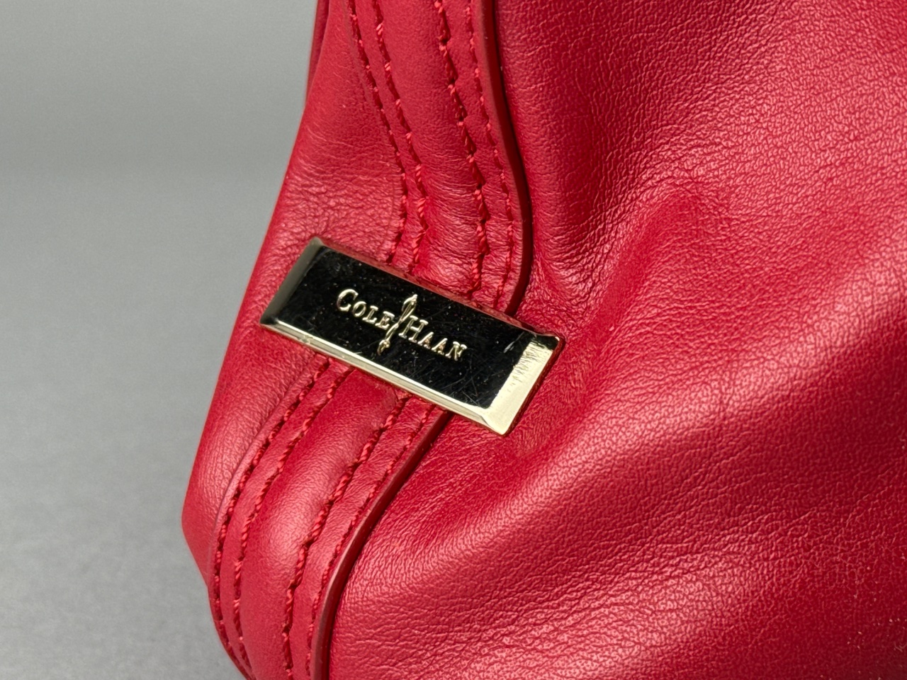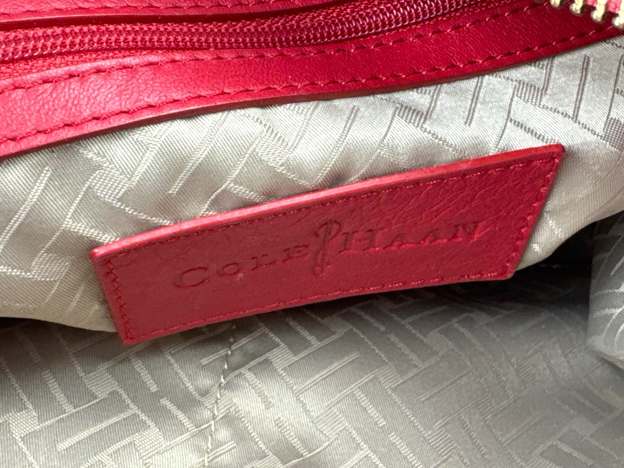 Cole Haan red leather handbag featuring gold-tone hardware and a rectangular plaque with ‘COLE HAAN’ script on black enamel ground. The interior label also reads ‘COLE HAAN,’ confirming the maker. Accompanied by a black leather tote bag with an unreadable logo and a pink fabric pouch with a zipper pull marked ‘TRINA.’ CONDITION: Condition not assessed. SHIPPING: In-House Shipping Available