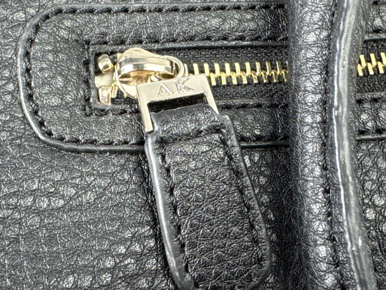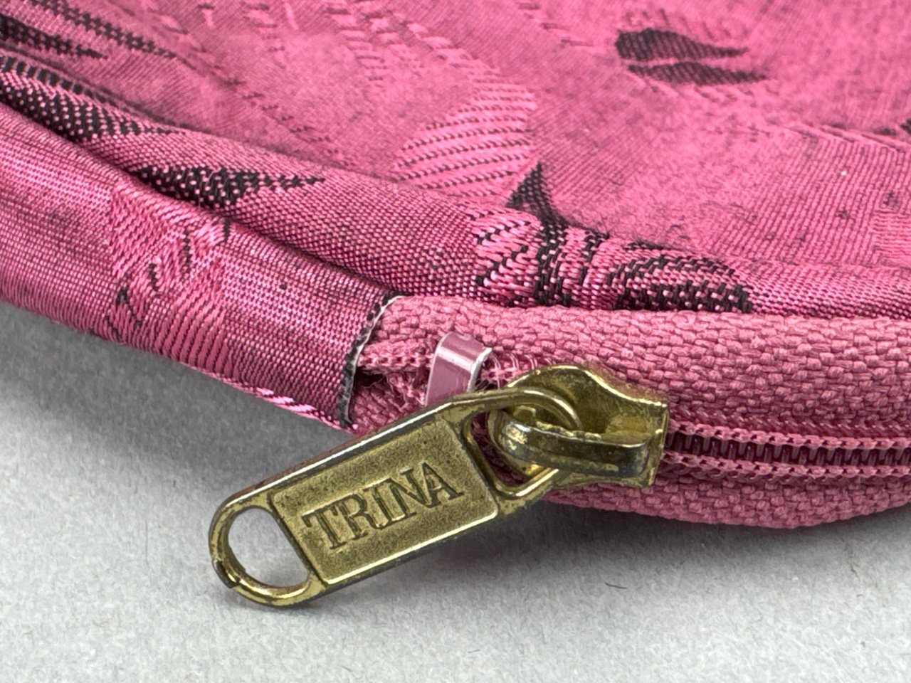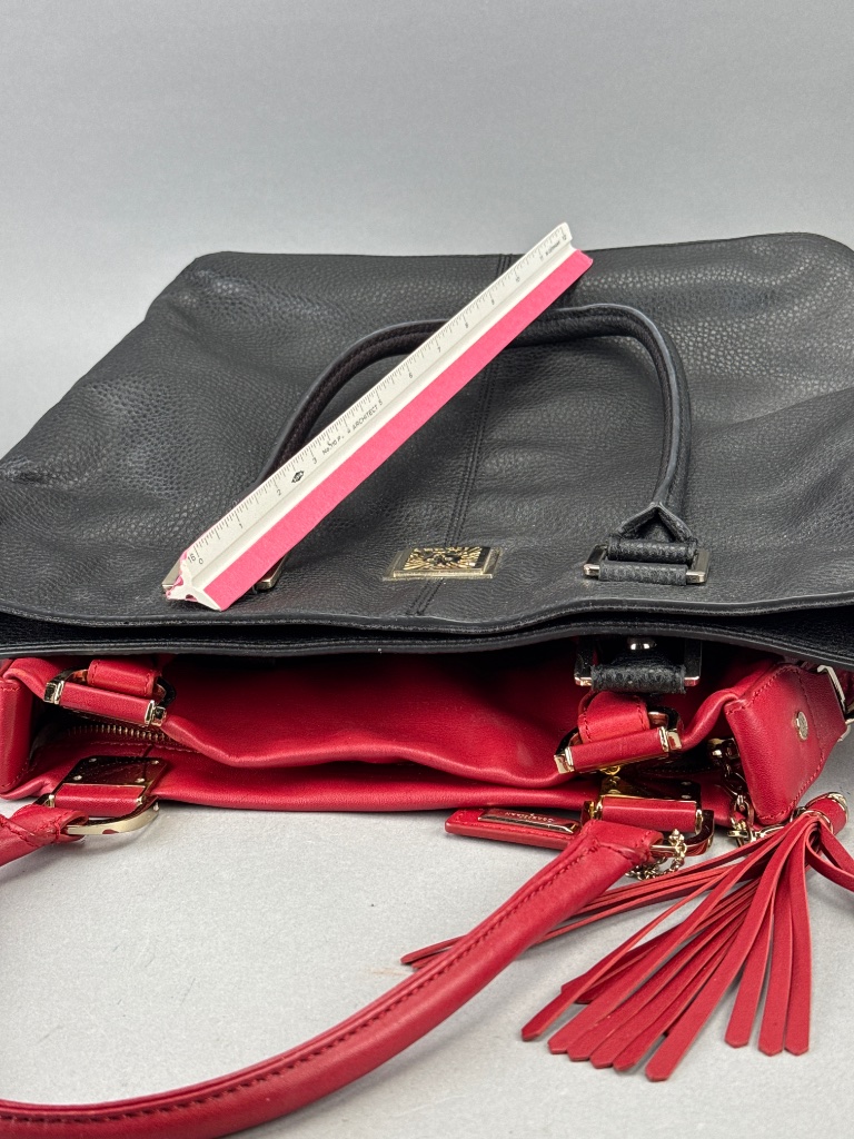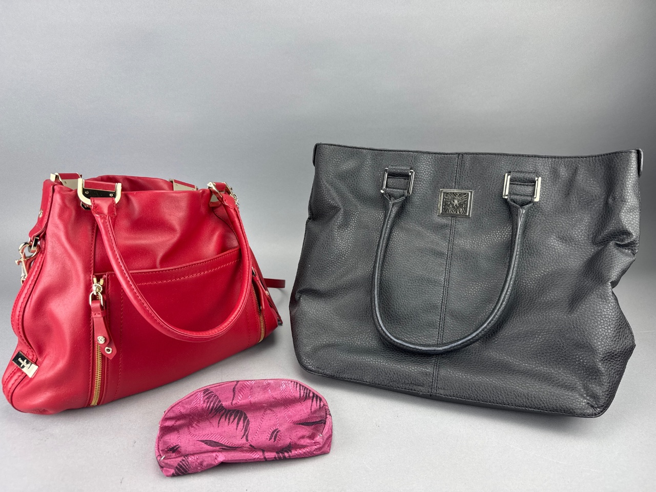 Cole Haan red leather handbag featuring gold-tone hardware and a rectangular plaque with ‘COLE HAAN’ script on black enamel ground. The interior label also reads ‘COLE HAAN,’ confirming the maker. Accompanied by a black leather tote bag with an unreadable logo and a pink fabric pouch with a zipper pull marked ‘TRINA.’ CONDITION: Condition not assessed. SHIPPING: In-House Shipping Available