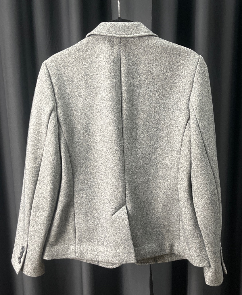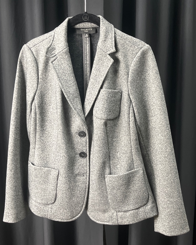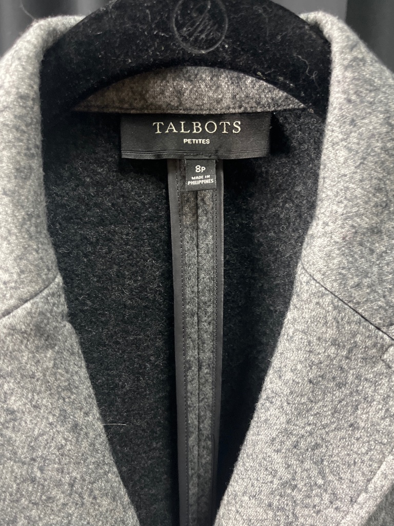 Talbots gray blazer in textured fabric, petites size 8P. Features two front pockets with rounded flaps and three buttons on the front. Label reads ‘TALBOTS PETITES’; size label reads ‘8P’; made in the Philippines. CONDITION: Condition not assessed. SHIPPING: In-House Shipping Available