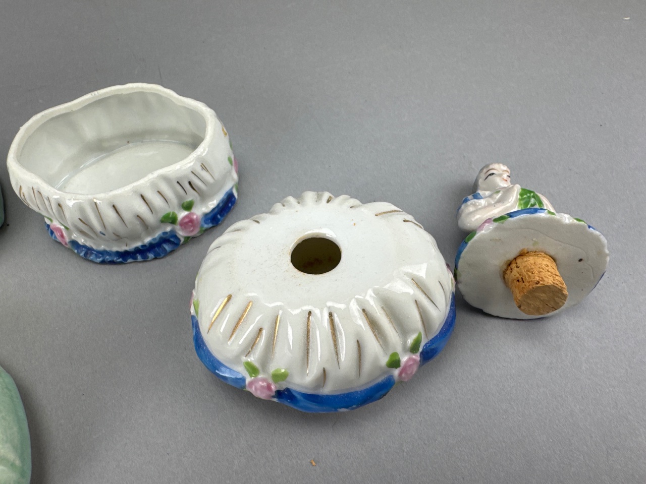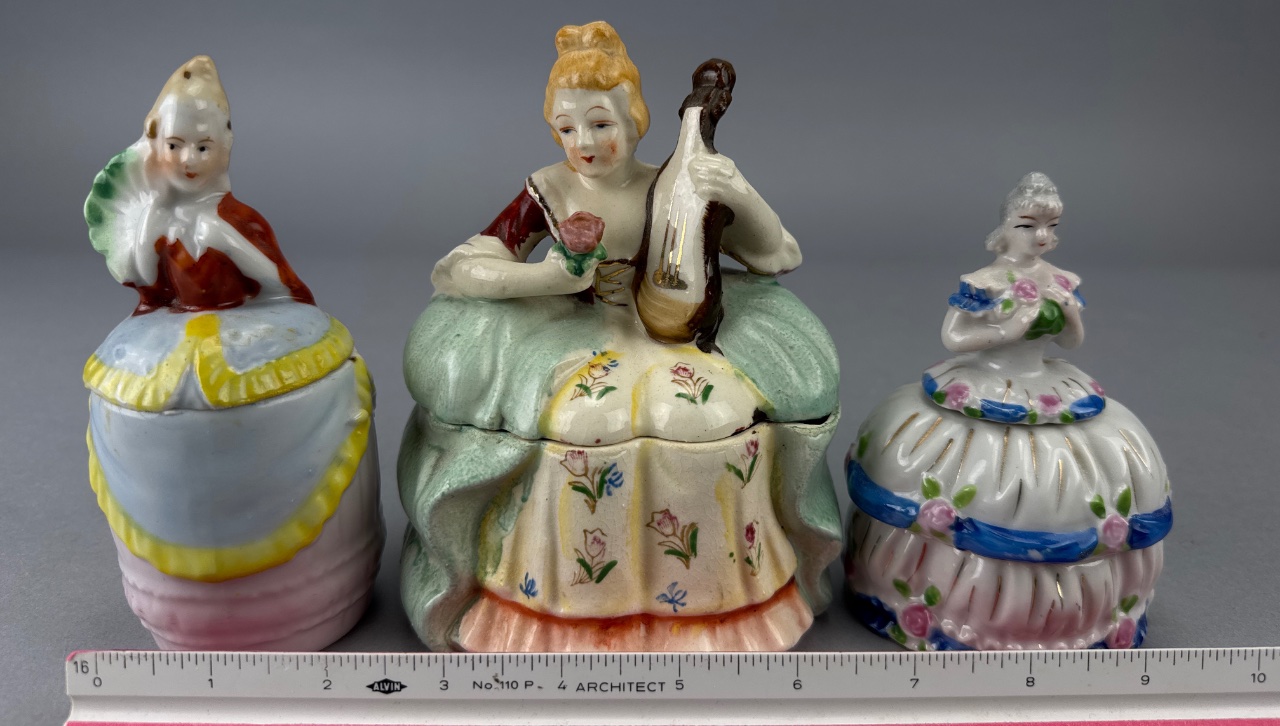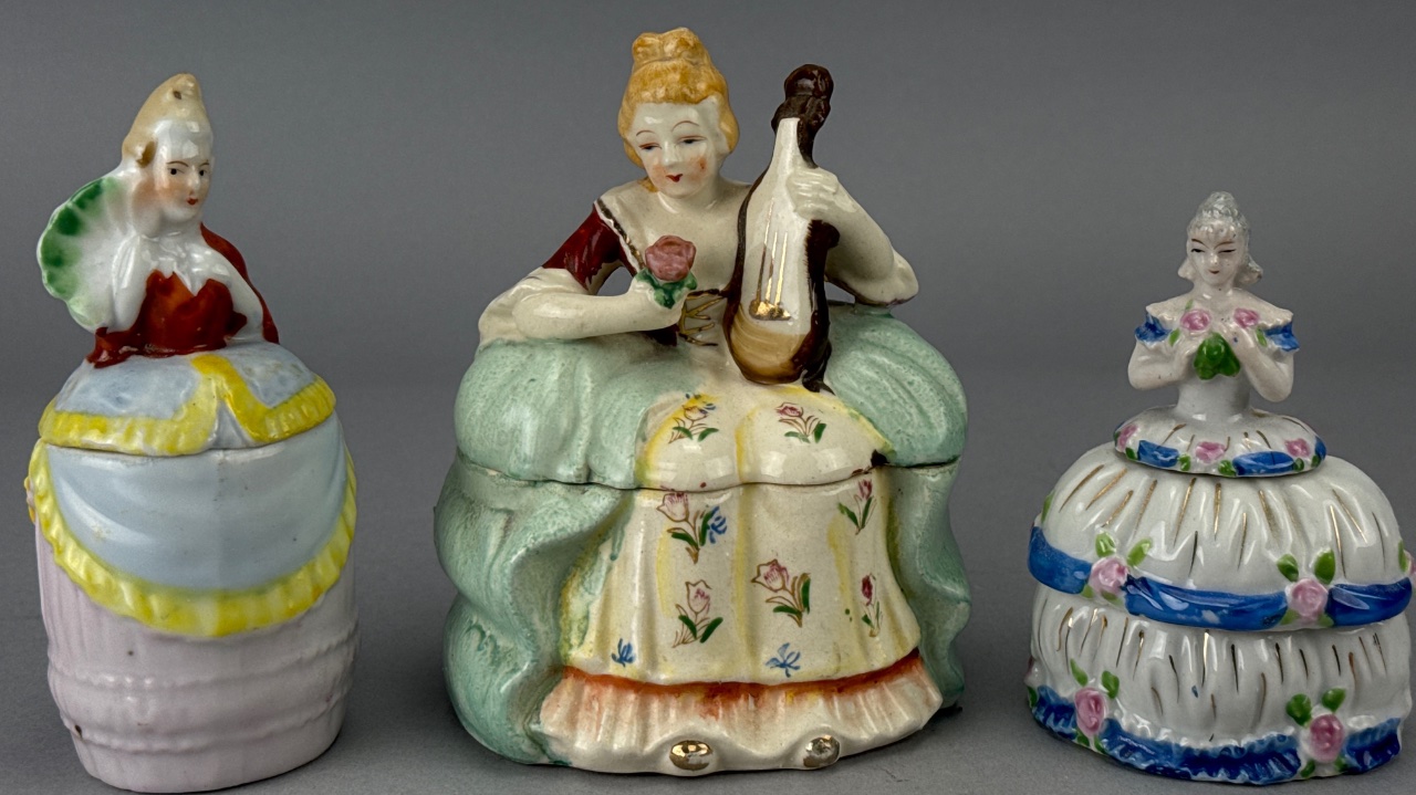 Three Ceramic Figurines with Removable Tops, Hand-Painted Details