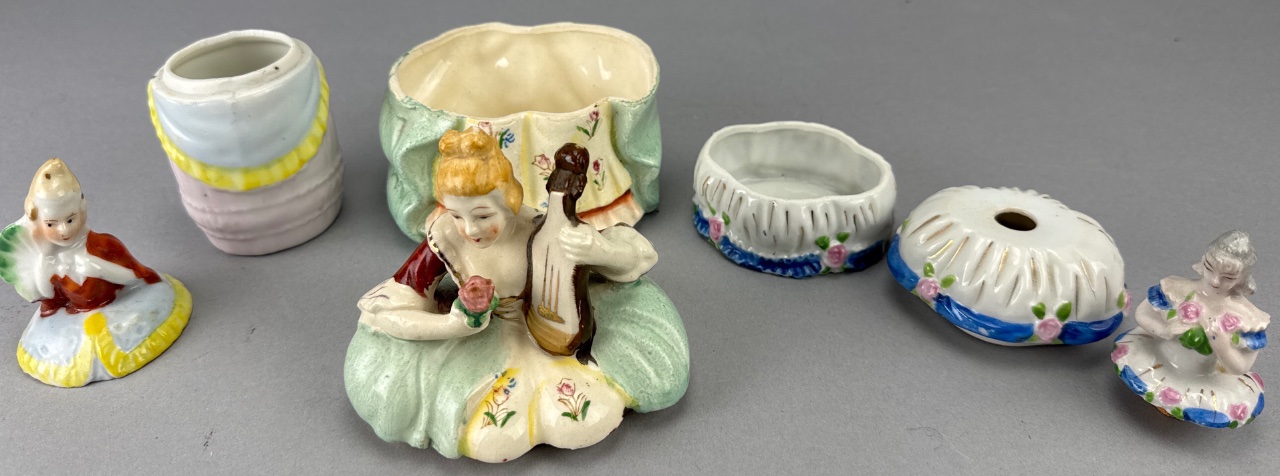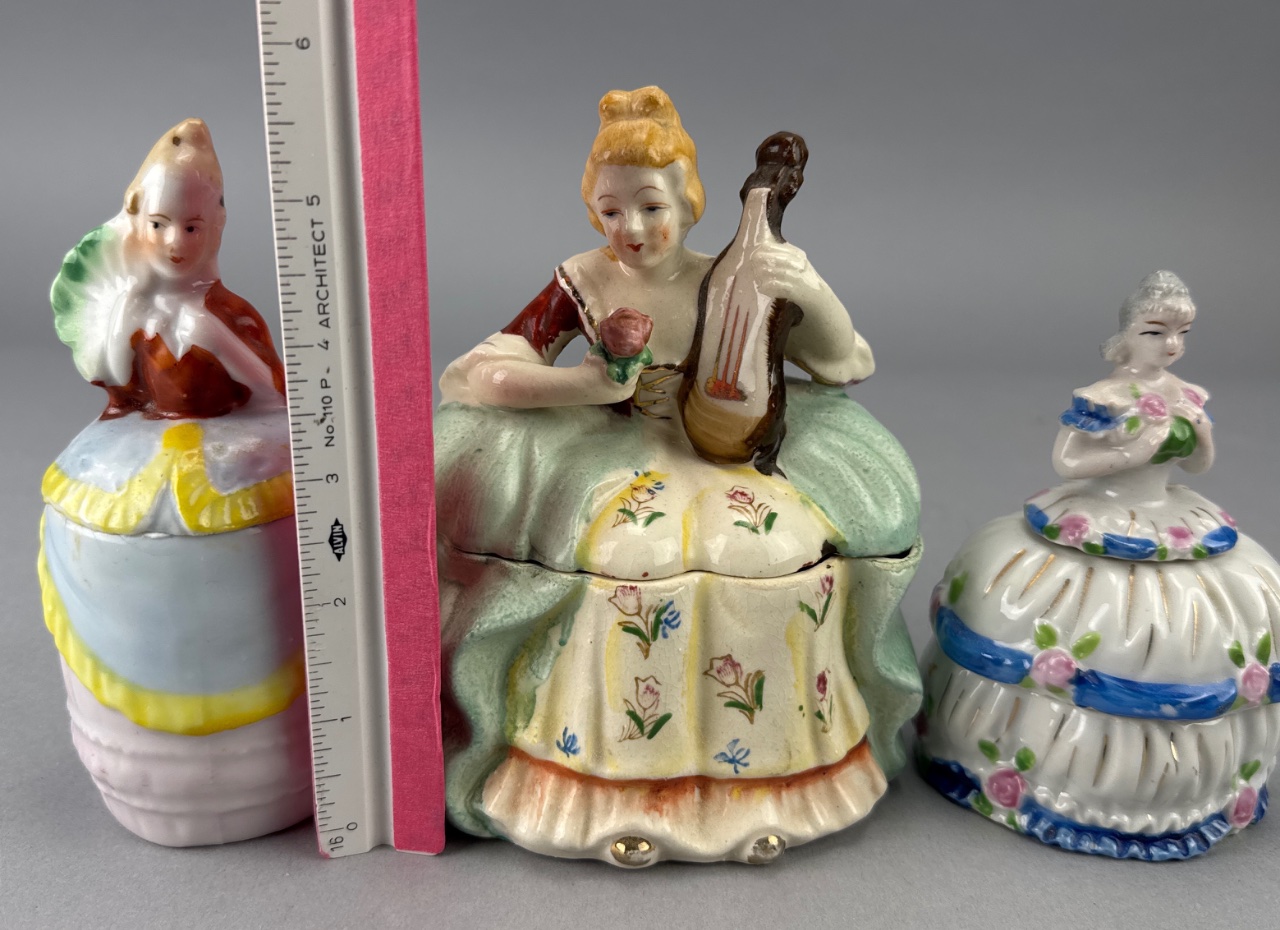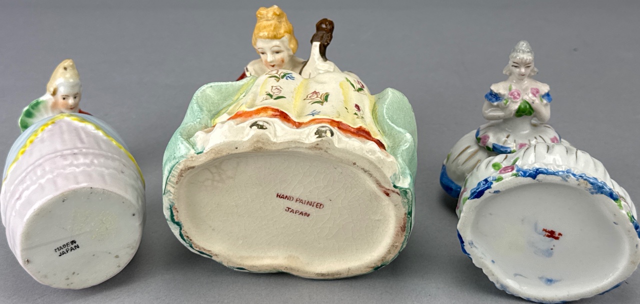 Set of three ceramic figurines with removable tops, hand-painted details, and marked ‘HAND PAINTED JAPAN’ and ‘MADE IN JAPAN’ on two bases. The center figurine depicts a woman playing a stringed instrument, the left figurine features a floral design and colorful dress, and the right figurine is three-tiered with floral decorations and a removable cork top. Taller figurine measure 5.5″H. CONDITION: No visible chips or cracks observed. Minor paint wear on edges. SHIPPING: In-House Shipping Available