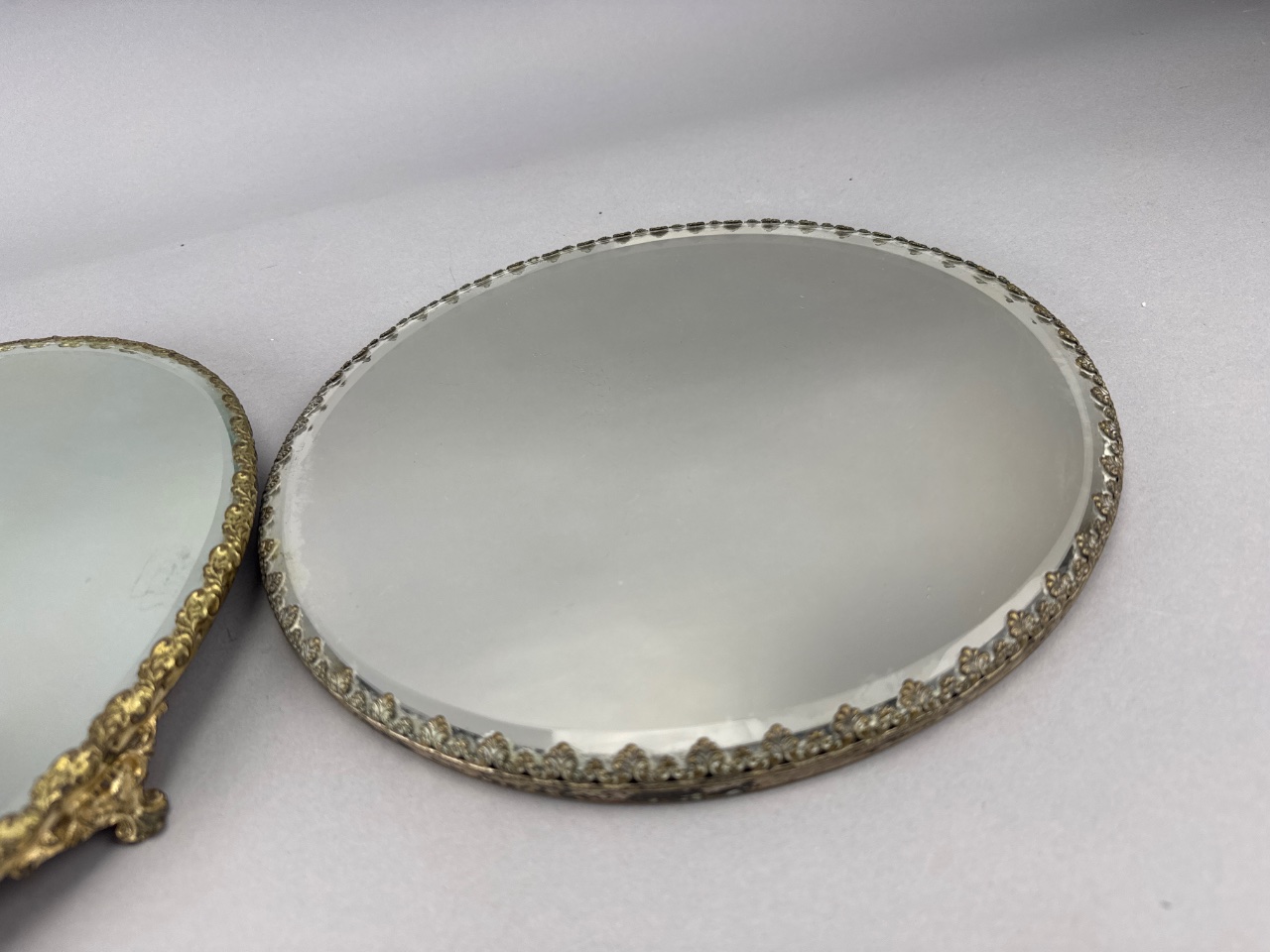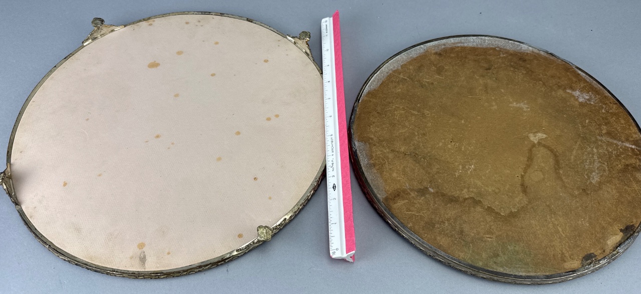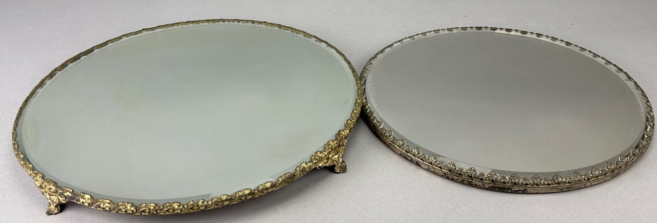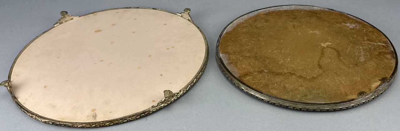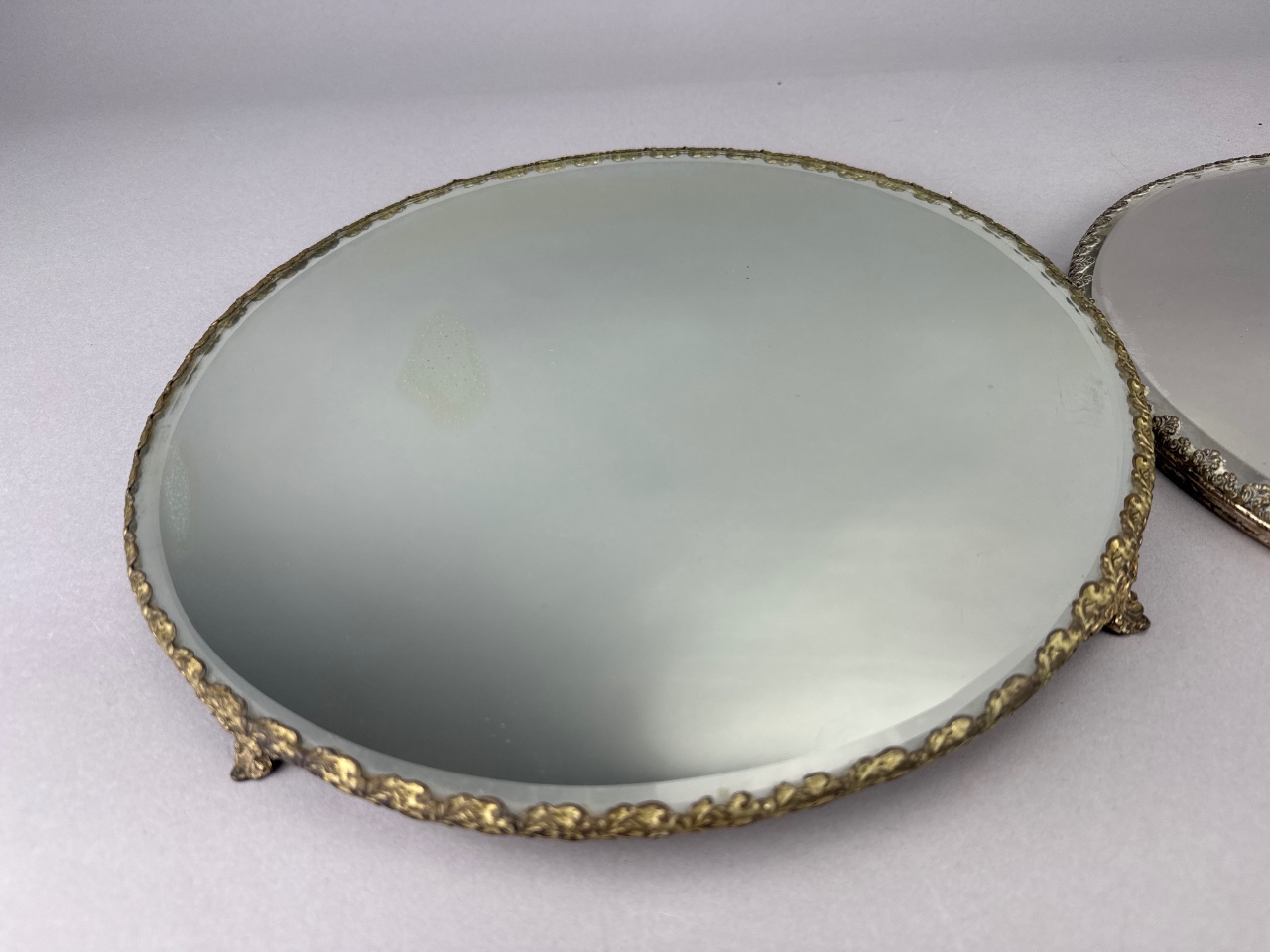Pair of round decorative mirrors with ornate metal frames. One mirror features a gold-tone decorative border and a fabric-covered base, while the other has a brown backing. Both mirrors have reflective glass surfaces. Measure 10″-12″. CONDITION: Minor wear on the metal frames and some discoloration on the fabric backing. SHIPPING: In-House Shipping Available
