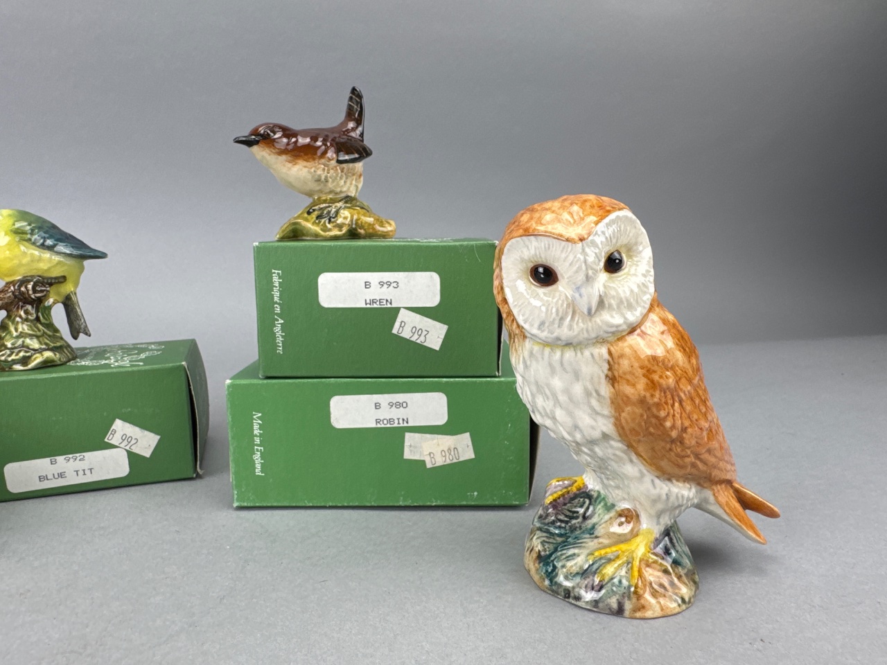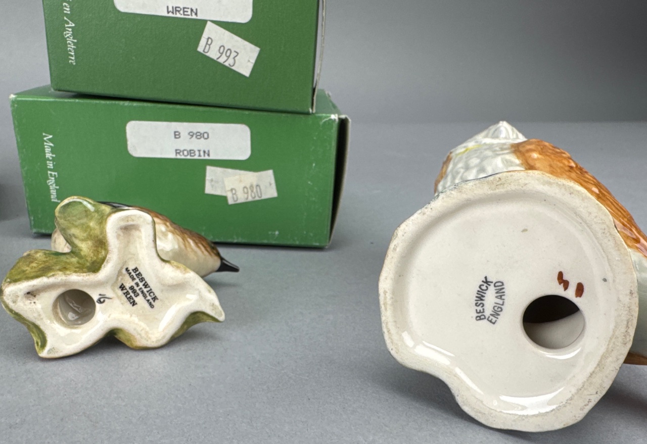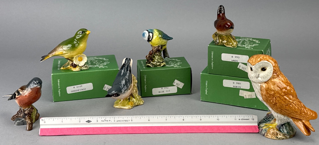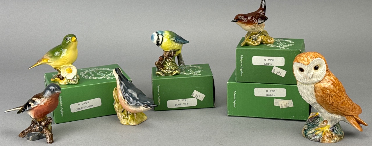 Group of Beswick ceramic bird figurines including Greenfinch (B 2105), Blue Tit (B 992), Wren (B 993), Robin (B 980), Owl, Chaffinch, and Nuthatch. Bases marked ‘BESWICK ENGLAND’ with corresponding model numbers. The Robin box is empty, and the Owl does not include a box. Measure about 3″-5″. CONDITION: Condition not assessed. SHIPPING: In-House Shipping Available