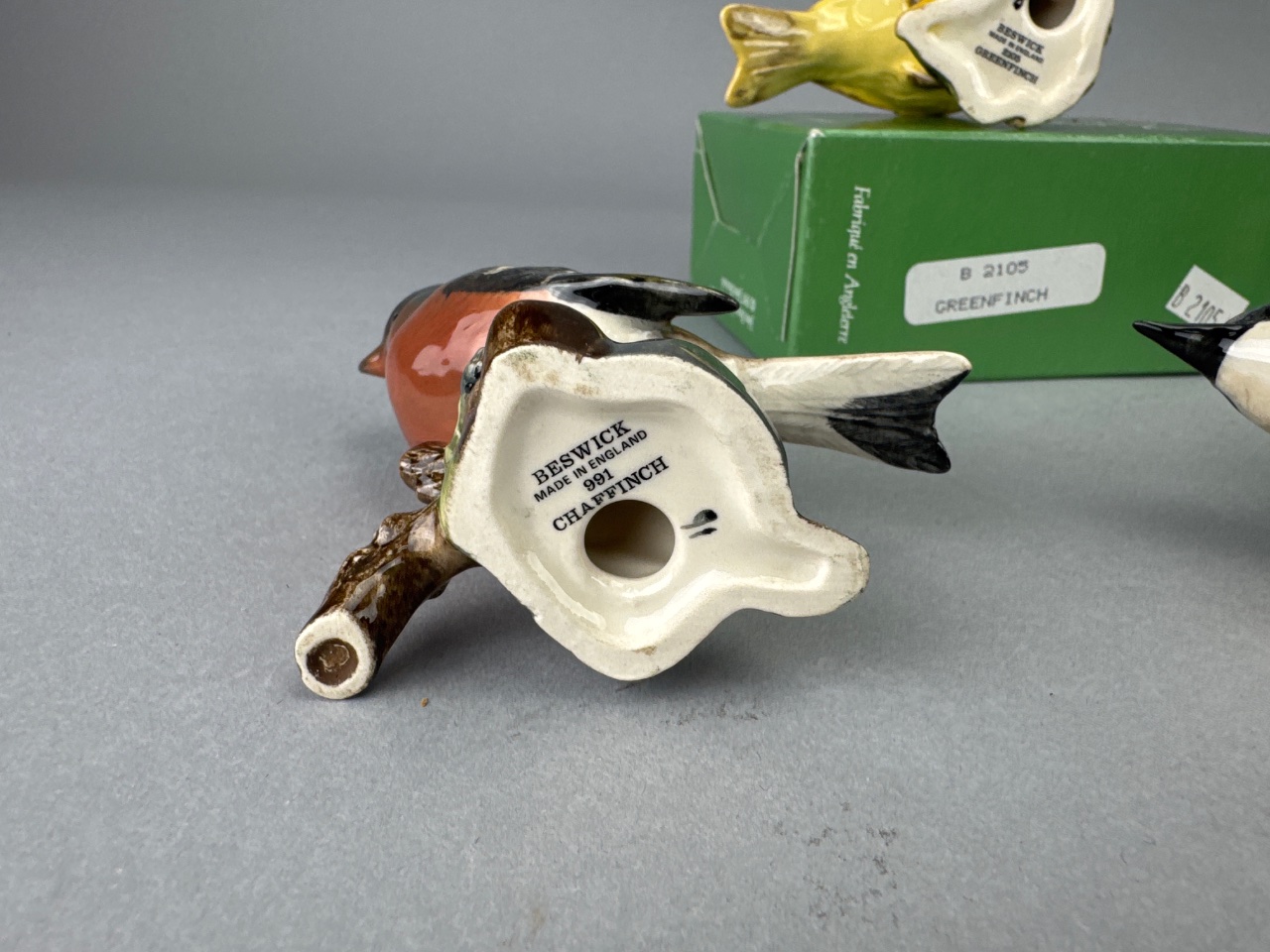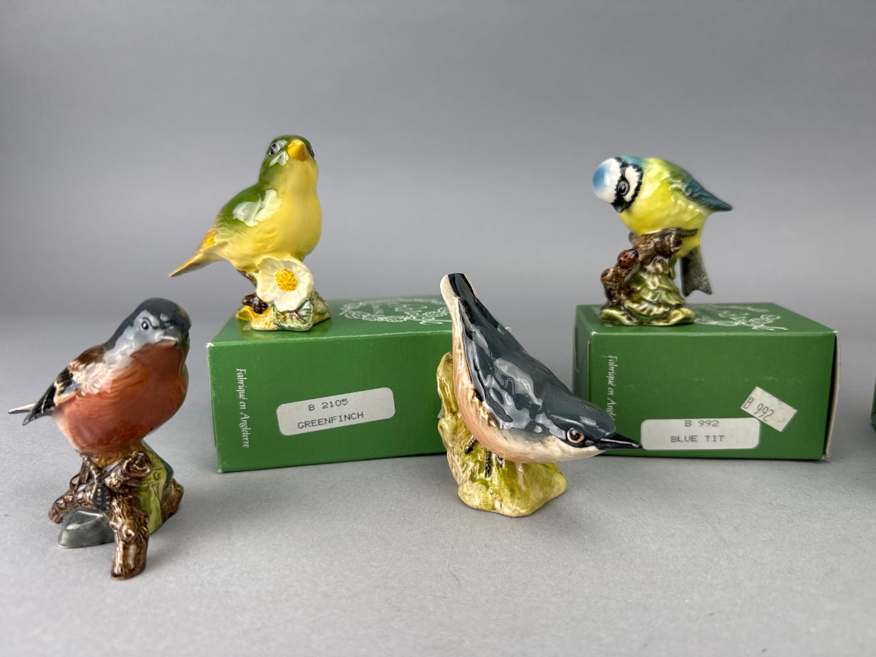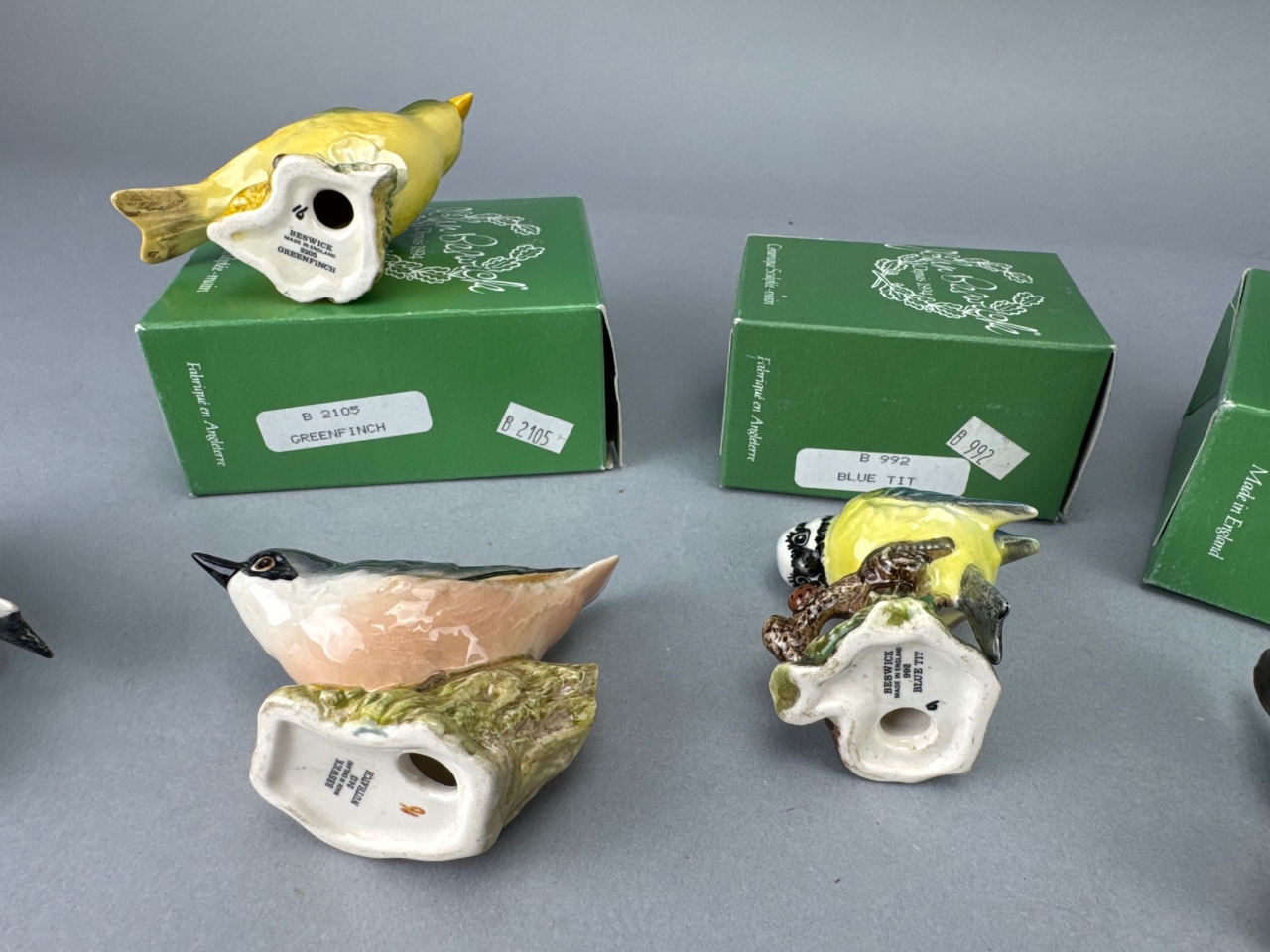 Group of Beswick ceramic bird figurines including Greenfinch (B 2105), Blue Tit (B 992), Wren (B 993), Robin (B 980), Owl, Chaffinch, and Nuthatch. Bases marked ‘BESWICK ENGLAND’ with corresponding model numbers. The Robin box is empty, and the Owl does not include a box. Measure about 3″-5″. CONDITION: Condition not assessed. SHIPPING: In-House Shipping Available
