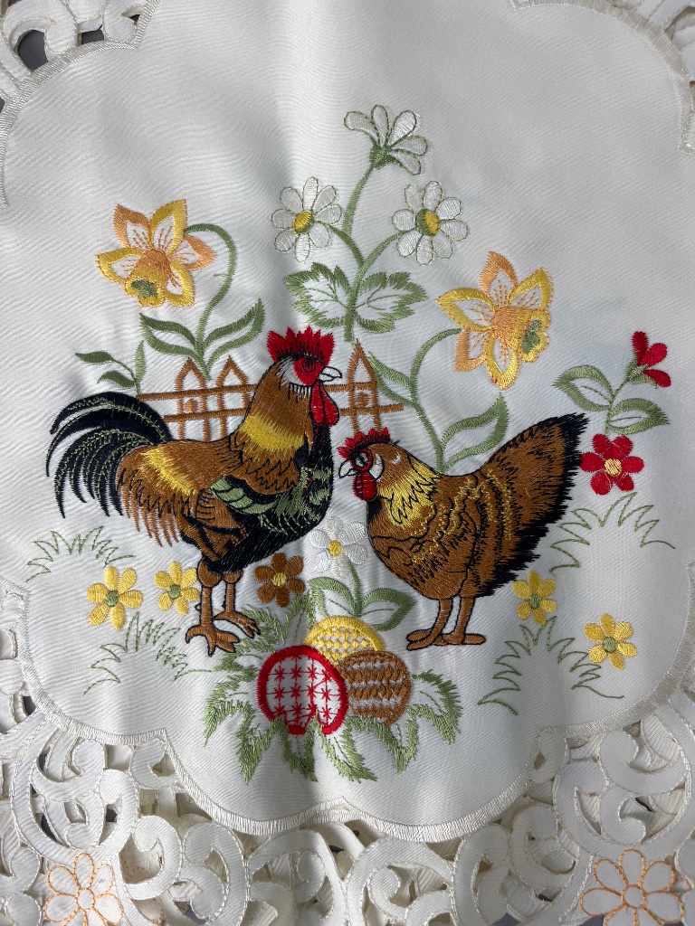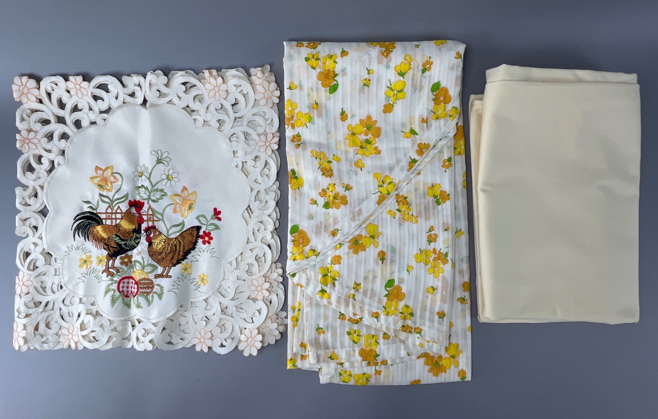 Embroidered tablecloth with scalloped edge featuring chickens and flowers. Includes yellow floral patterned fabric with vertical stripes and solid cream-colored fabric folded neatly. CONDITION: Condition not assessed. SHIPPING: In-House Shipping Available