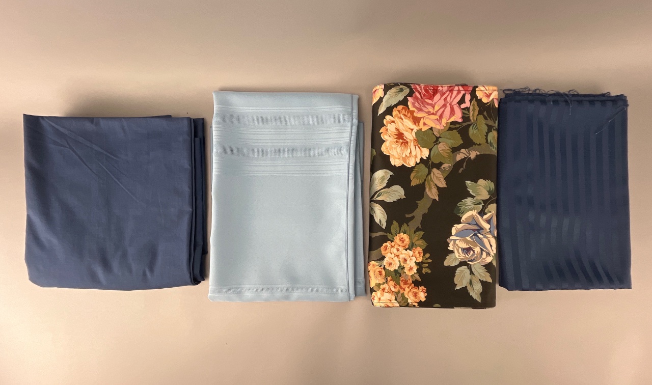 Group of assorted fabric pieces including solid dark blue, light blue with horizontal stripes, floral rose-patterned on a dark background, and dark blue with vertical stripes. Suitable for quilting, sewing, or craft projects. CONDITION: Condition not assessed. SHIPPING: In-House Shipping Available