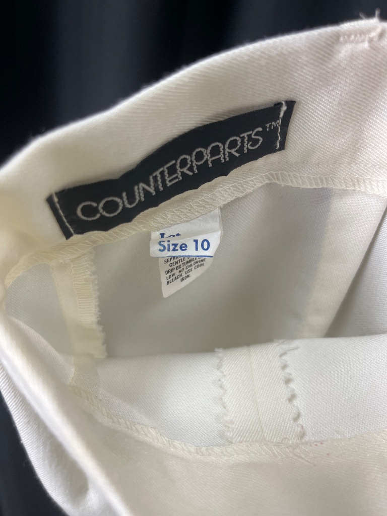 COUNTERPARTS white pleated skirt with front zipper closure and two waist buttons. Label inside reads ‘COUNTERPARTS’ and size label reads ‘Size 10’. CONDITION: Condition not assessed. SHIPPING: In-House Shipping Available