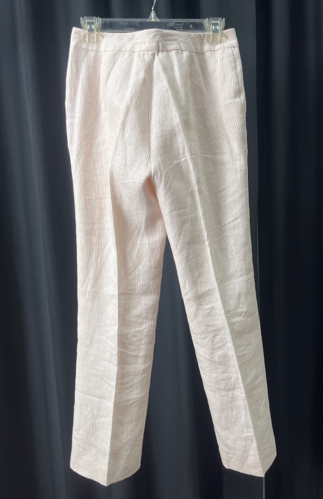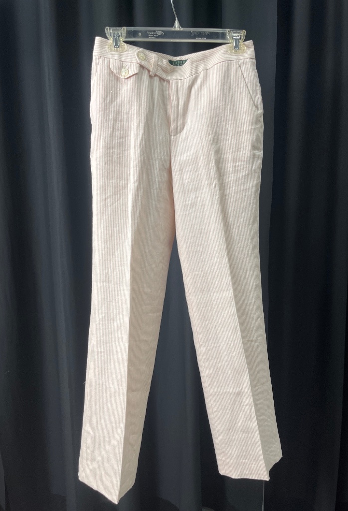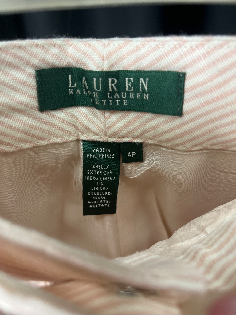 Lauren Ralph Lauren petite linen pants in light pink and white striped fabric. Features two front pockets, button closure at the waist, and a label reading ‘LAUREN RALPH LAUREN 4 PETITE’. Shell fabric is 100% linen, lining is 100% acetate. Made in the Philippines. CONDITION: Condition not assessed. SHIPPING: In-House Shipping Available