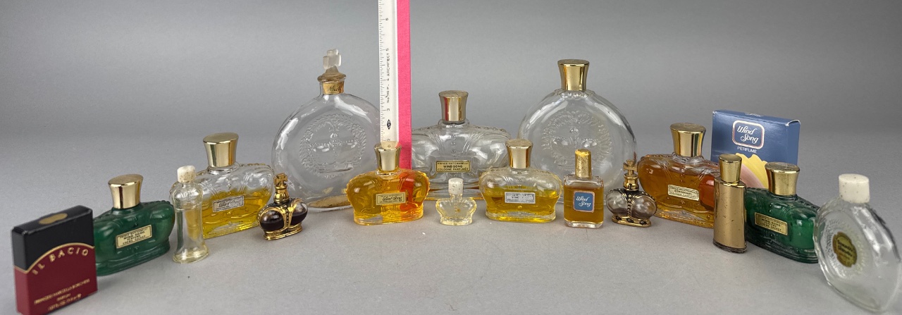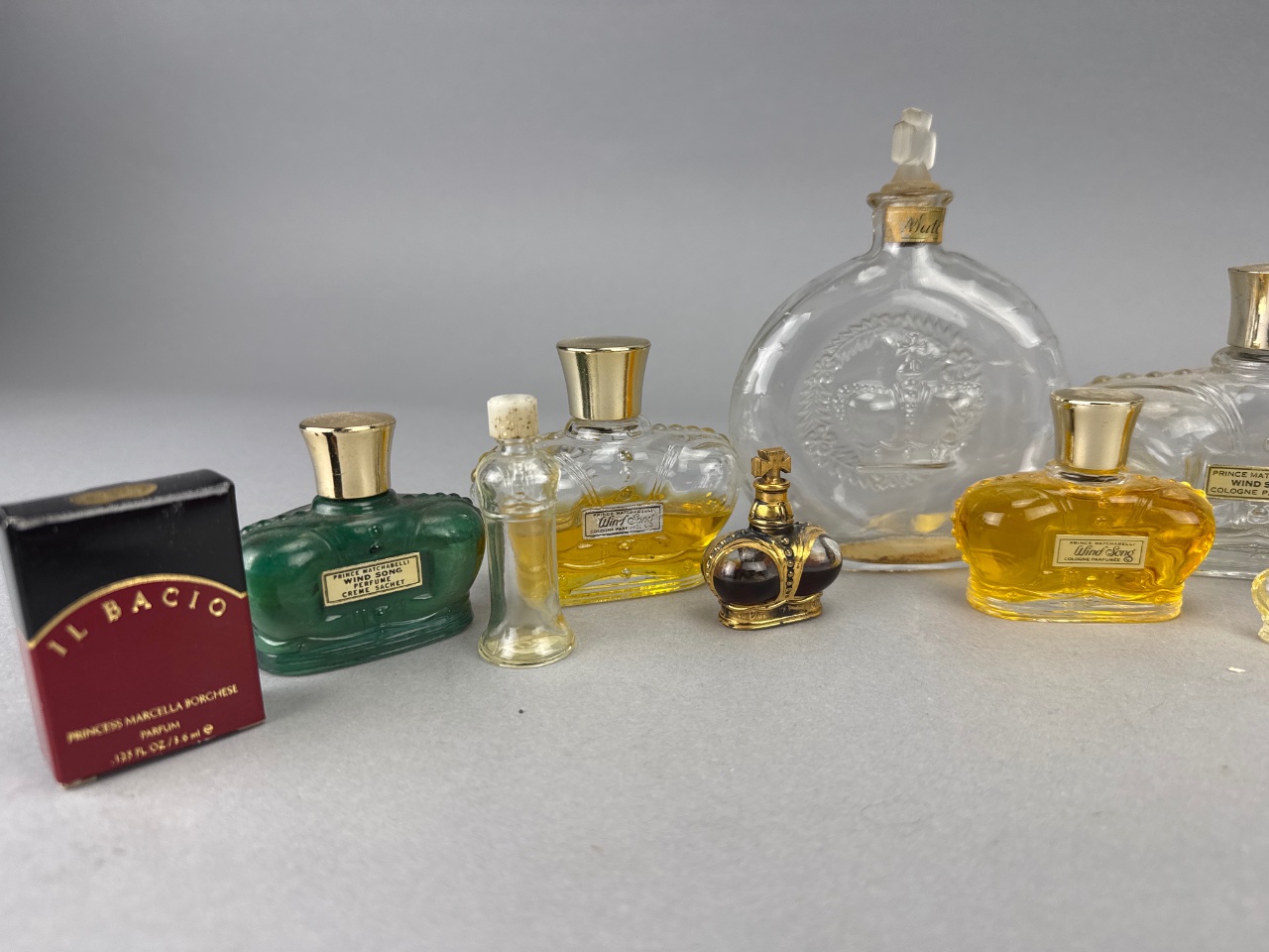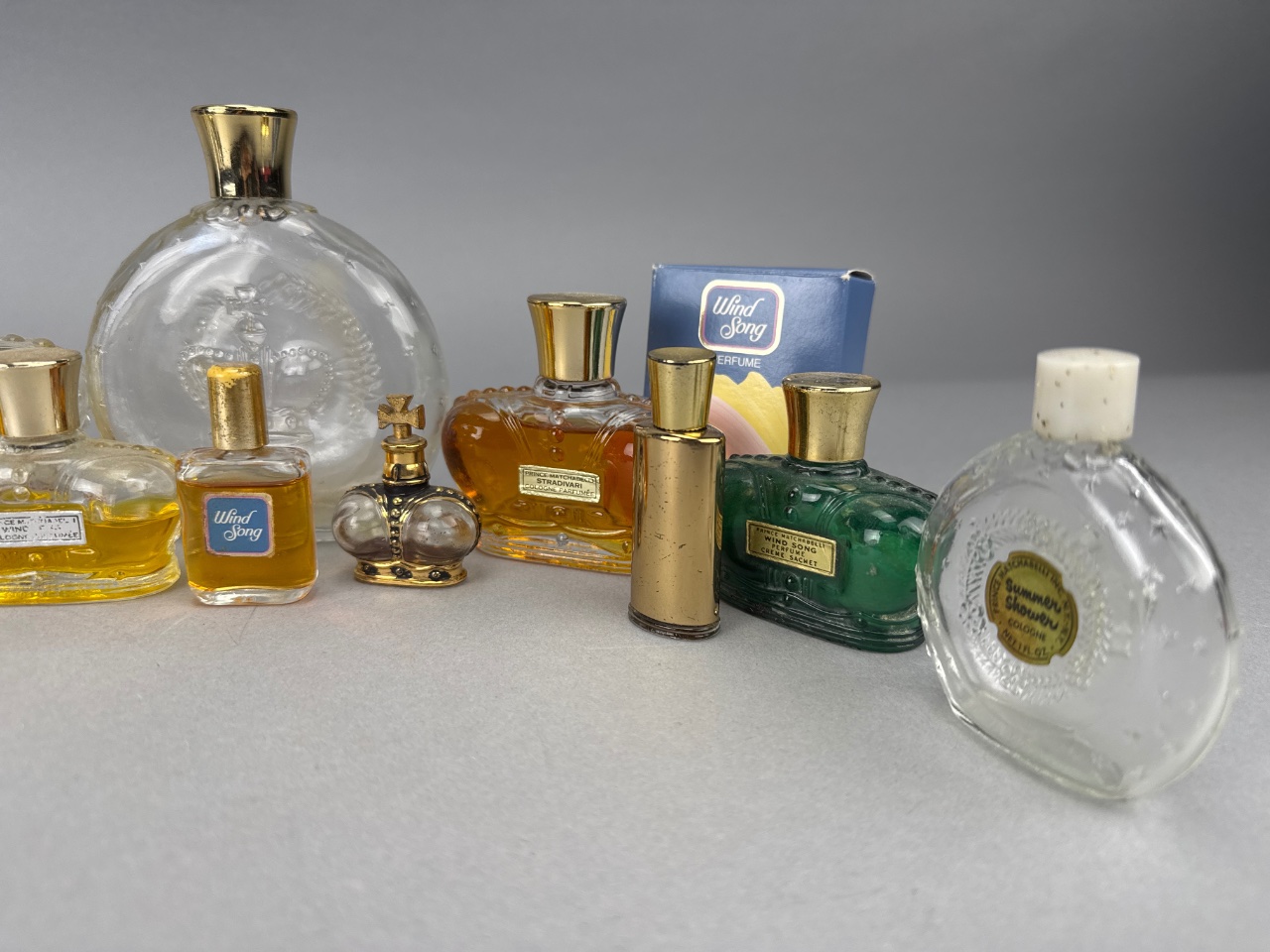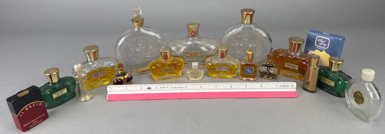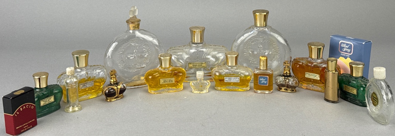 Assorted collection of glass perfume bottles, including examples with visible text reading ‘Wind Song’ and ‘Il Bacio.’ The grouping features various shapes and sizes, decorative caps, and bottles containing yellow or amber liquid. One bottle has a crown-shaped cap, and another is clear with an embossed design. Includes a box labeled ‘Wind Song Perfume.’ Taller bottle measure 5"H. CONDITION: Fragrance contents have not been tested or evaluated. Due to age and storage conditions, scents may have degraded, altered, or dissipated. These items are being sold as-is, with primary value attributed to the bottle and display qualities rather than the fragrance itself. No guarantees are made regarding scent, usability, or condition of contents.