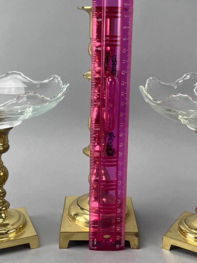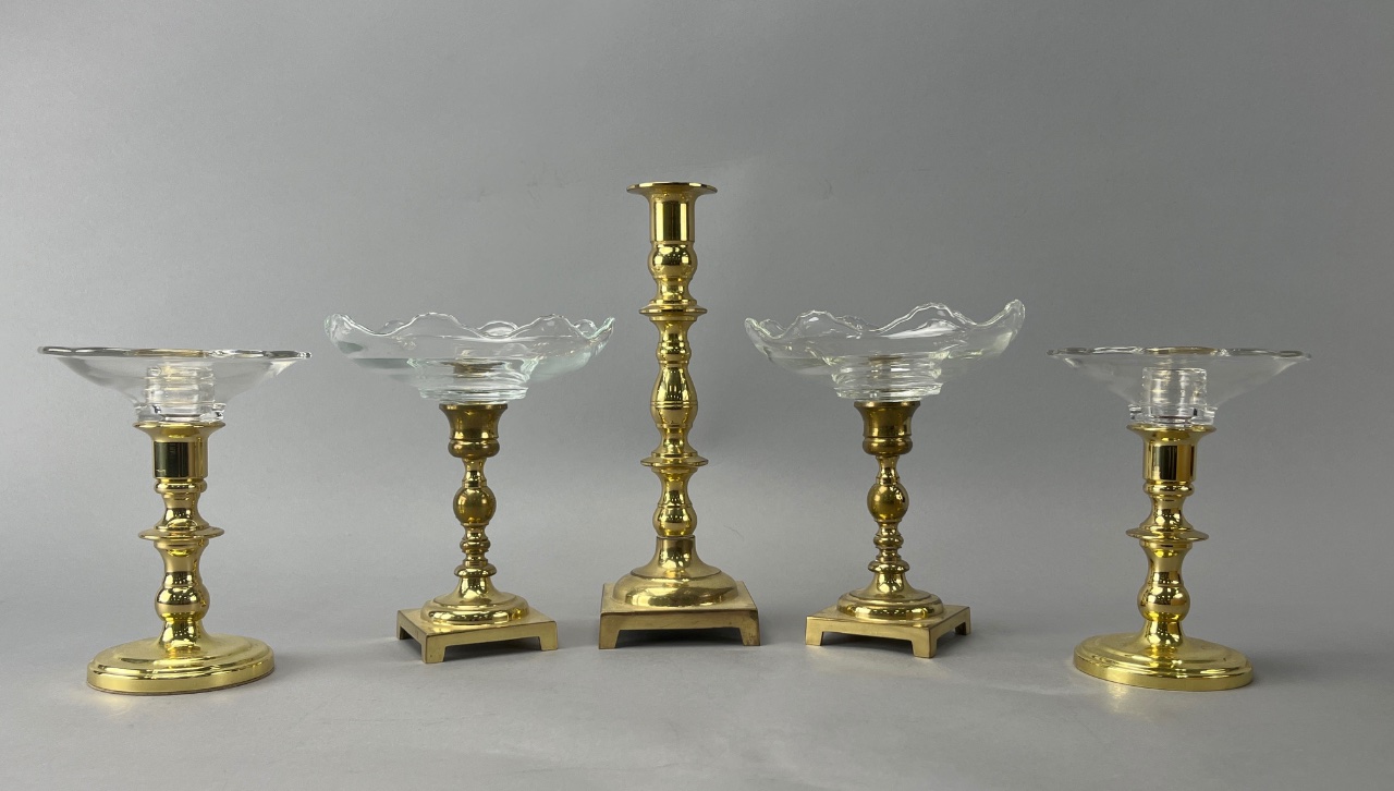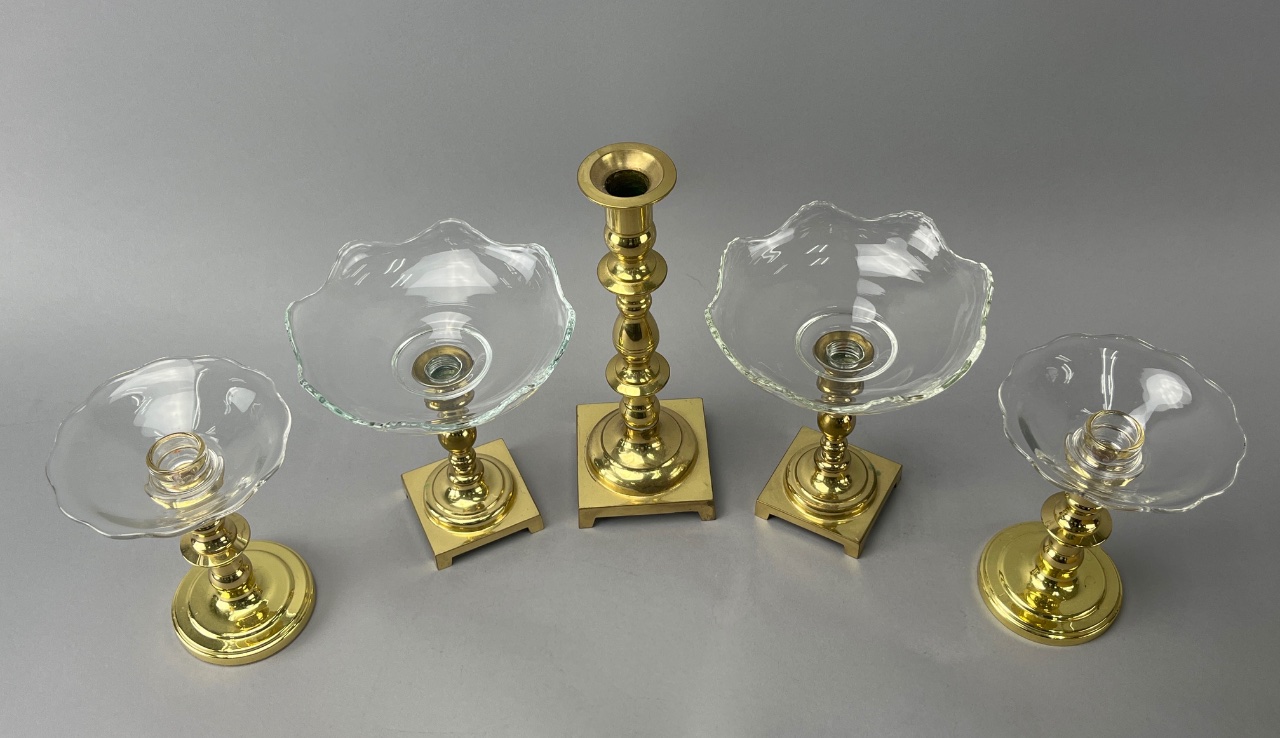 Grouping of brass and glass candlestick and bowl set, featuring two scalloped-edge glass bowls on square brass bases, one brass candlestick with a fluted design and round top, and two additional brass bases with glass bowls on top. Brass bases are square-shaped with flat bottoms. Tall candlestick measures 9.25″H. CONDITION: Condition not assessed. SHIPPING: In-House Shipping Available