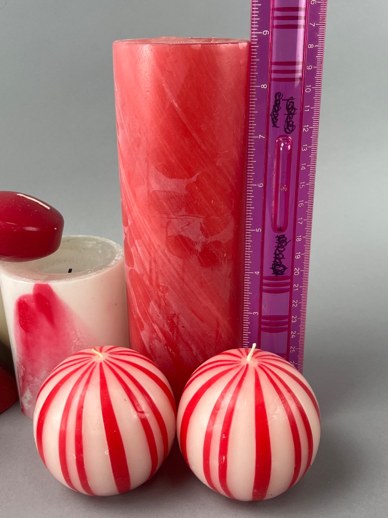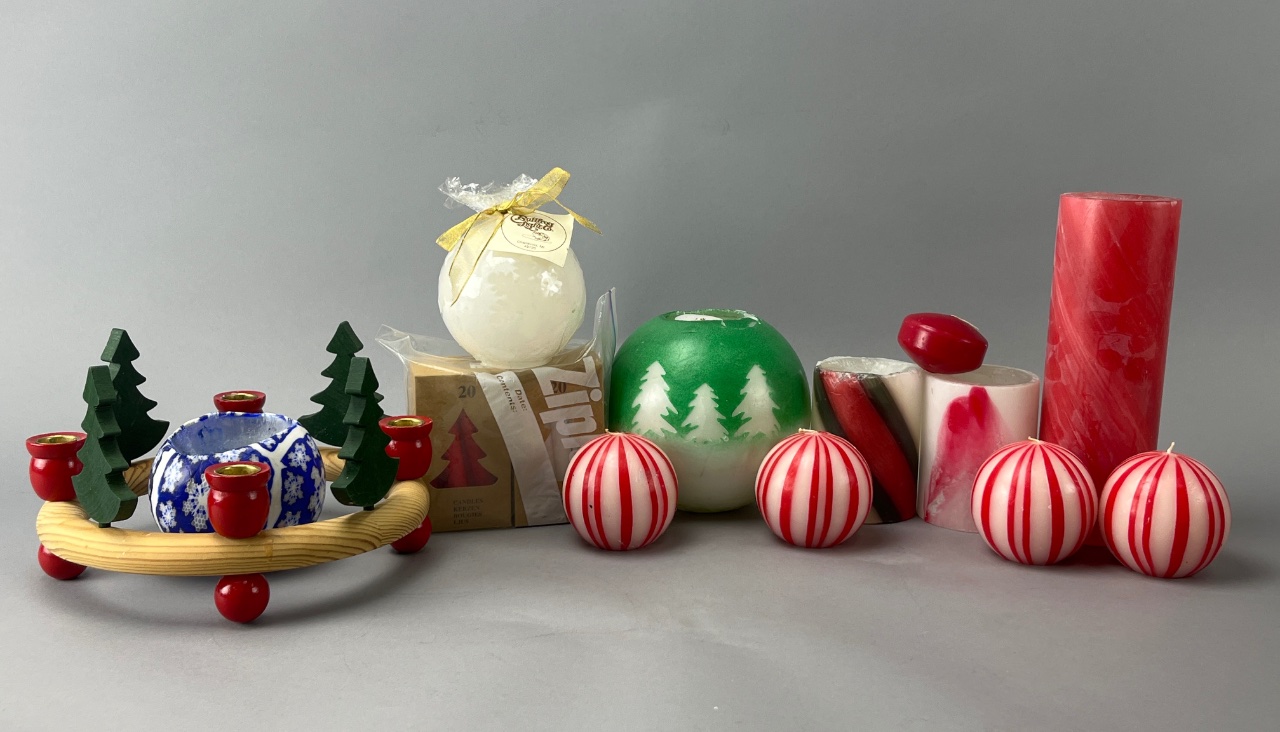 Assorted candles in various shapes and colors, including green candles with white tree designs, red and white striped round candles, and red cylindrical candles with a marbled finish. Accompanied by a wooden candle holder featuring green trees with red bases. Packaged candles include a box with a tree graphic and a ’20 count’ reference. Taller candle measure about 9″H. CONDITION: Condition not assessed. SHIPPING: In-House Shipping Available