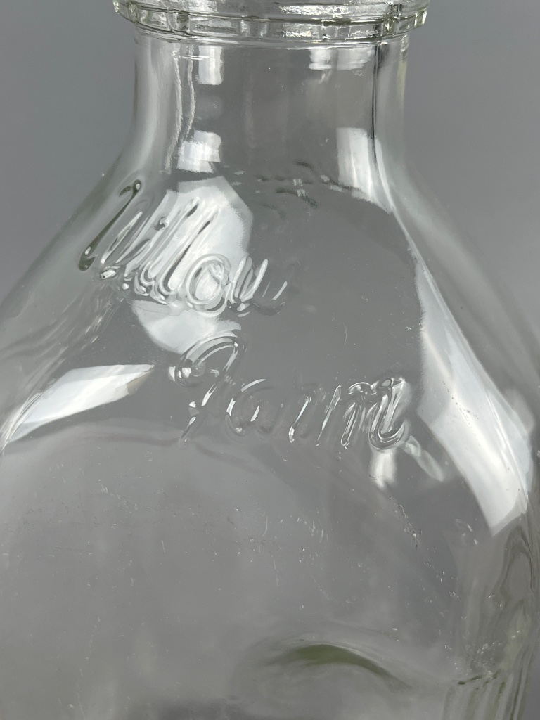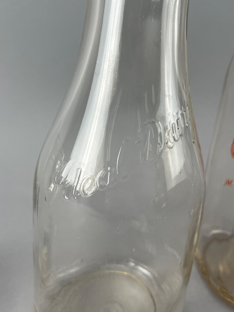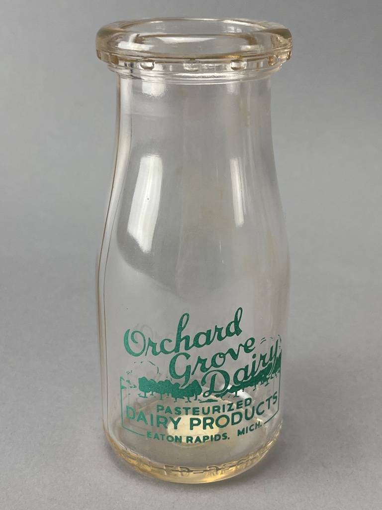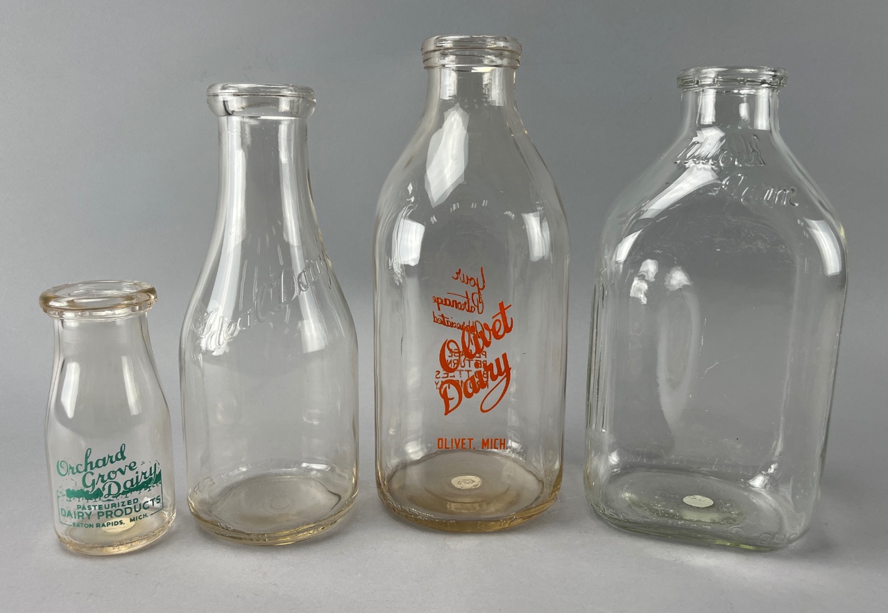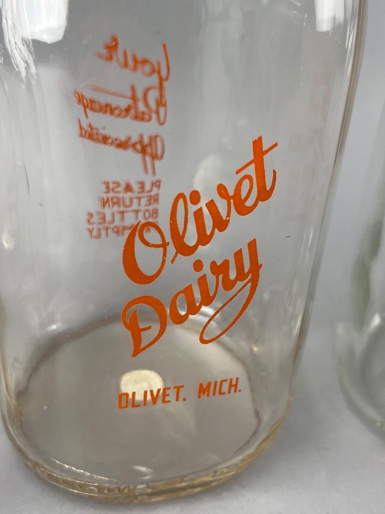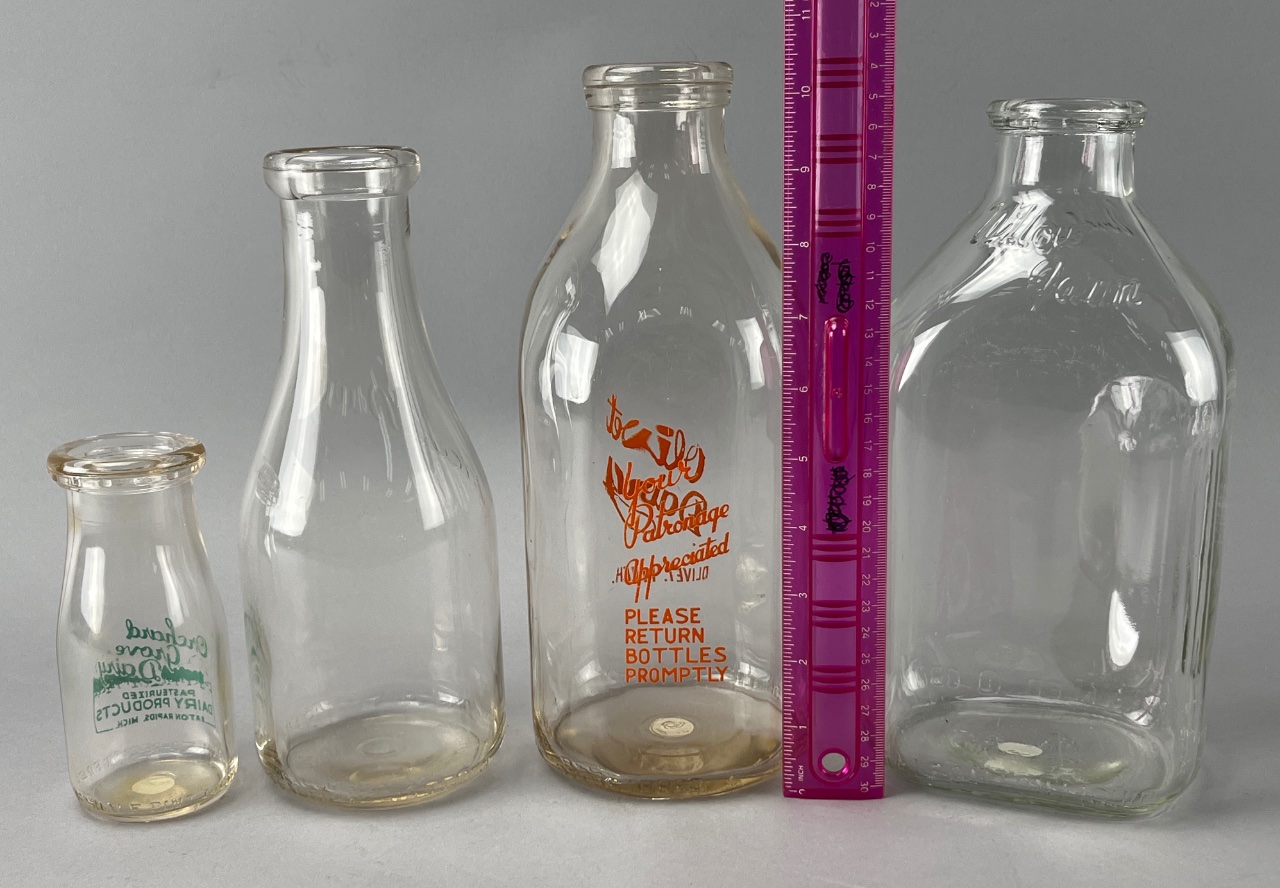 Collection of four vintage glass dairy bottles, each marked with text identifying regional dairies. Includes a small bottle with green printed text reading ‘Orchard Grove Dairy Pasteurized Dairy Products,’ a middle bottle with orange embossed text reading ‘Olivet Dairy,’ and a larger bottle with embossed text reading ‘Hollow Stone’ on the neck. All bottles feature smooth surfaces and rounded necks. Taller bottle is 10.5″H. CONDITION: Some bottles show minor wear and light scratches. No chips or cracks observed. SHIPPING: In-House Shipping Available