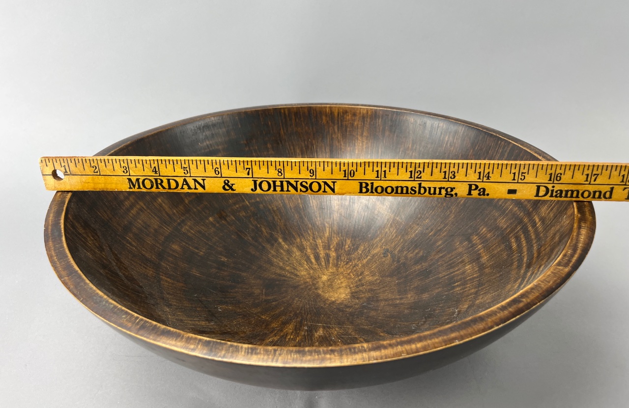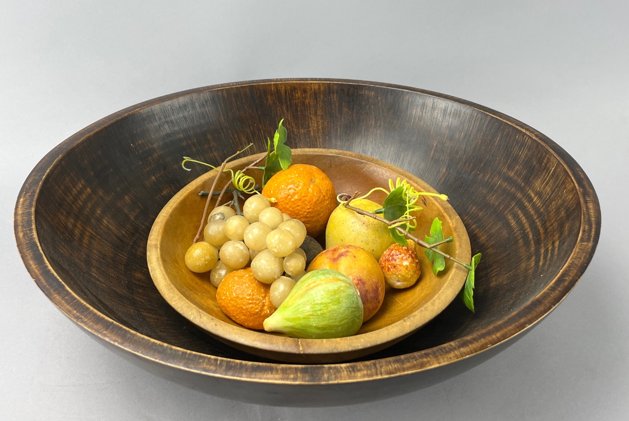 Decorative wooden bowl set featuring a large bowl with a smooth finish and a smaller nested bowl. The smaller bowl contains faux fruit and greenery arranged for display. Cataloger notes confirm the bowl is unmarked and not associated with Mordan & Johnson. Wood bowl measures 17″D. CONDITION: Condition not assessed. SHIPPING: In-House Shipping Available