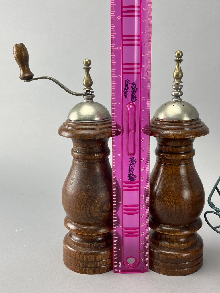 Group lot of kitchen collectibles including two wooden pepper mills with metal tops and crank handles, a green wire basket with a woven base and decorative leaf accents, 3 plant hanger wall hooks, and a wooden grinder with a flat base. Salt and pepper measure 9″H. CONDITION: Condition not assessed. SHIPPING: In-House Shipping Available