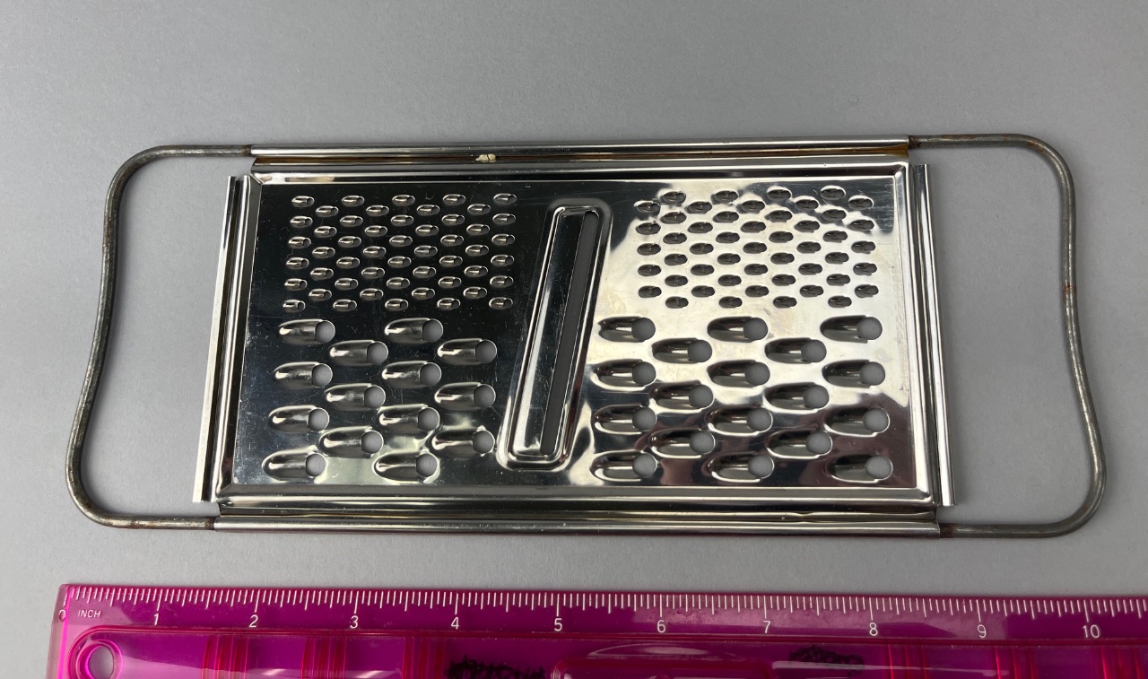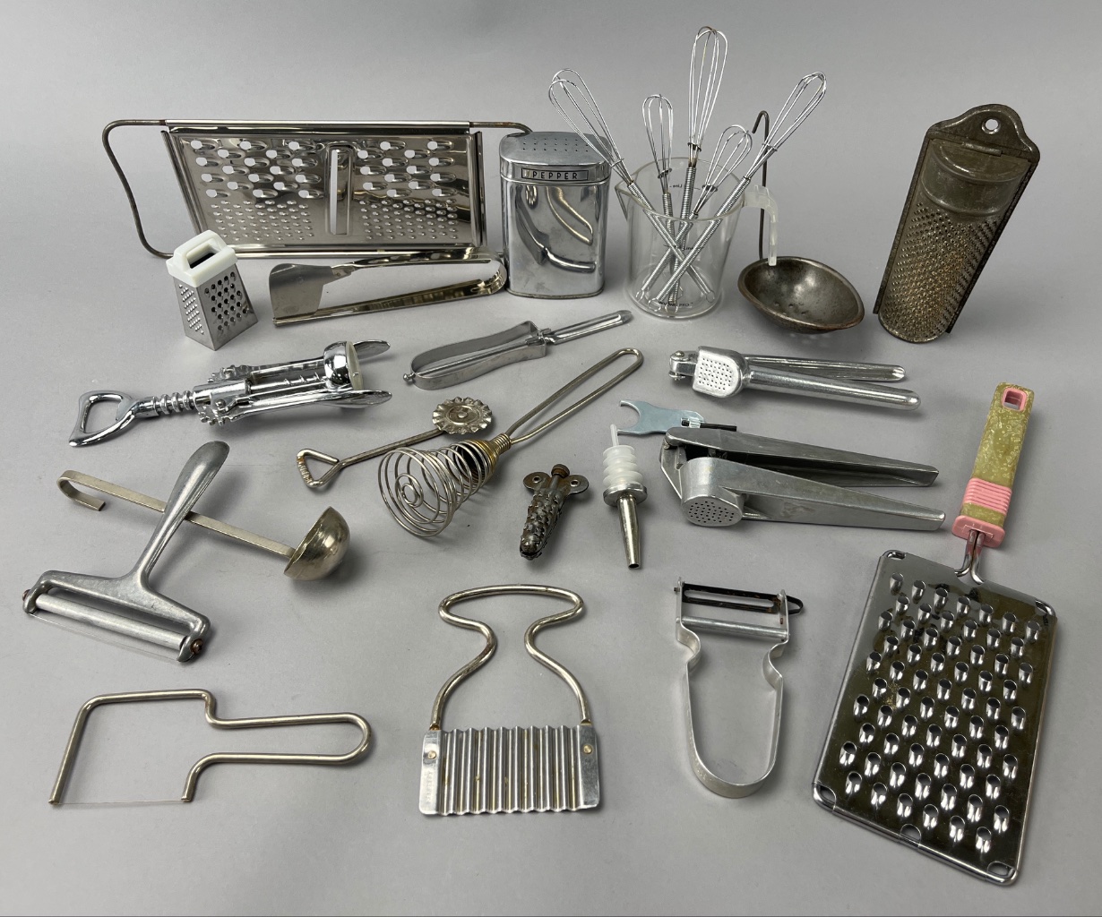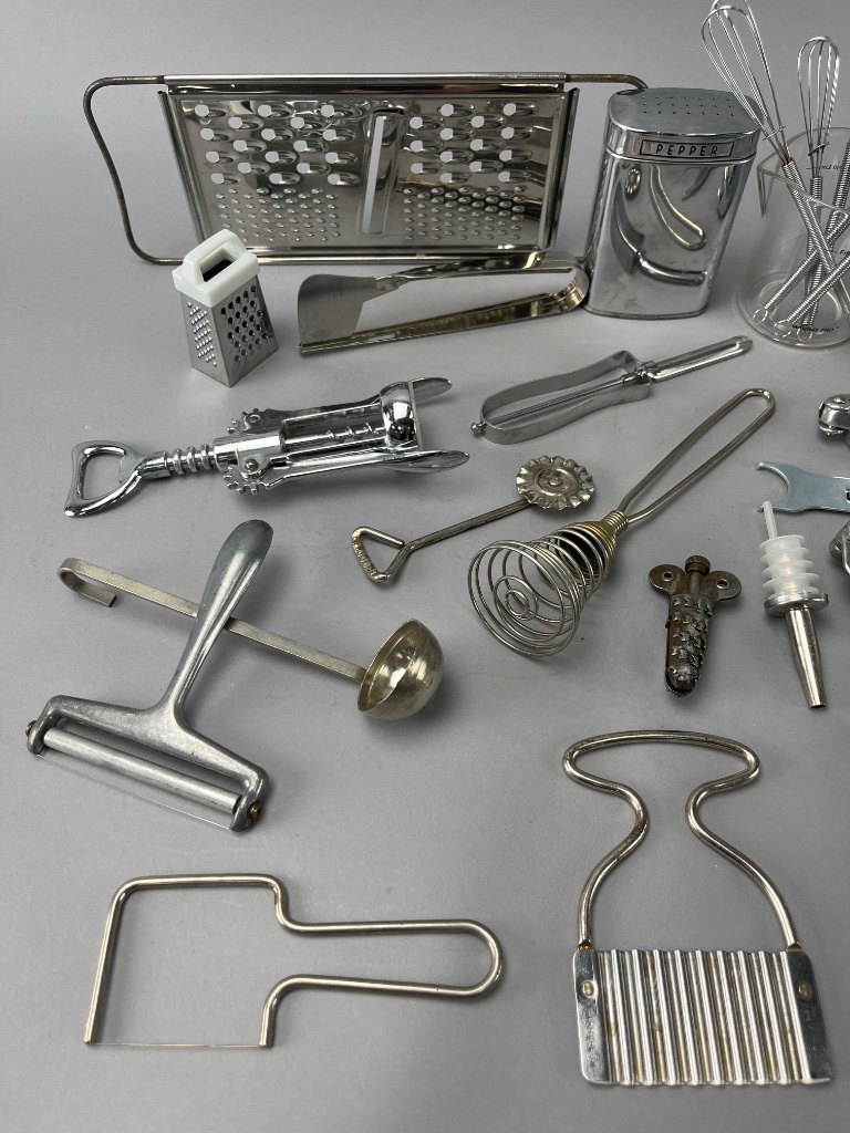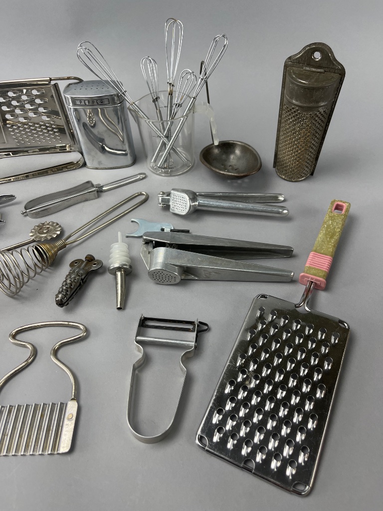 Assortment of metal kitchen utensils and tools, including a grater, pepper shaker labeled ‘PEPPER’, whisks, measuring spoon, corkscrew, rolling pin, potato peeler, food mill, pastry cutter, ladle, can opener, measuring cup, spatula, pastry blender, and zester. Items show signs of wear and tarnishing. CONDITION: Some items show signs of wear and tarnishing. Grater has a few scratches on the surface. SHIPPING: In-House Shipping Available
