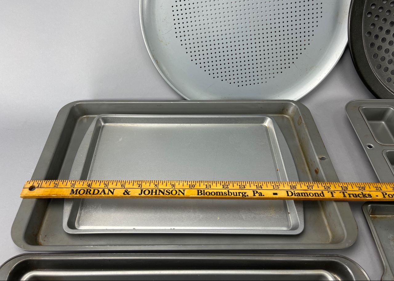 Group of assorted metal baking pans, including one round perforated pizza pan with a silver finish, one round dark metal pizza pan with a perforated design, two rectangular baking sheets with a silver finish, one rectangular baking pan with a handle, and one rectangular baking tray with multiple compartments. Larger sheet pan measures 17″. CONDITION: Some surface staining and discoloration on the baking sheets. SHIPPING: In-House Shipping Available