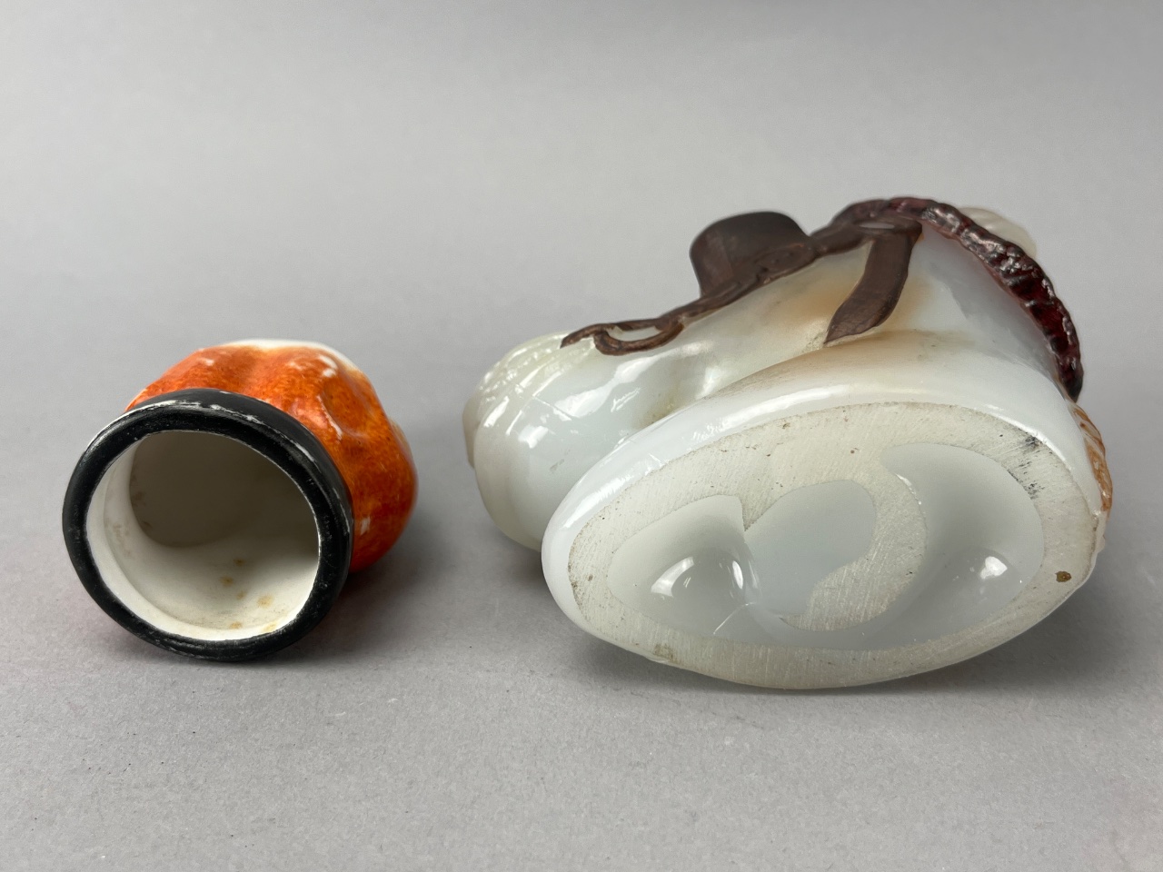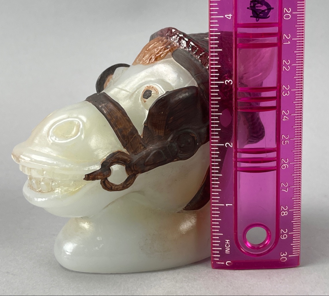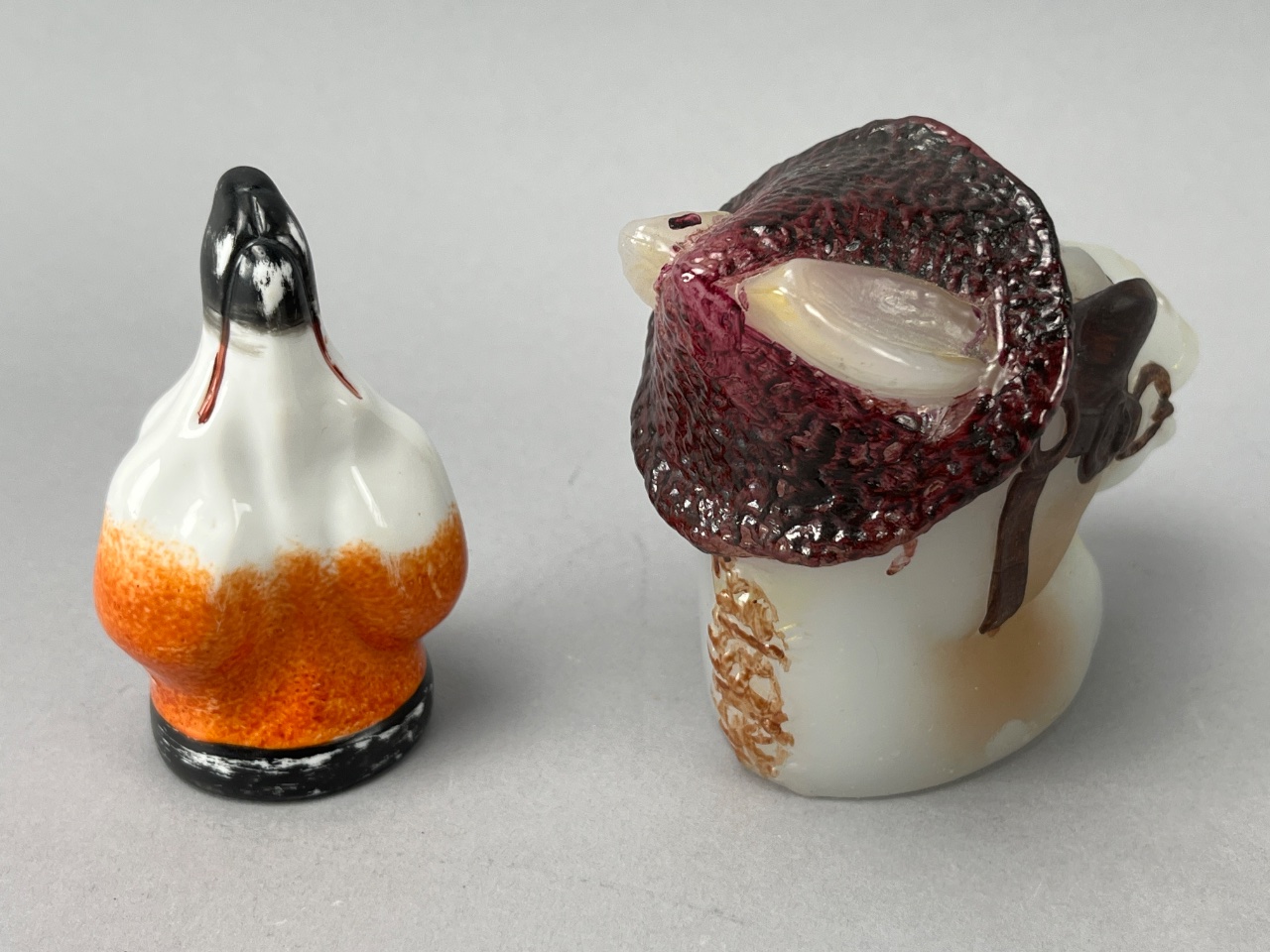 Group lot of two figurines, including a Donkey head figurine with red and brown bridle details and a smooth glossy surface, and a Staffordshire like Fox Stirrup cup figure with painted orange and white details on a textured surface. Both figurines feature distinct bases: the Donkey figurine has a flat, smooth base, while the Fox figurine has a black circular base. Measures 4″H. CONDITION: Condition not assessed. SHIPPING: In-House Shipping Available